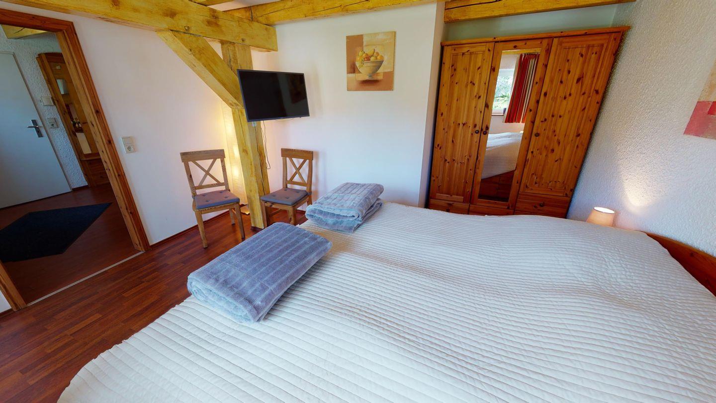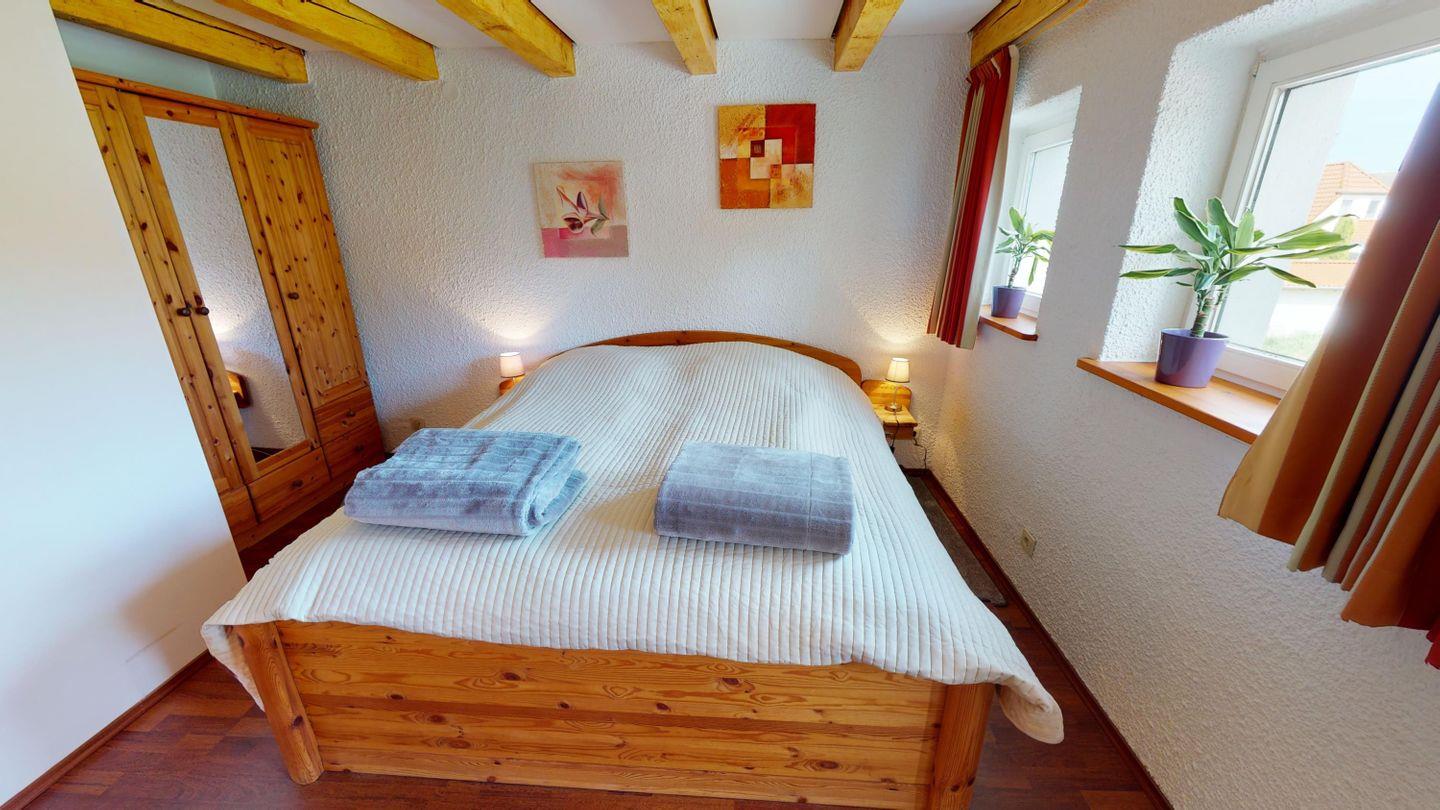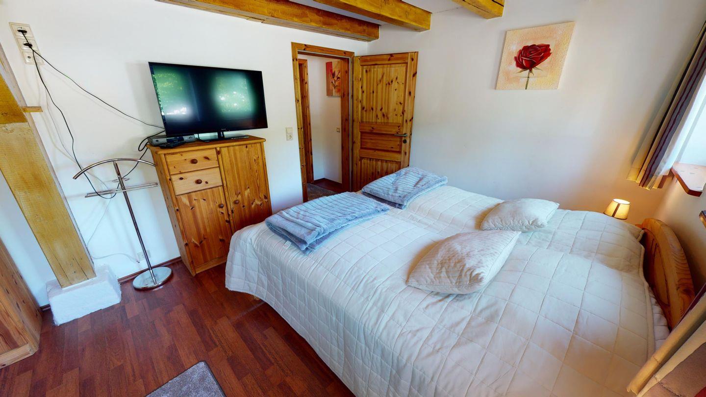 Im Erdgeschoss erwarten dich zwei gemütliche Schlafzimmer, jeweils mit einem Doppelbett ausgestattet. In einem davon steht zusätzlich ein Gitterbett für die Kleinsten bereit. Ein besonderes Highlight ist die kleine Sitzecke mit Fensterfront – von dort aus blickst du direkt auf das Wasser, das aus dem alten Mühlkanal unter den Fenstern hindurchfließt. Das Badezimmer auf dieser Etage verfügt über eine Dusche und ein WC.