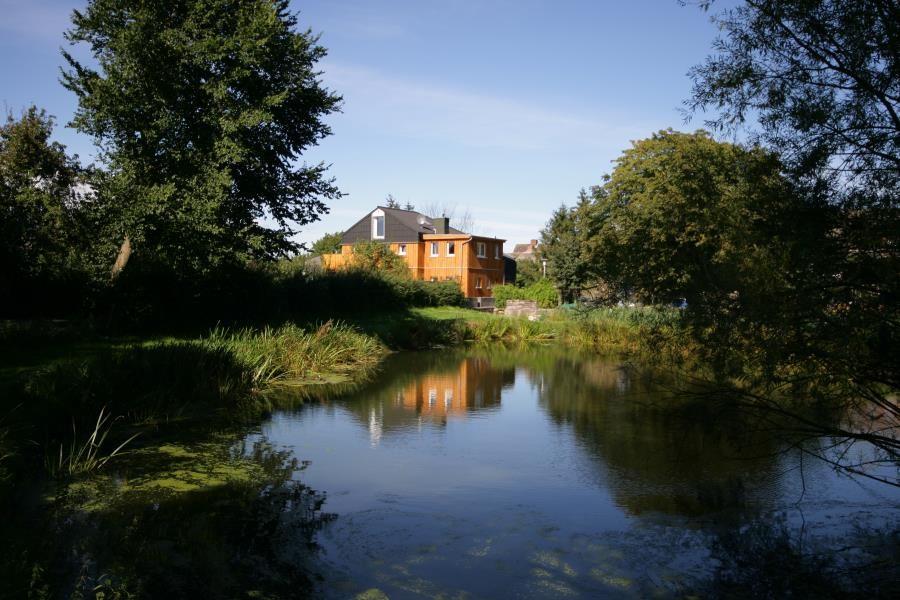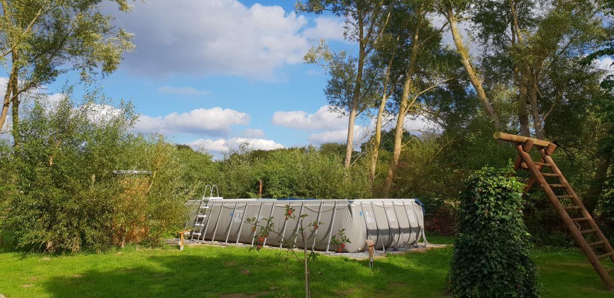 Das Besondere an der Mühle ist nicht nur die Wohnung selbst, sondern das, was sie umgibt: ein großes, naturbelassenes Grundstück mit Bachlauf, kleinem See und weiten Grünflächen. Hier findest du Plätze zum Zurückziehen, zum Sonnen, zum Lesen, zum Grillen oder einfach, um den Moment zu genießen. Wenn du die Augen offen hältst, kannst du Wildgänse, Fischreiher oder mit etwas Glück sogar einen Eisvogel beobachten. In den Sommermonaten sorgt der Außenpool für Abkühlung (Mai - Sept.) und wer es wärmer mag, entspannt in der Fass-Sauna oder im Hot-Tub. Wenn du abends noch zusammensitzen möchtest, stehen dir sowohl eine Grillkota als auch ein klassischer Grillplatz zur Verfügung.