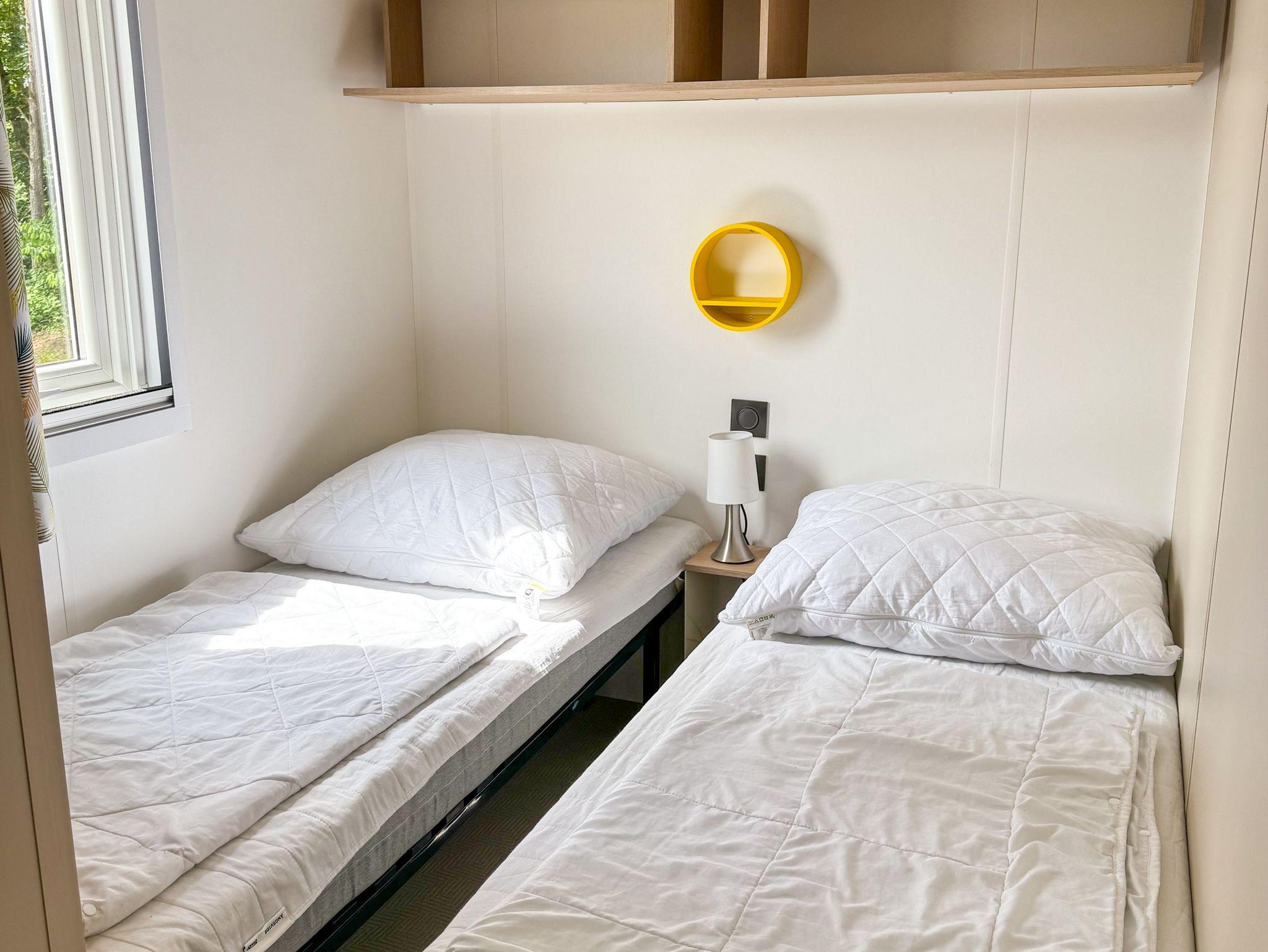 Die komfortabel eingerichteten mobilen Ferienhäuser befinden sich in dem Camping- und Ferienpark in Lychen direkt am Strandbad des Großen Lychensees. Von den Ferienhäusern haben Sie einen direkten Zugang zum Wasser. Die Mobilheime liegen im Hang, mit einem ruhigen Blick über Felder und Natur. Die Mobilheime sind mit zwei Schlafzimmern, eines mit französischem Doppelbett (160x200) und eines mit zwei Einzelbetten (80x190), einer komplett ausgestatteten Küche, Wohnraum mit TV/Radio und einem Bad mit Dusche und separater Toilette ausgestattet. Sie können den Sonnenuntergang von der integrierten Terrasse genießen.