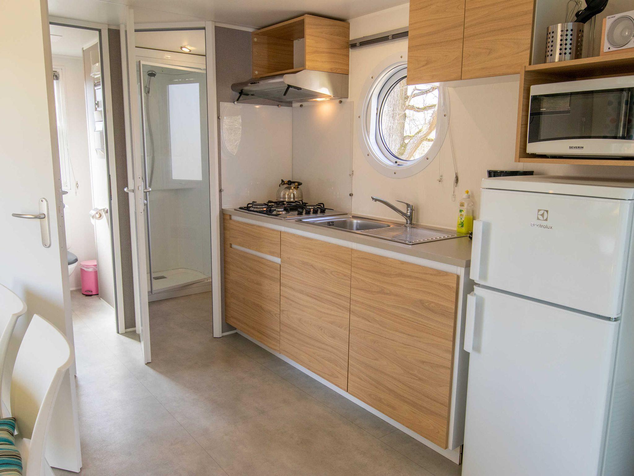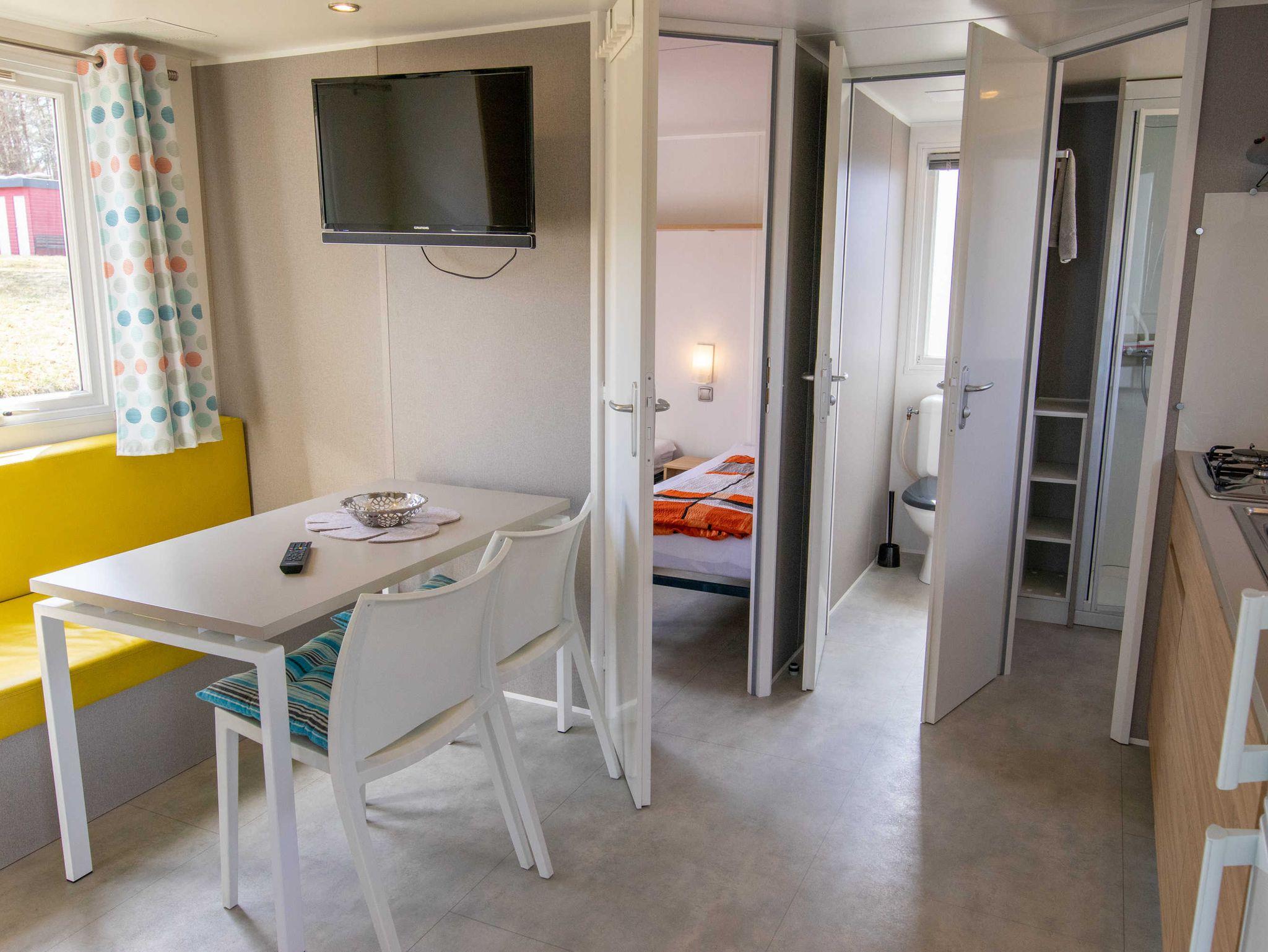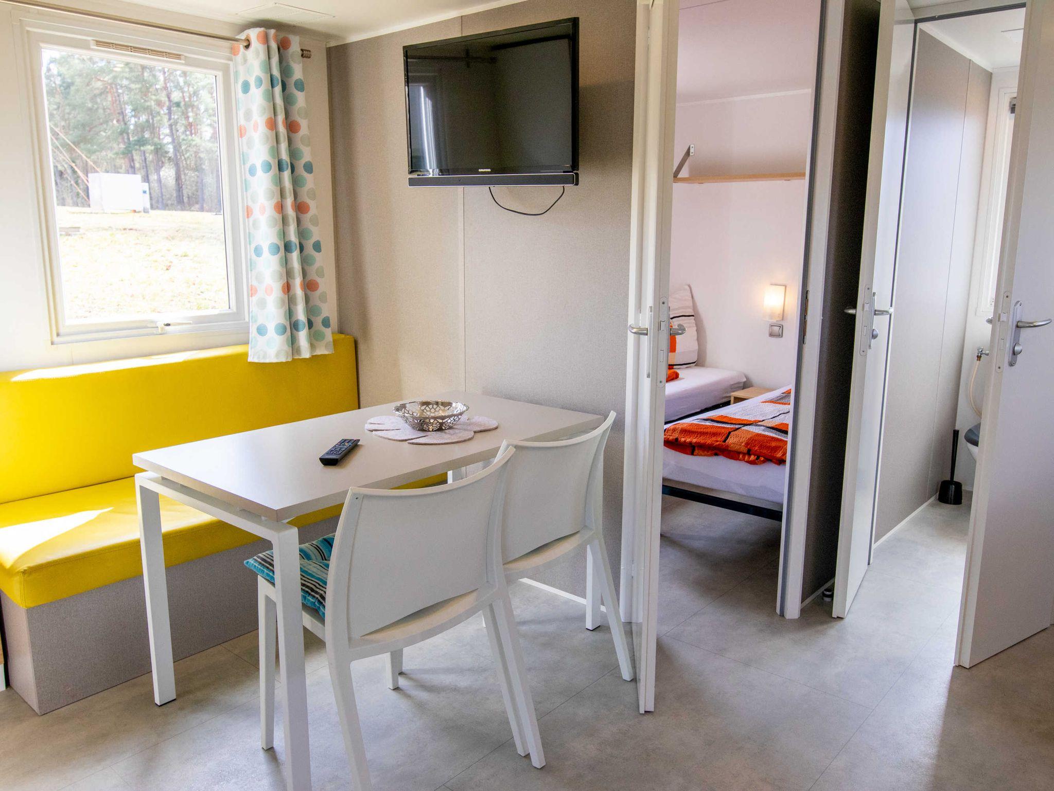 Das Mobilheim ist mit zwei Schlafzimmern, eines mit französischem Doppelbett (140x200) und eines mit zwei Einzelbetten (80x190), einer komplett ausgestatteten Küche, Wohnraum mit TV und einem Bad mit Dusche und separater Toilette ausgestattet. Sie können den Sonnenuntergang von der integrierten Terrasse genießen.