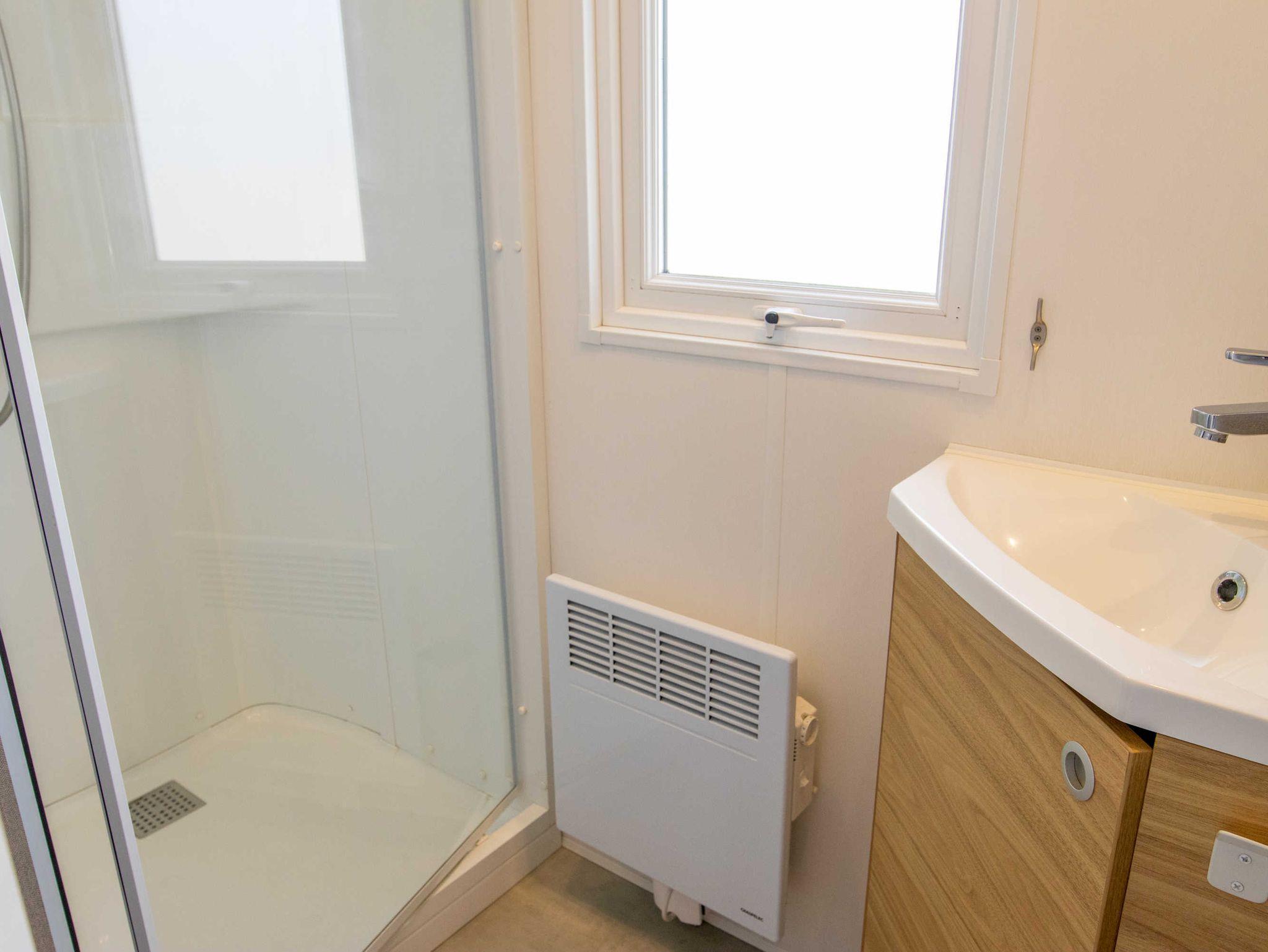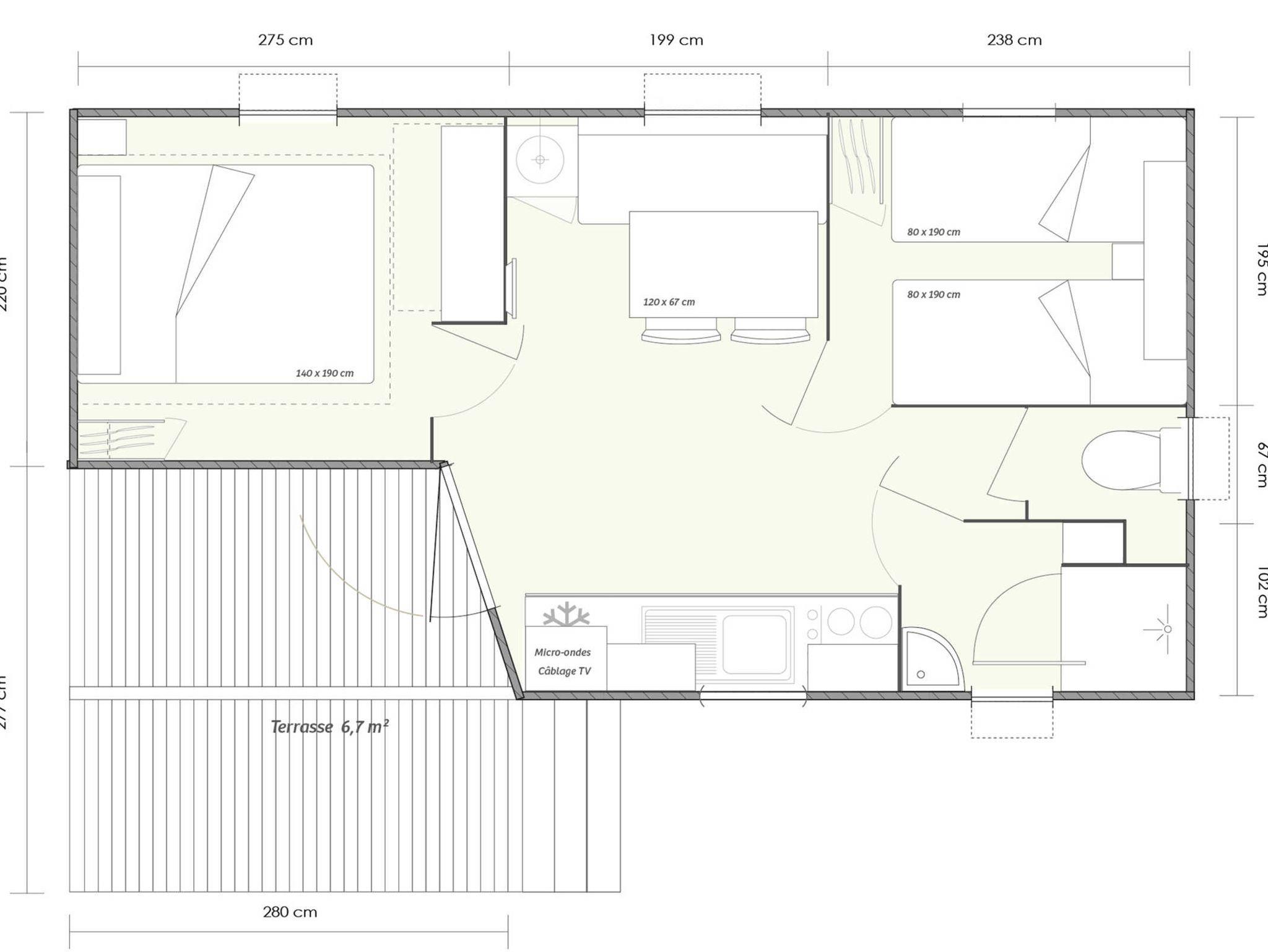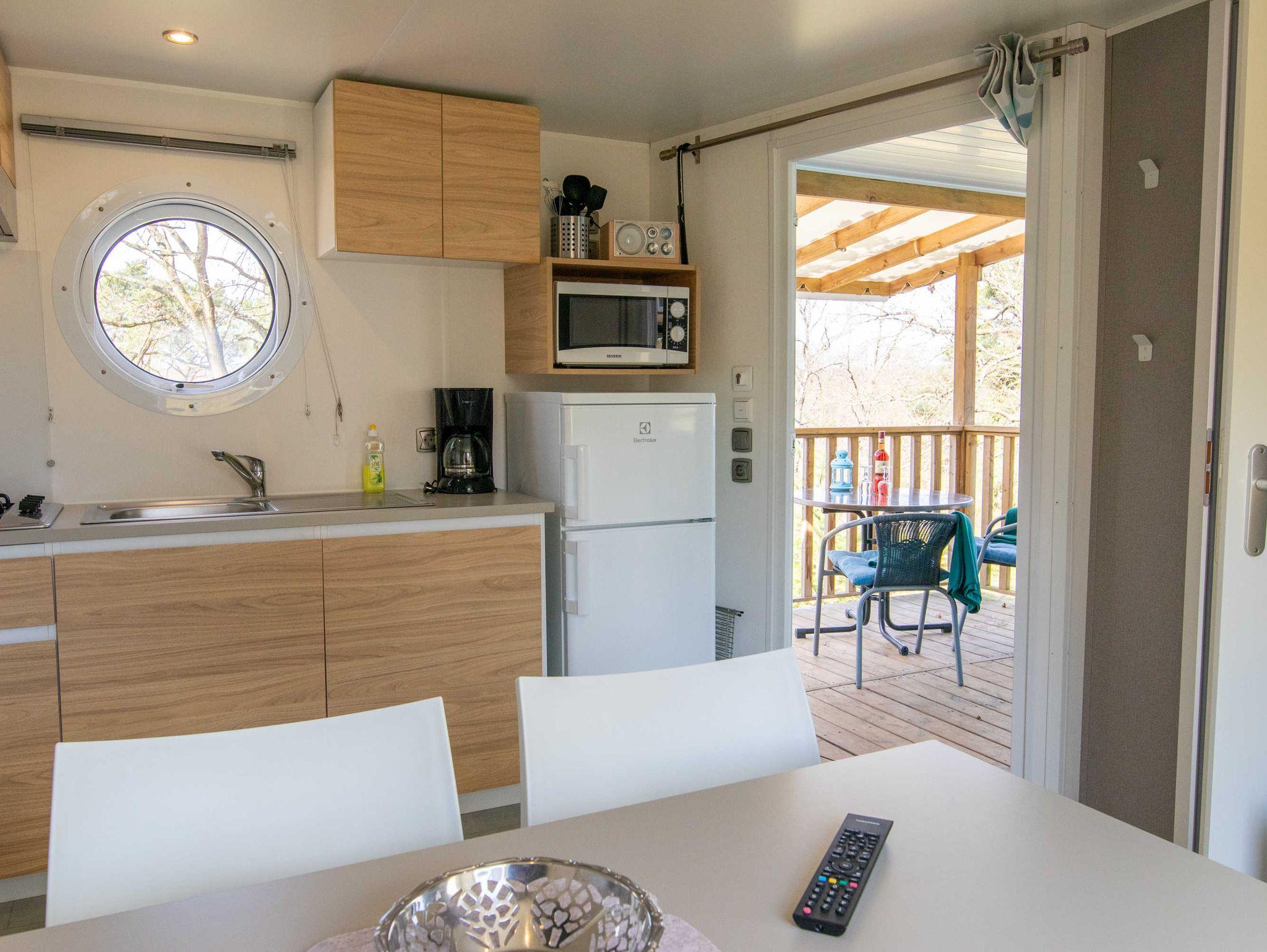 Das Mobilheim ist mit zwei Schlafzimmern, eines mit französischem Doppelbett (140x200) und eines mit zwei Einzelbetten (80x190), einer komplett ausgestatteten Küche, Wohnraum mit TV und einem Bad mit Dusche und separater Toilette ausgestattet. Sie können den Sonnenuntergang von der integrierten Terrasse genießen.
