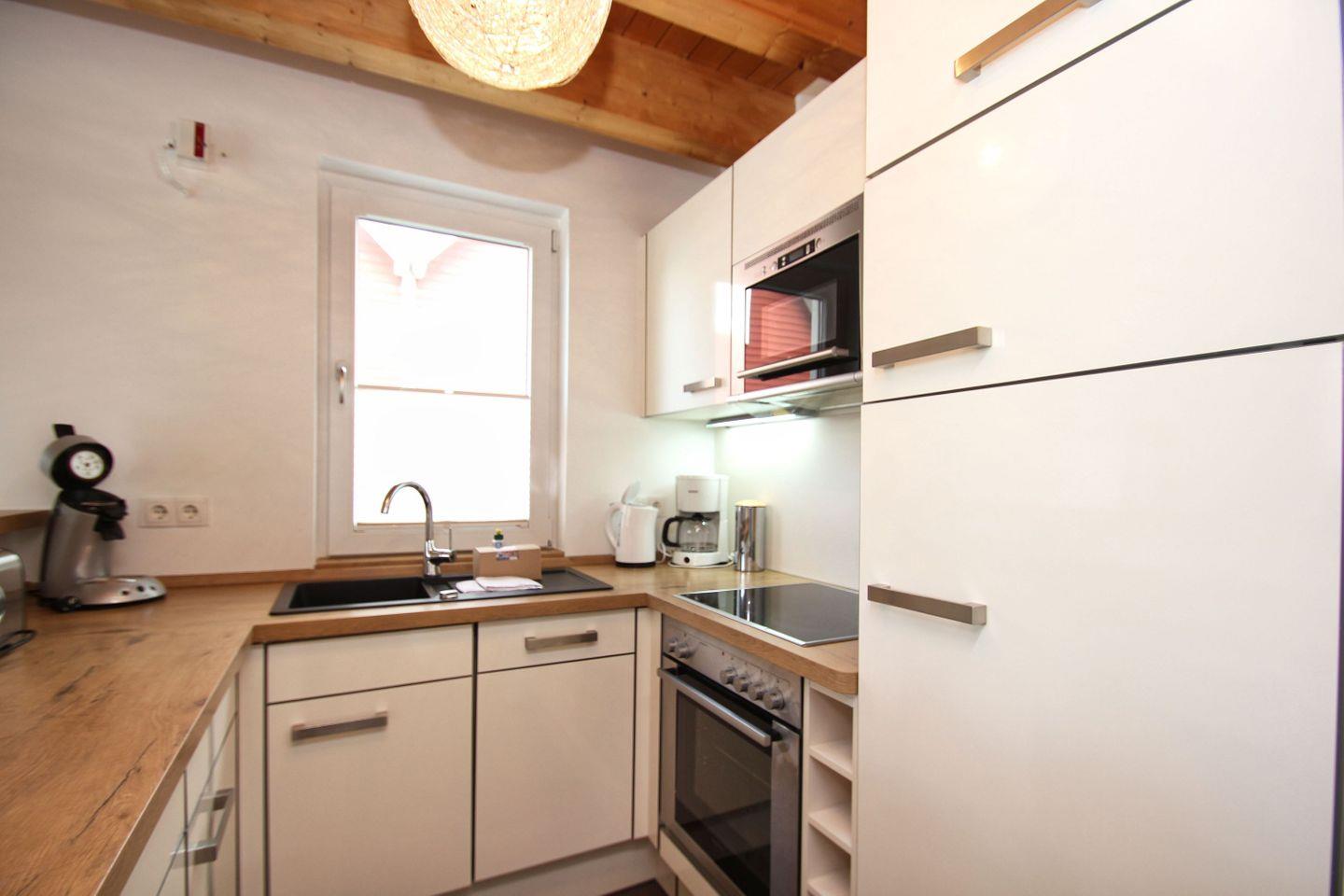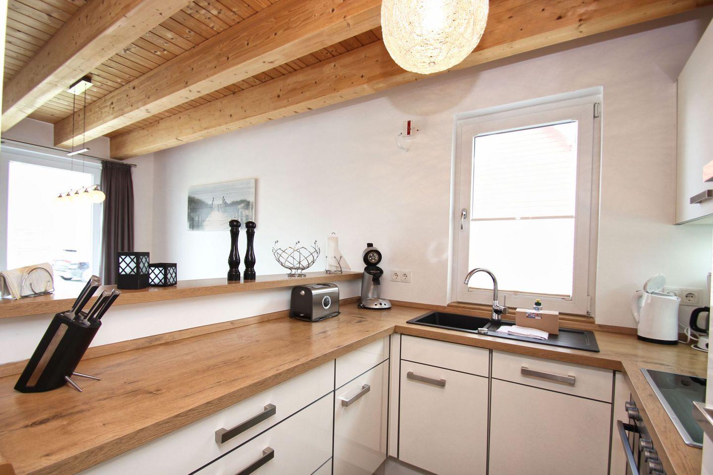 KÜCHE // offene vollausgestattete Küche, Mikrowelle, Backofen, Geschirrspüler, Kühlschrank mit Gefrierfach, Toaster, Wasserkocher, Kaffeemaschine, reichlich Besteck, Geschirr und Küchenutensilien ++