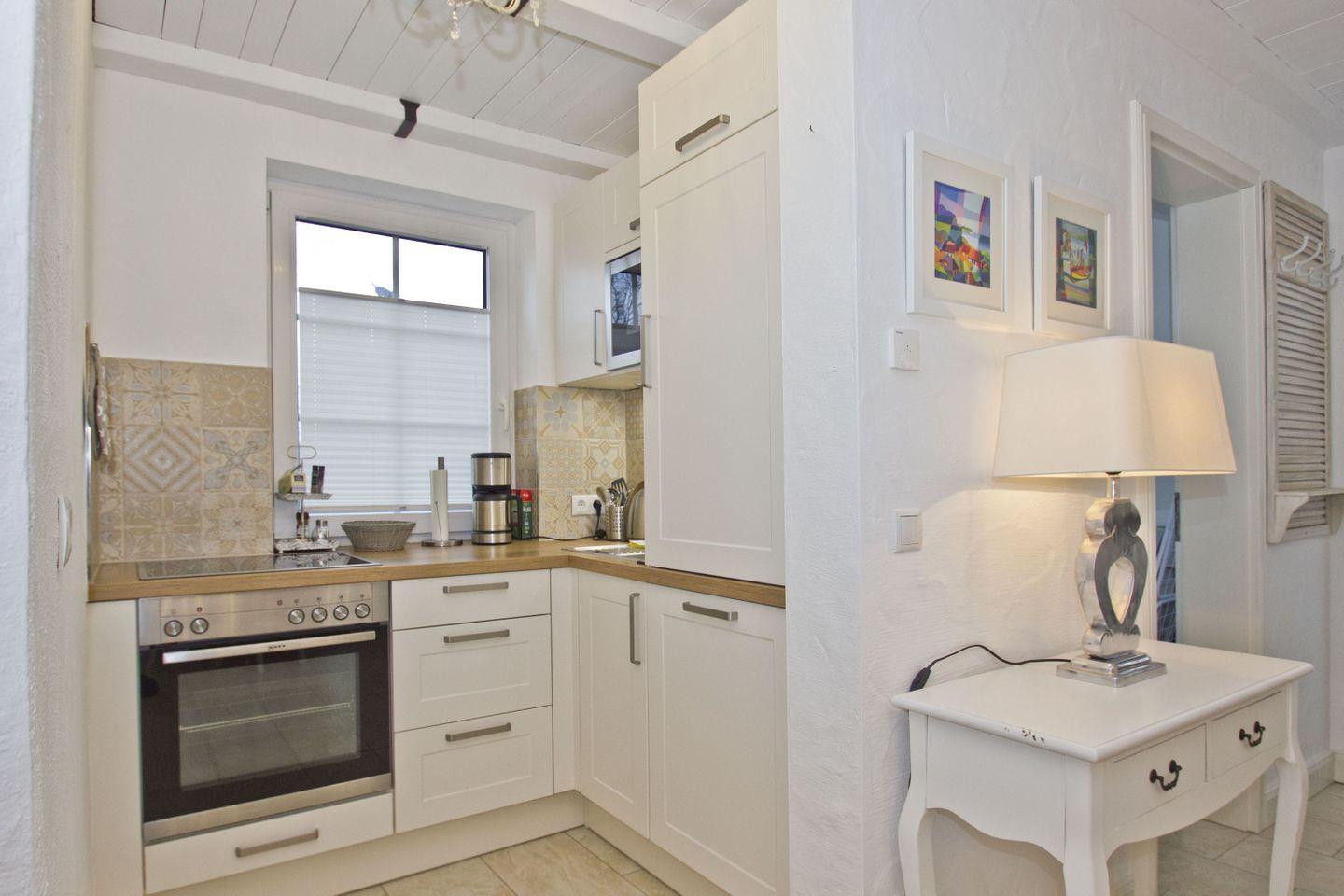 KÜCHE // offene Küche, 4-Platten Ceranherd, Kühlschrank mit Gefrierfach, Backofen, Mikrowelle, Toaster, Wasserkocher, Kaffeemaschine, reichlich Besteck, Geschirr und Küchenutensilien ++