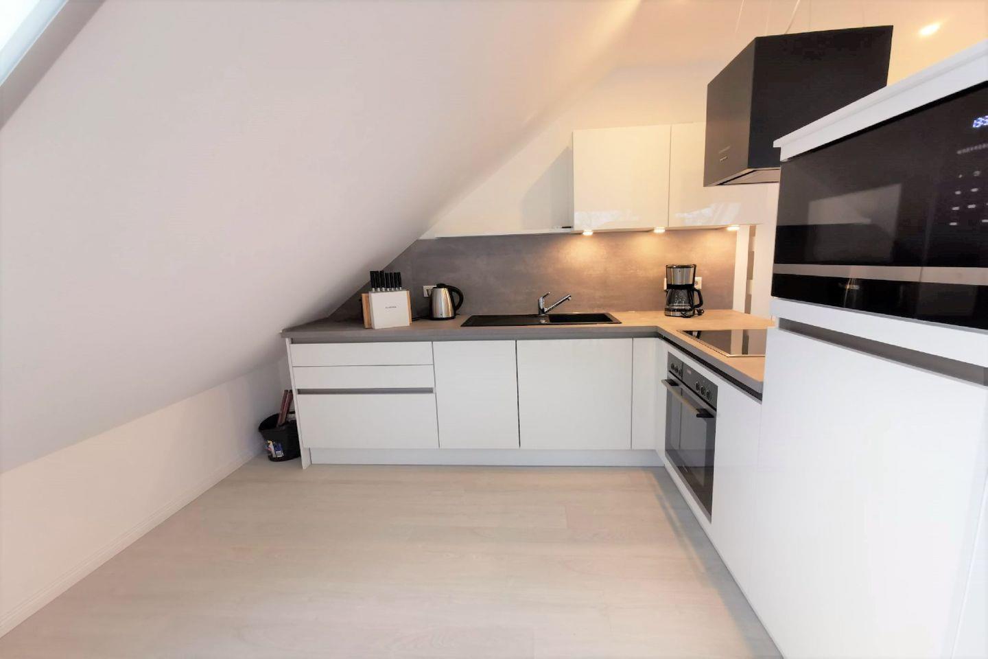 KÜCHE // Küchenzeile, Ceranherd, Spülmaschine, Kühlschrank mit Gefrierfach, Mikrowelle, Toaster, Wasserkocher, Kaffeemaschine, reichlich Besteck, Geschirr und Küchenutensilien ++