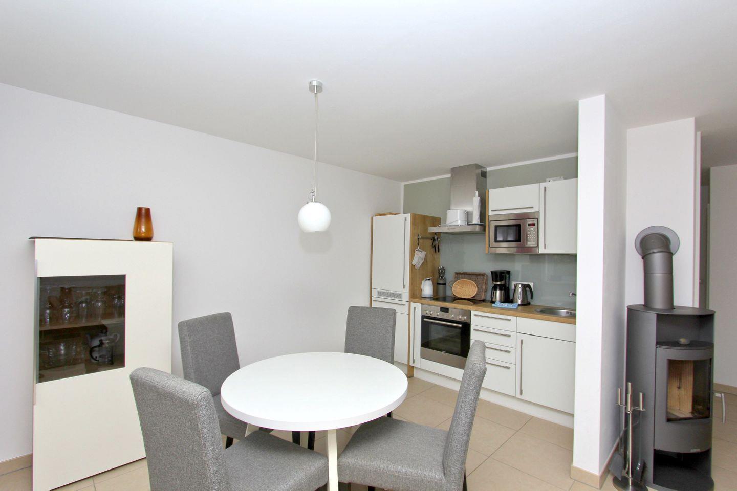 KÜCHE // Küchenzeile, 4-Platten Ceranherd, Spülmaschine, Kühlschrank mit Gefrierfach, Backofen, Mikrowelle, Toaster, Wasserkocher, Kaffeemaschine, reichlich Besteck, Geschirr und Küchenutensilien ++