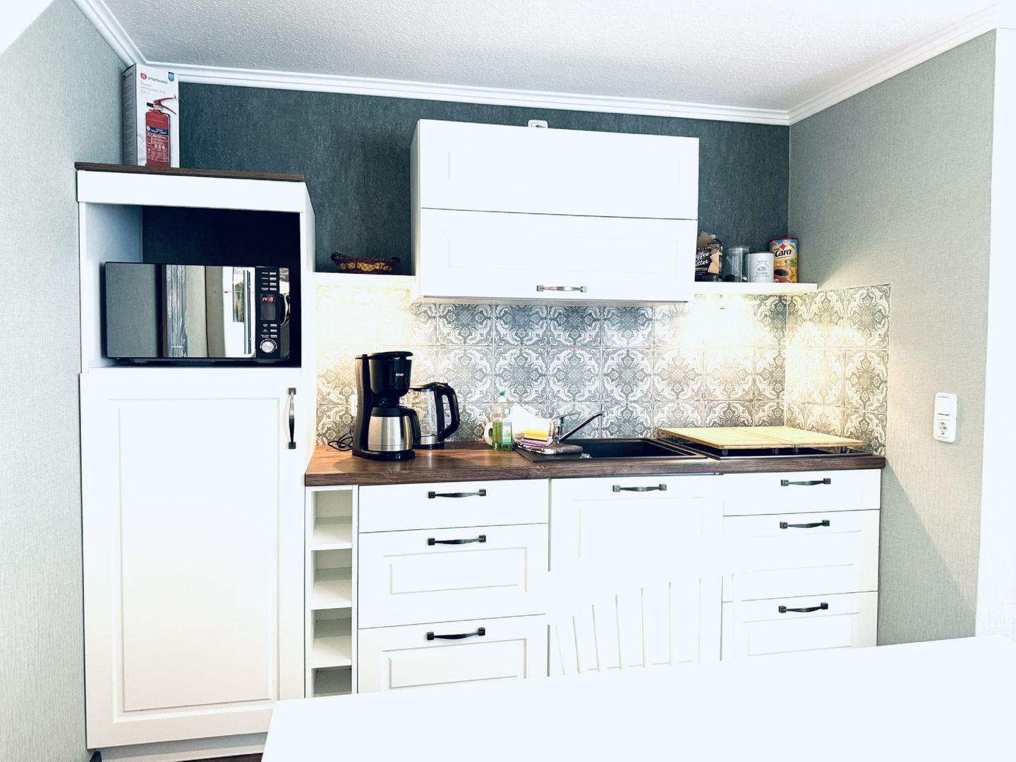 KÜCHE // offene Küche, 4-Platten Ceranfeld, Kühlschrank, Toaster, Wasserkocher, Kaffeemaschine, reichlich Besteck, Geschirr und Küchenutensilien ++