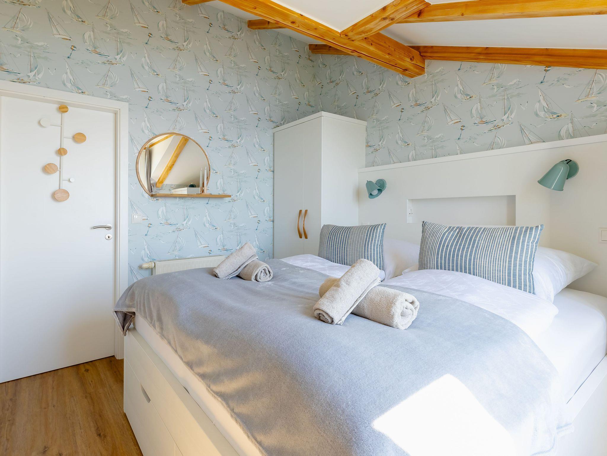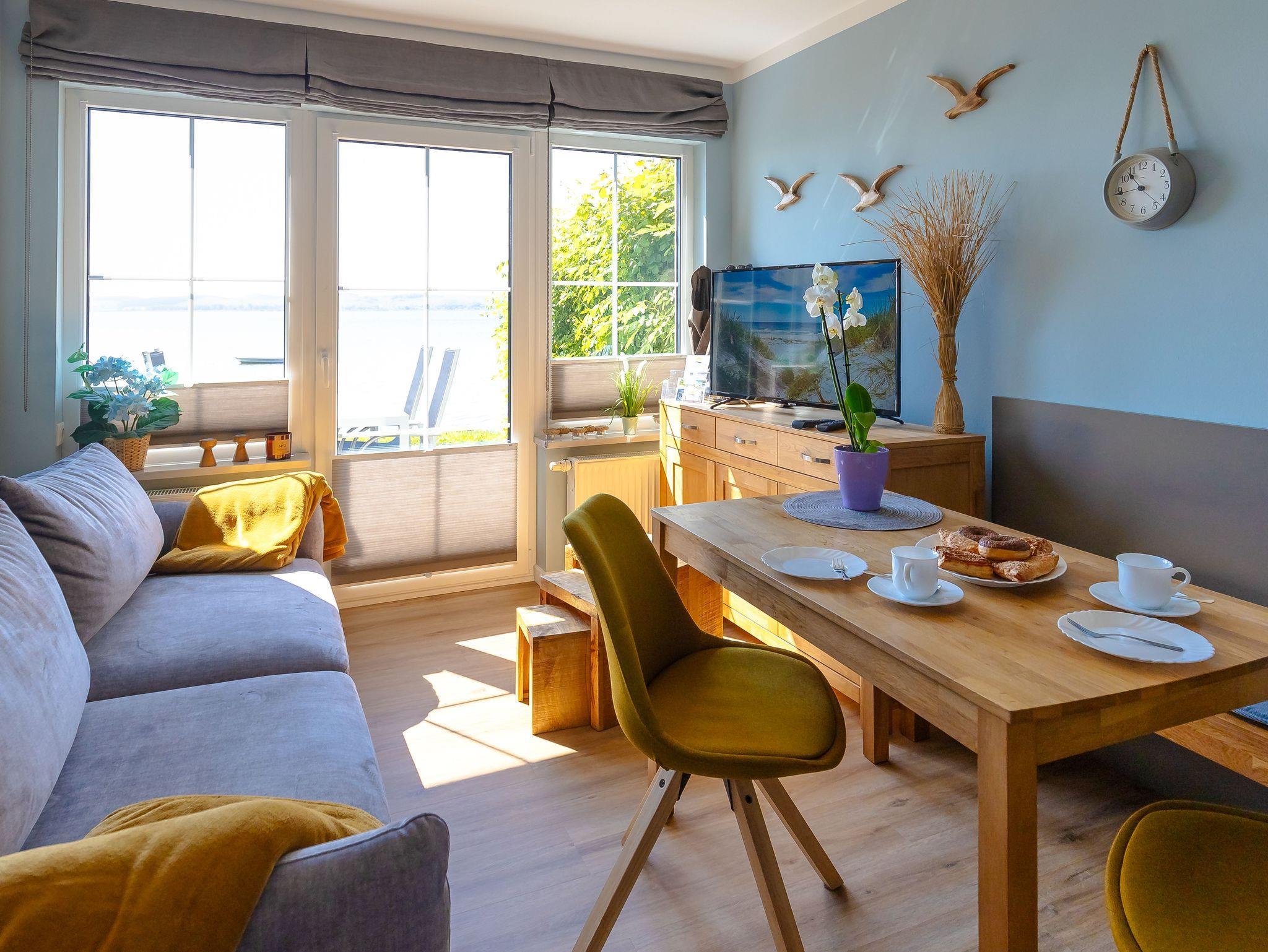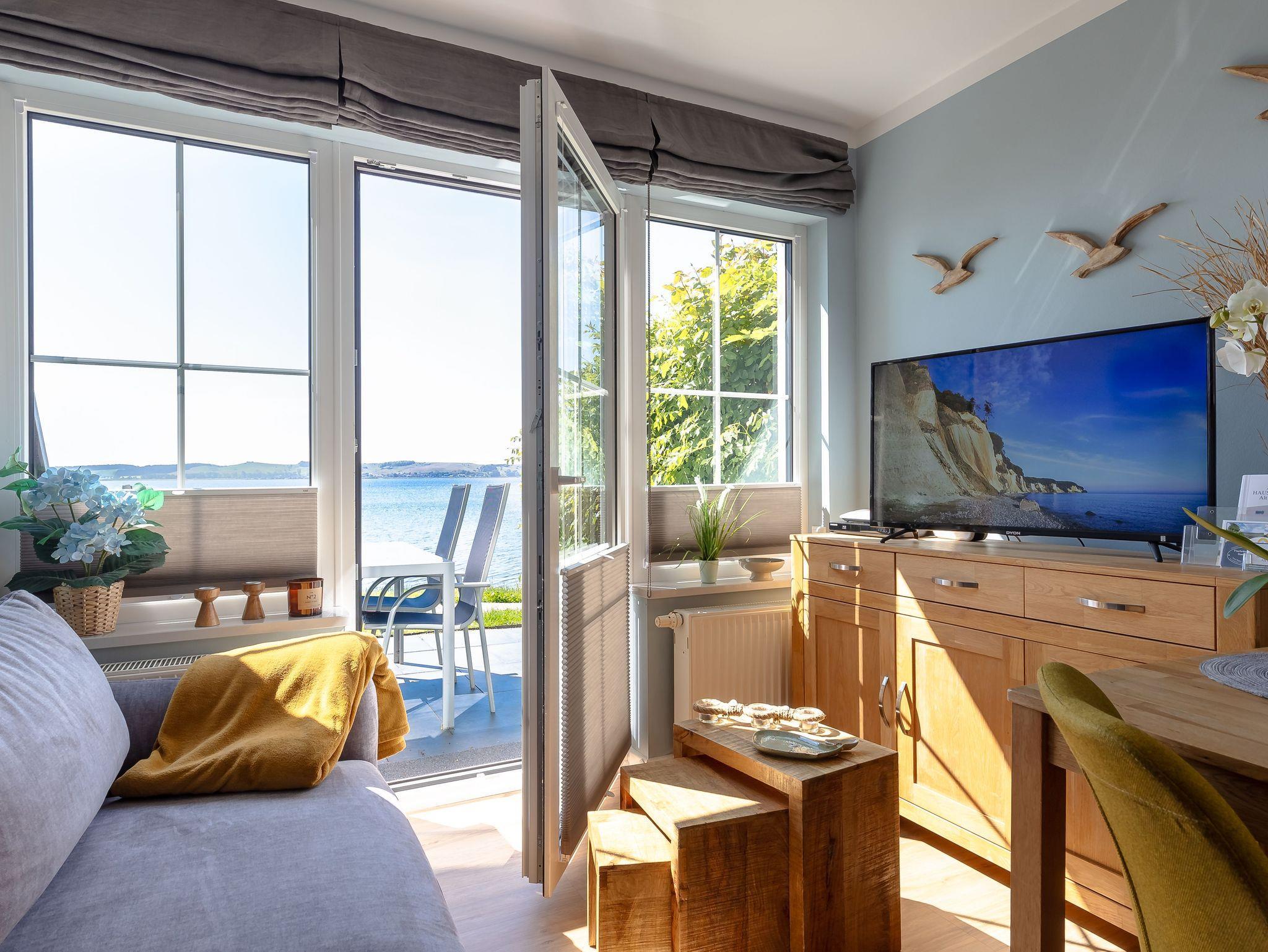 Die modern und liebevoll eingerichtete Wohnung 3 im Haus Seeblick im Maisonette-Stil verfügt über eine sonnige Terrasse mit offenem Seeblick, zwei separate Schlafbereichen im Obergeschoss, sowie einem hellen Wohnbereich mit offener Küchenzeile. Sie umfasst ca. 42qm. Genießen Sie einen unverwechselbaren Seeblick ? direkt beim Aufstehen! Der komfortable Wohnbereich mit Couch + Couchtisch, einen Sessel, einer Stehlampe, eine Kommode mit Flachbild-TV sowie eine Vitrine bietet Ihnen einen gemütlichen Ort zum Ausklingen der erlebnisreichen Tage auf der Halbinsel Mönchgut. Von hier aus gelangen Sie auf die sonnige und bestuhlte Terrasse (Süden) mit Sonnenschirm und einem einzigartigen Seeblick. Angrenzend befindet sich eine offene und voll ausgestattete Küchenzeile mit Spülmaschine, Kühlschrank mit Eisfach, Dunstabzugshaube, Wasserkocher, Kaffeemaschine, Nespresso Maschine, Toaster, Induktionsfeld und Mikrowelle und ein Essplatz. Im Obergeschoss befinden sich die beiden Schlafräume, die jeweils mit einem komfortablen Doppelbett (1,80m x 2,00m) und Kleiderschrank ausgestattet sind. Auf der unteren Ebene befindet sich das freundliche Tageslicht-Bad mit einer ebenerdigen Dusche, ein WC, ein Fön sowie ein Waschplatz mit dazugehörigem Spiegel. Für unsere kleinen Gäste steht ein Hochstuhl sowie ein Kinderreisebett (ohne Bett Inlett/inkl. Matratze) zur Verfügung. Auch ein 4-Beiner ist mit seinem eigenen Schlafplatz gegen eine Gebühr ein gern gesehener Gast. Eine Fahrrad-Unterstellmöglichkeit steht Ihnen und allen Gästen des Hauses zur gemeinschaftlichen Nutzung kostenfrei zur Verfügung. Ihr PKW-Stellplatz befindet sich knapp 100m vom Haus entfernt und ist für Sie inklusive. Die Erstausstattung eines Wäschepaketes (komplette Bettwäsche, 1 Duschhandtuch, 2 kleine Handtücher) können Sie bis 14 Tage vor Anreise gegen einen Aufpreis dazu buchen oder durch eigene ergänzen. Ab 2 gebuchten Paketen erhalten Sie einmalig 1 Geschirrhandtuch und 1 Duschvorleger hinzu.