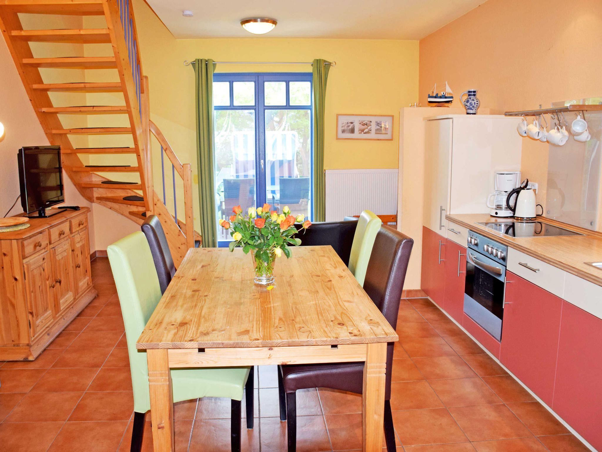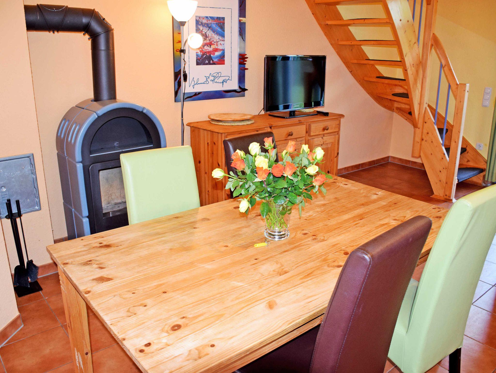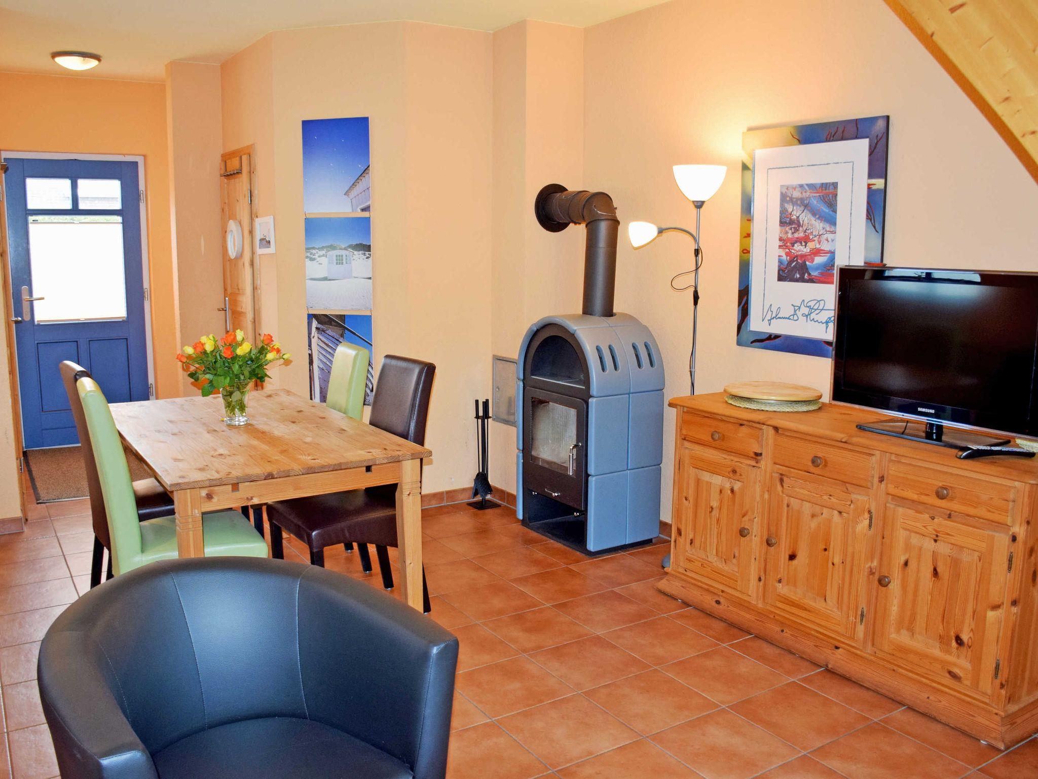 Im Erdgeschoss befinden sich ein Wohn- und Essbereich mit moderner Einbauküche, einem Esstisch mit Stühlen sowie einer Couchgarnitur, modern. Flachbild-TV und Radio. Ein Kaminofen im Wohnbereich verbreitet besonders in der kalten Jahreszeit nach einem Strandspaziergang eine besonders behagliche Atmosphäre.