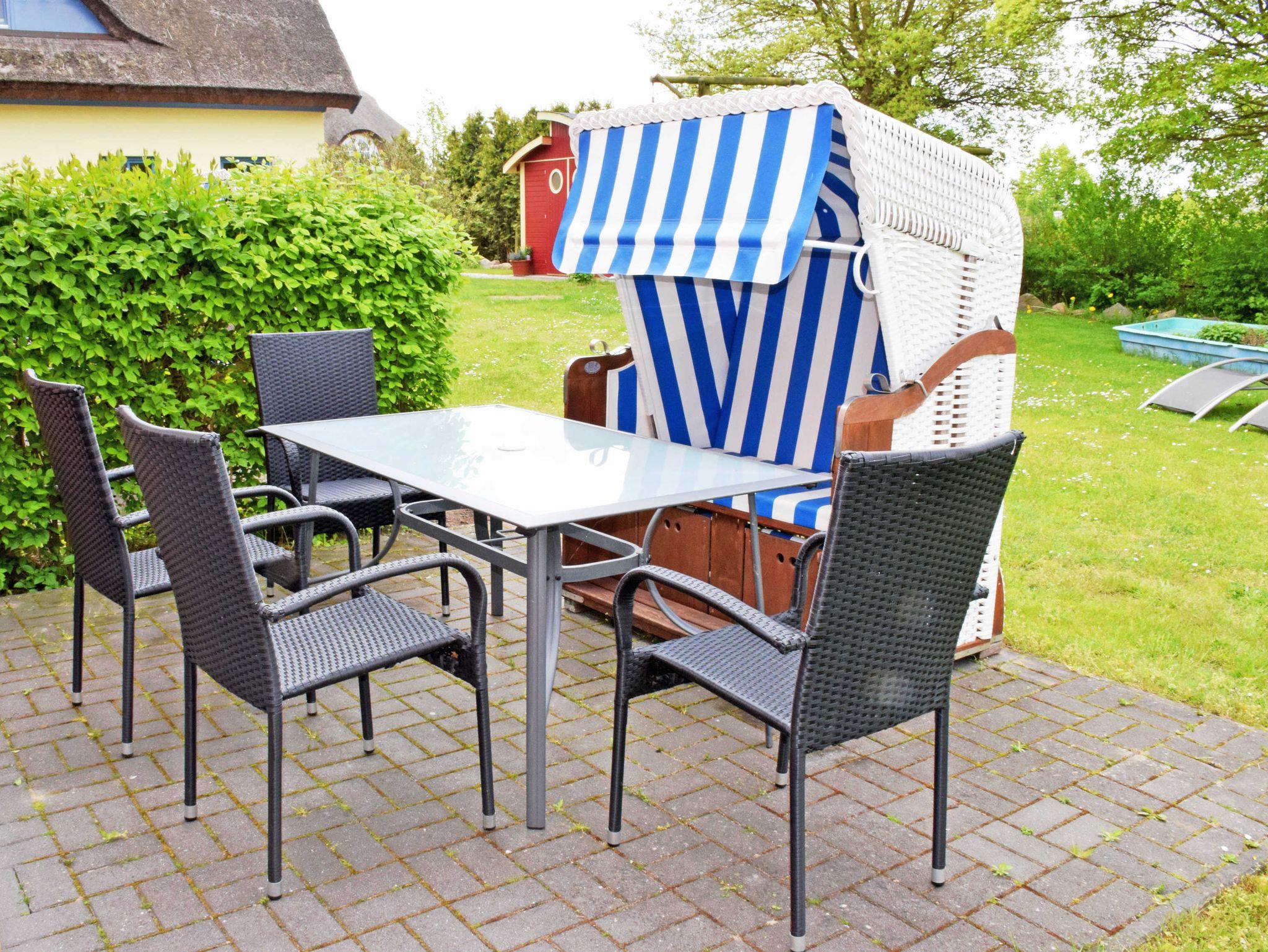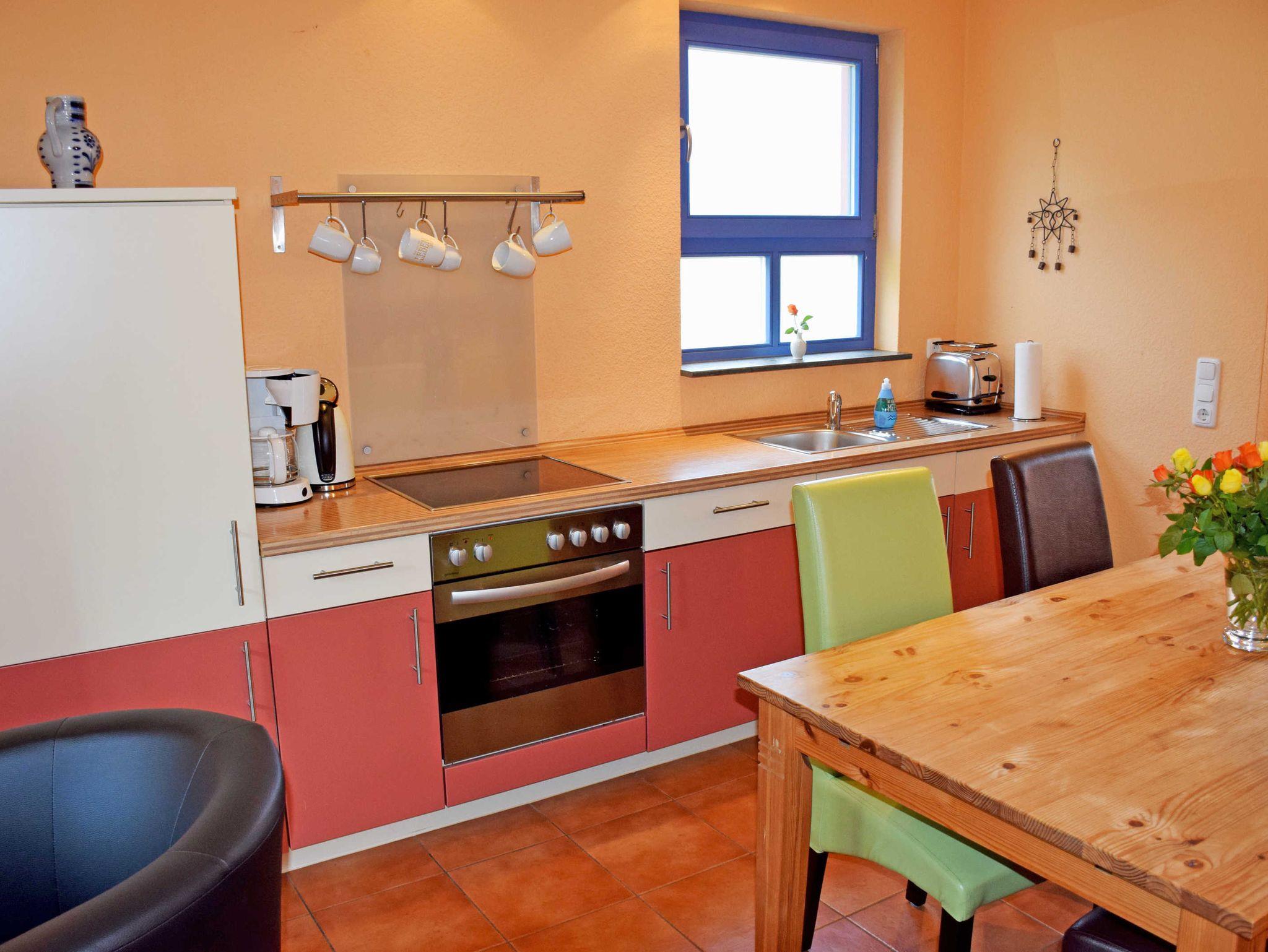 Die moderne Küchenzeile ist mit Herd, Backofen, Kaffeemaschine, Toaster, Wasserkocher und Kühlschrank komplett ausgestattet. Vom Wohnbereich aus gelangt man auf die Terrasse mit Gartenmöbeln, Strandkorb und in den Gemeinschaftsgarten.