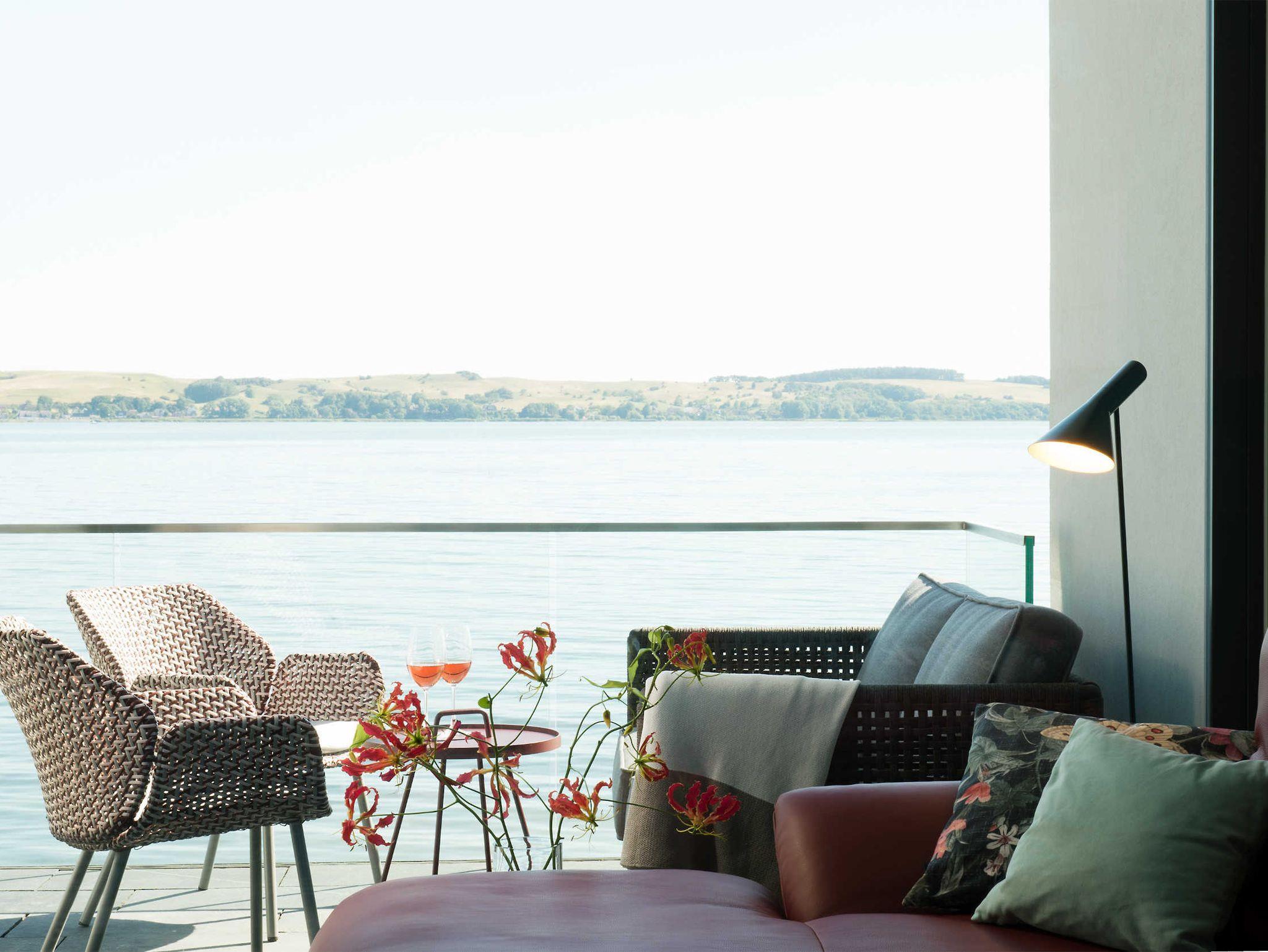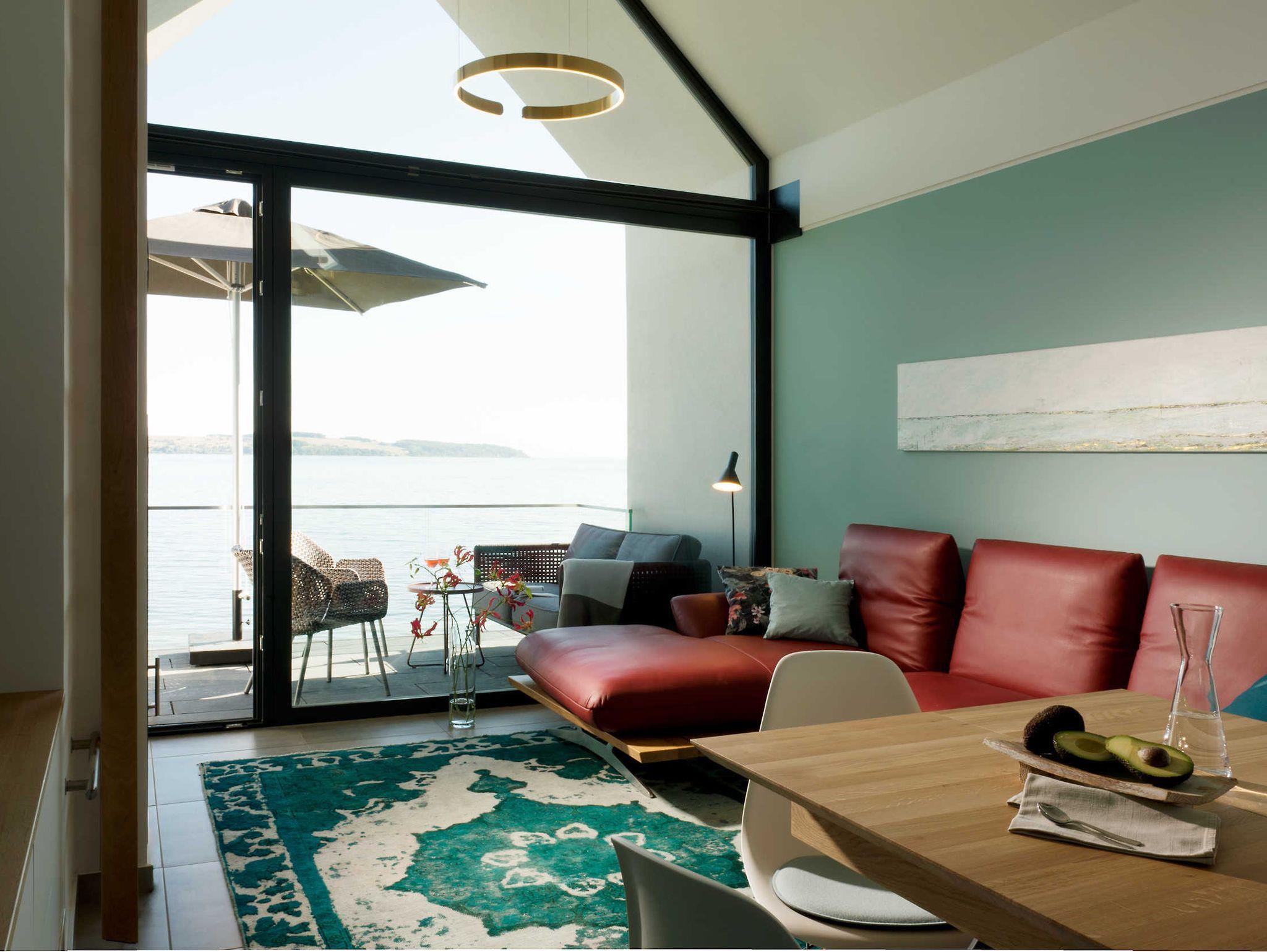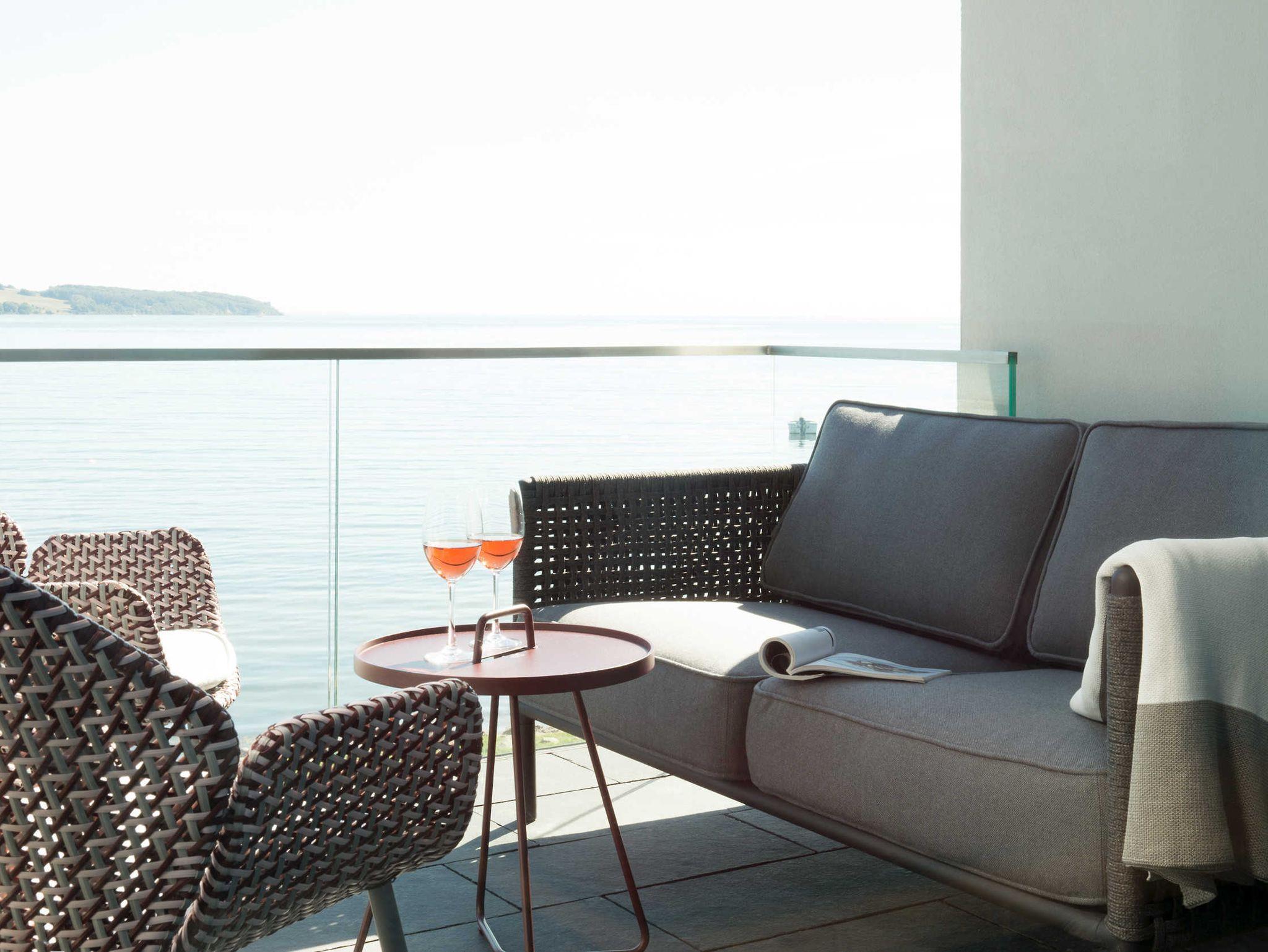 70 Quadratmeter purer Luxus - diesen finden Sie in der Ferienwohnung DYNE 33 auf Rügen. Mittelpunkt der Ferienwohnung ist der Wohnbereich mit seinen bodentiefen Fenstern und angrenzendem Balkon mit exklusivem Blick auf die Hagensche Wiek. Die bequeme Couch lädt Sie ein, dem Kaminfeuer zu lauschen oder es sich vor dem großen Fernseher gemütlich zu machen.
