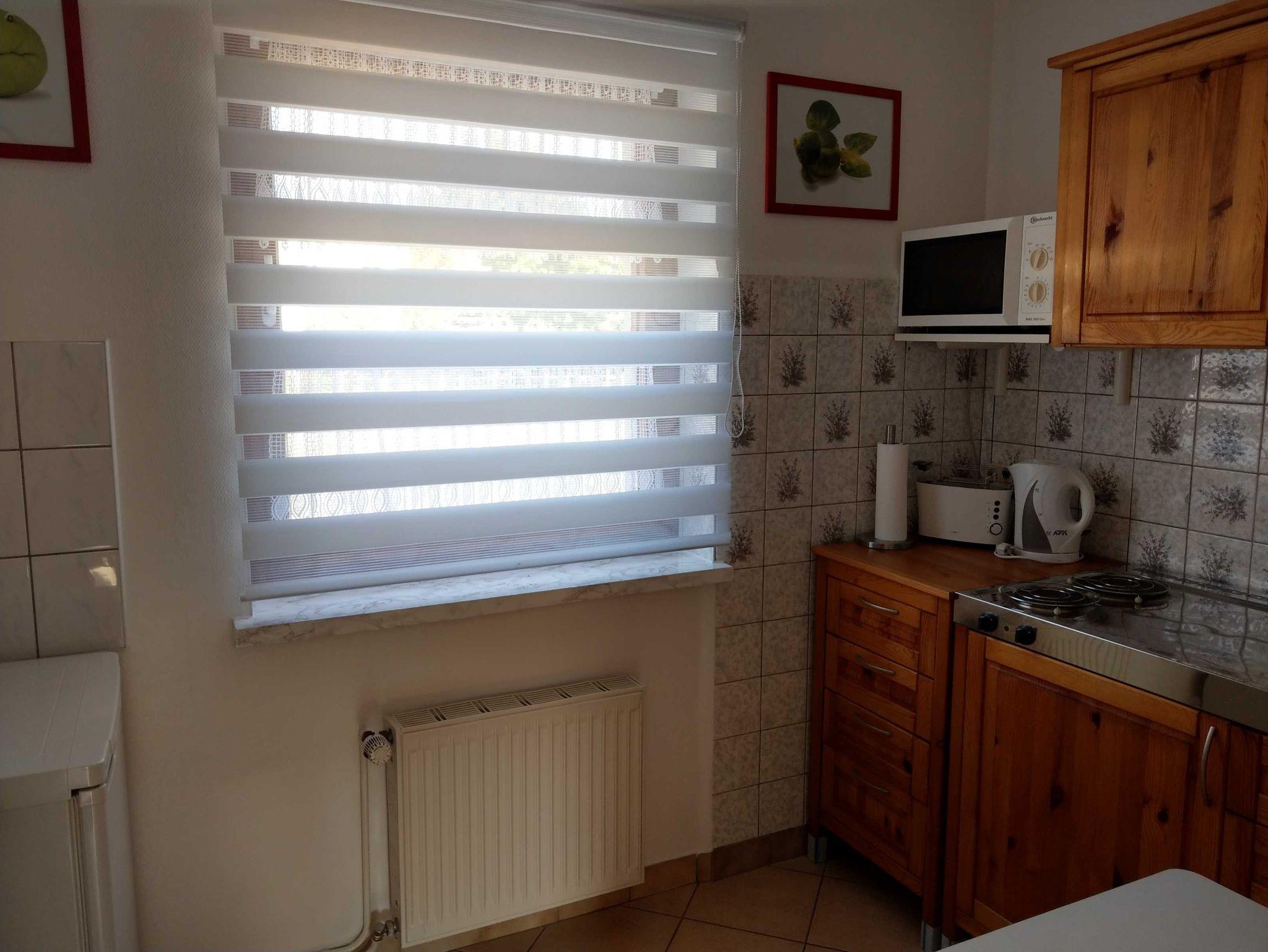 Küche mit 2 Kochplatten, Kühlschrank, Mikrowelle, Toaster, Kaffeemaschine, Wasserkocher und Minibackofen