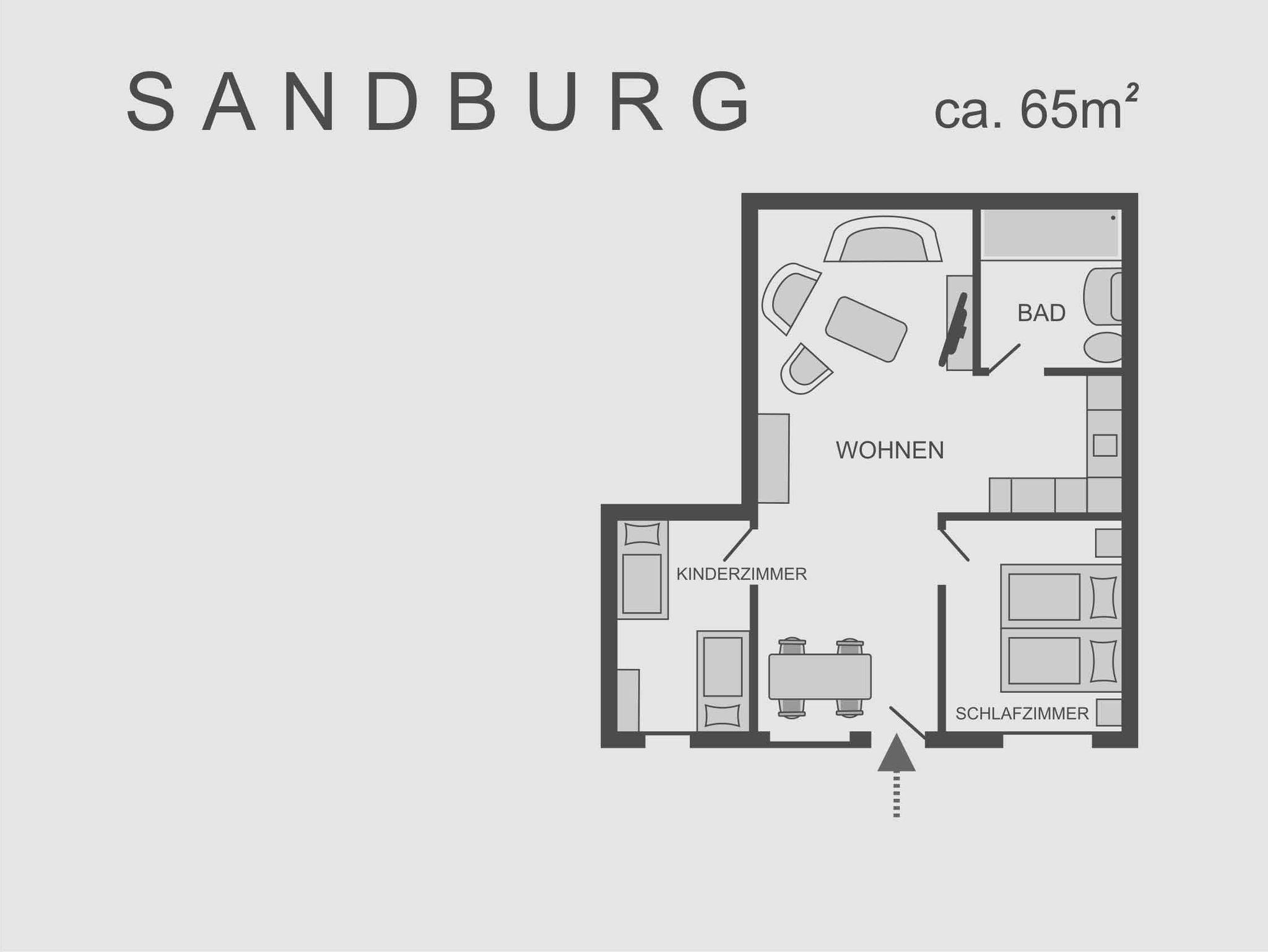 Geräumige Ferienwohnung mit großem Wohn- und Essbereich, integrierter Küchenzeile, zwei separaten Schlafzimmern mit Doppelbett und zwei Einzelbetten, Aufbettungsmöglichkeit im Wohnbereich, WC/Dusche, Sonnenterrasse, TV, Schreibtisch.