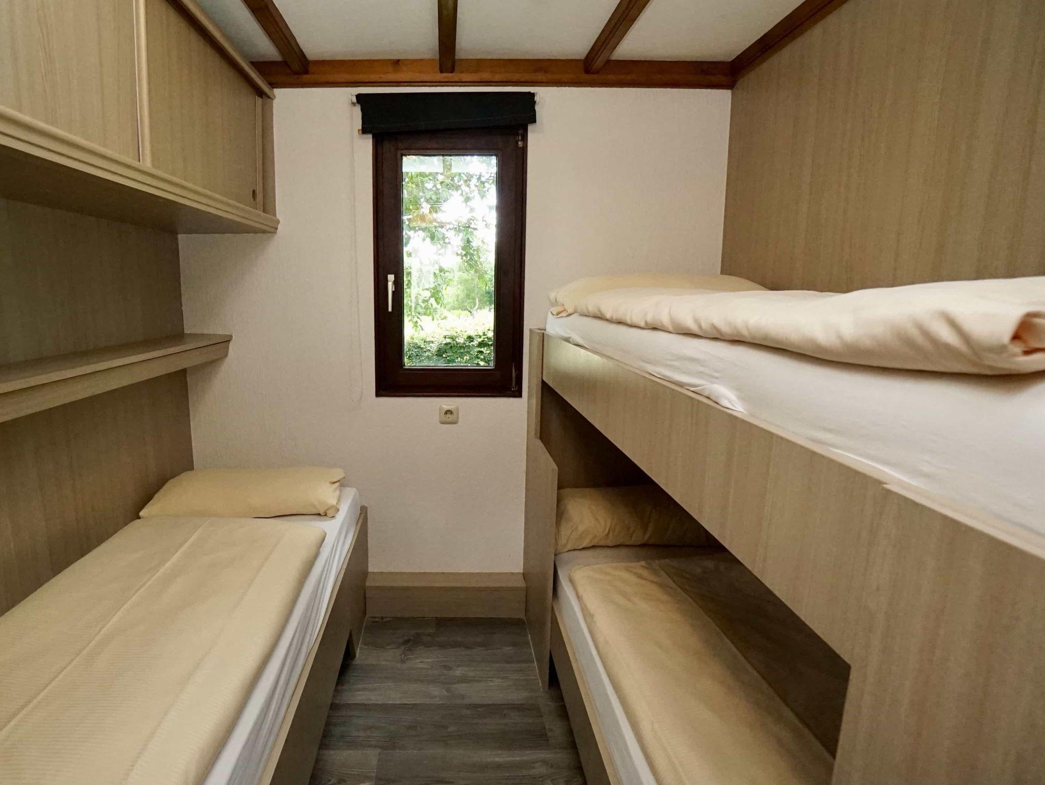 Das 33 qm große Chalet für fünf Personen verfügt über zwei Schlafzimmer (Elternzimmer mit Doppelbett 180 x 200 cm und Kinderzimmer mit Etagenbett 70 x 190 cm und Einzelbett 70 x 190 cm). Die Unterkunft bietet einen freundlich eingerichteten Wohnraum mit gemütlicher Couch, Esstisch und TV- Gerät. Im Flur befindet sich die voll ausgestattete Küche mit Kühlschrank, Induktionsherd und Backofen. Außerdem gibt es ein Badezimmer mit Dusche und WC. Im Außenbereich ist eine überdachte Terrasse mit Gartenmöbeln.