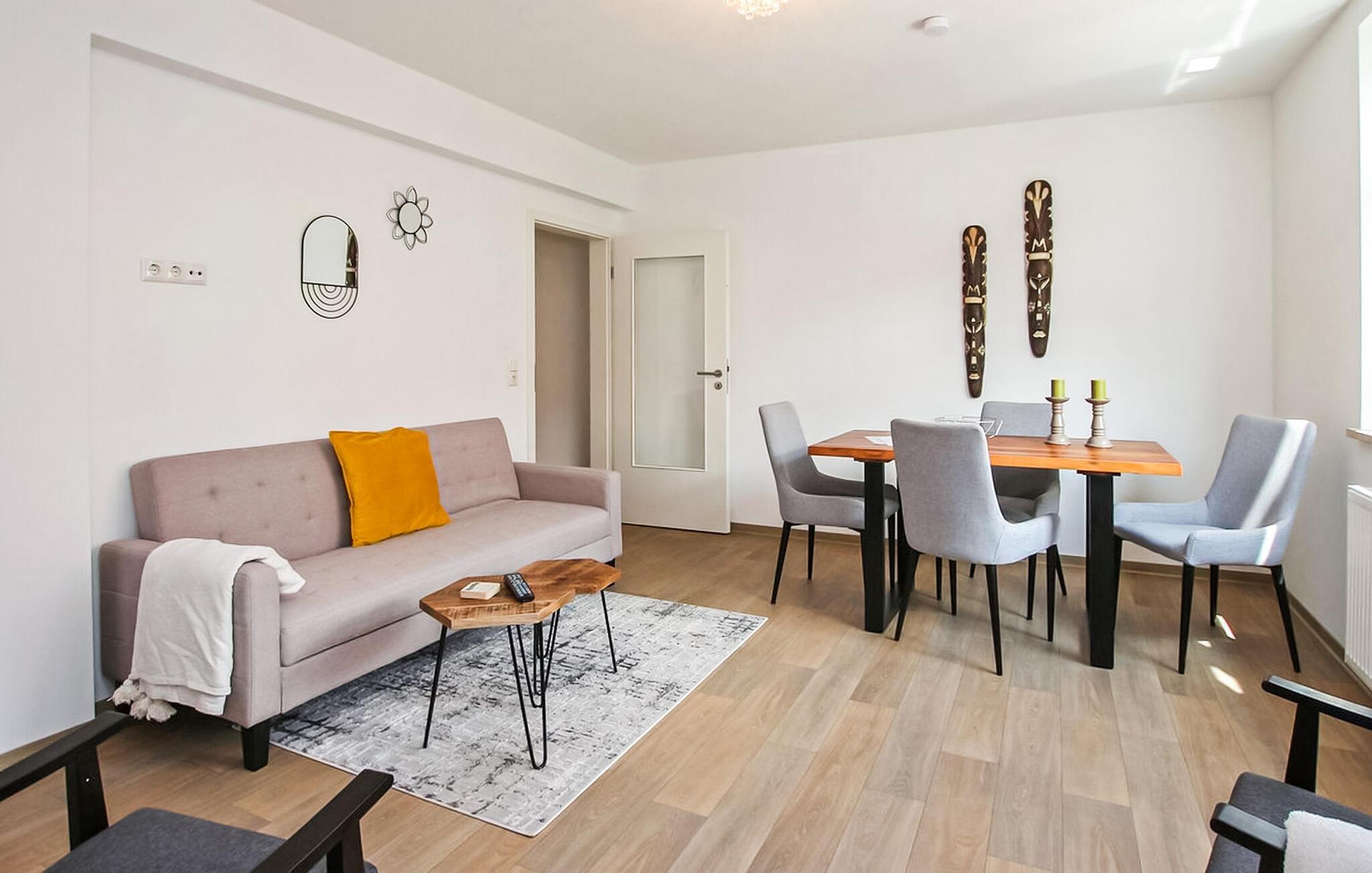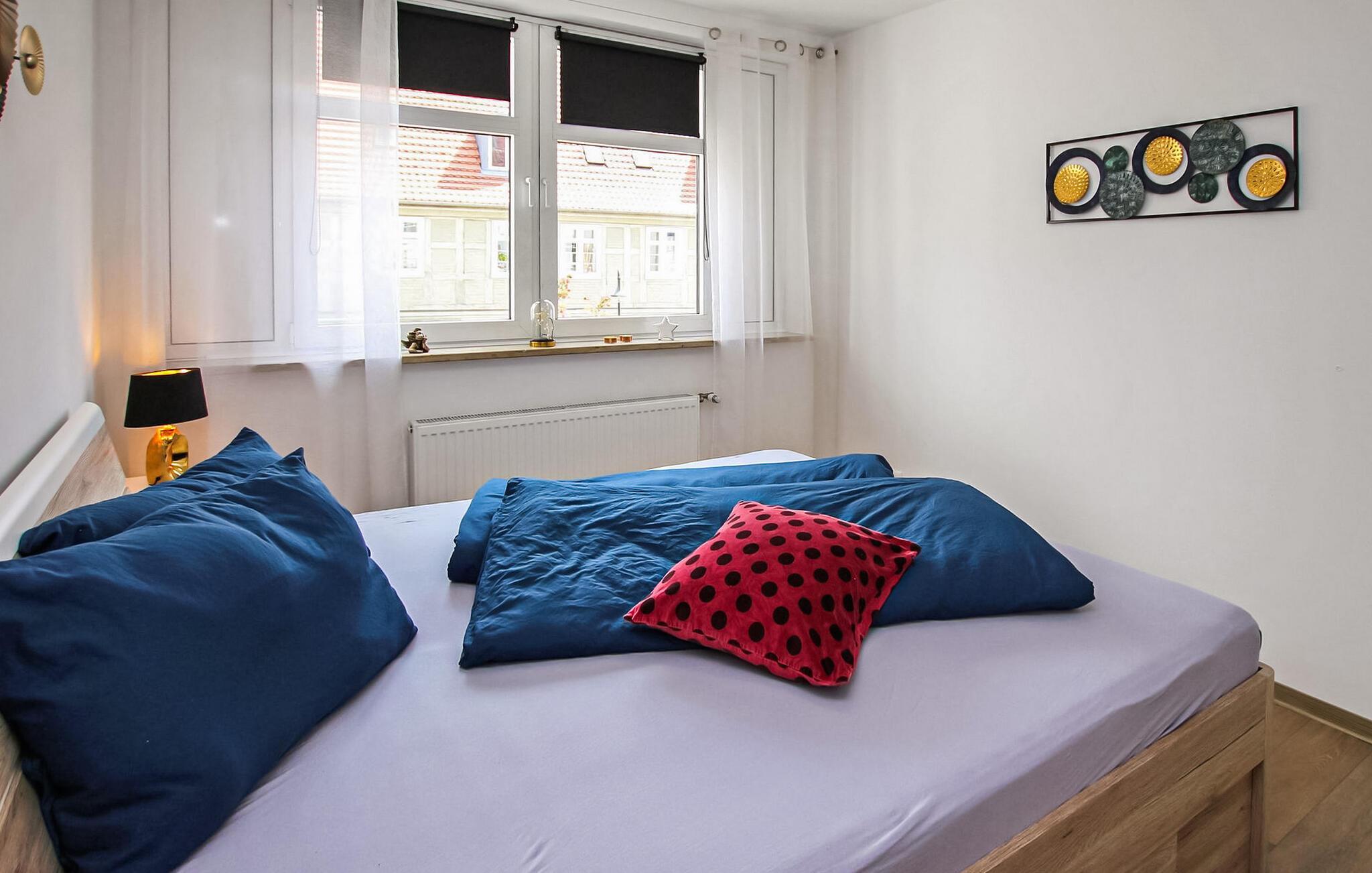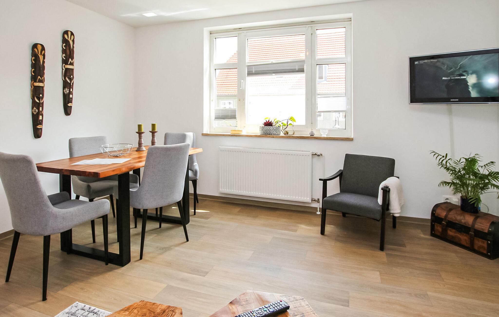 De to smakfullt og moderne innredede, sentraloppvarmede og røykfrie leilighetene nås via en felles trapp og en felles korridor som fører inn i en annen korridor med separate inngangsdører. Den ca. 80 kvadratmeter store leiligheten for opptil 5 personer består av en stue (sovesofa - ekstra seng for 1 person, spisebord, flatskjerm-TV), et separat, stort kjøkken (elektrisk komfyr med stekeovn, kjøleskap med fryser, oppvaskmaskin, kaffetrakter, brødrister, vannkoker, musikkspiller, mikrobølgeovn, oppvaskmaskin, oppvaskmaskin, oppvaskmaskin, mikrobølgeovn, oppvaskmaskin, kaffetrakter, brødrister, vannkoker, musikkmaskin, oppvaskmaskin, brødrister, vannkoker, musikkspiller, oppvaskmaskin, oppvaskmaskin, brødrister, vannkoker, musikkanlegg), to soverom (1 x dobbeltseng, 1 x stor køyeseng og flatskjerm-TV), bad (dusjnisje, WC, hårføner), en lang korridor og ytterligere en bod (sykler kan også oppbevares her ved behov). Gratis Wi-Fi og babyutstyr (barneseng, barnestol, potte) er også tilgjengelig på forespørsel. Gratis offentlige parkeringsplasser er tilgjengelig ca. 250 - 500 m unna, og du kan parkere på gaten i kort tid for lasting og lossing. Totalprisen inkluderer sluttrengjøring, sengetøy, håndklær, strøm og vann. Betales på stedet: Turistskatt. Kjæledyr er ikke tillatt på denne eiendommen.