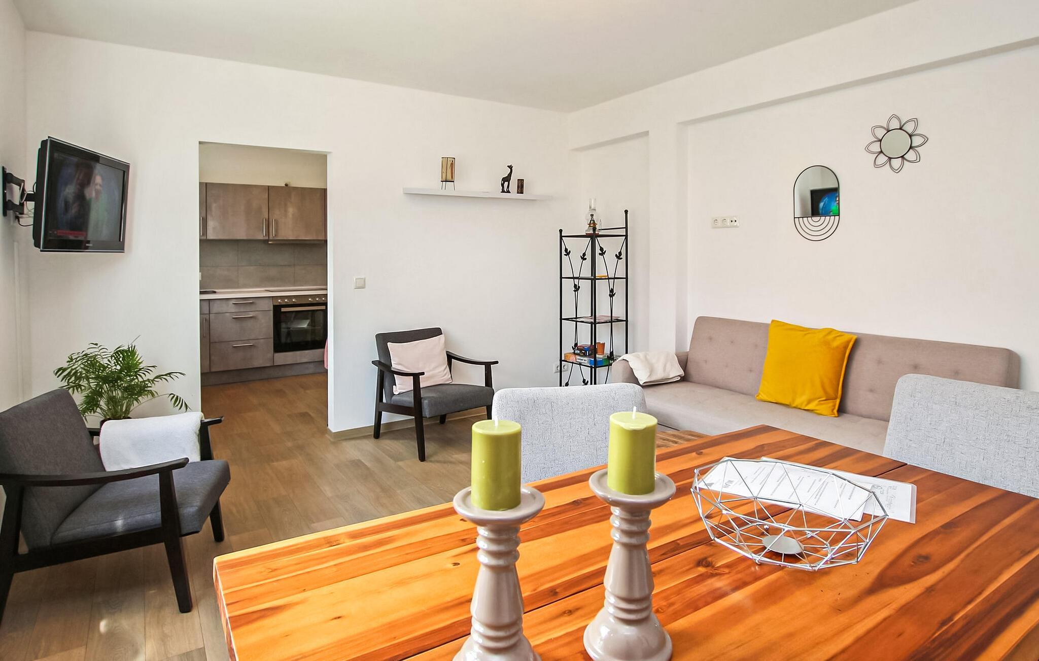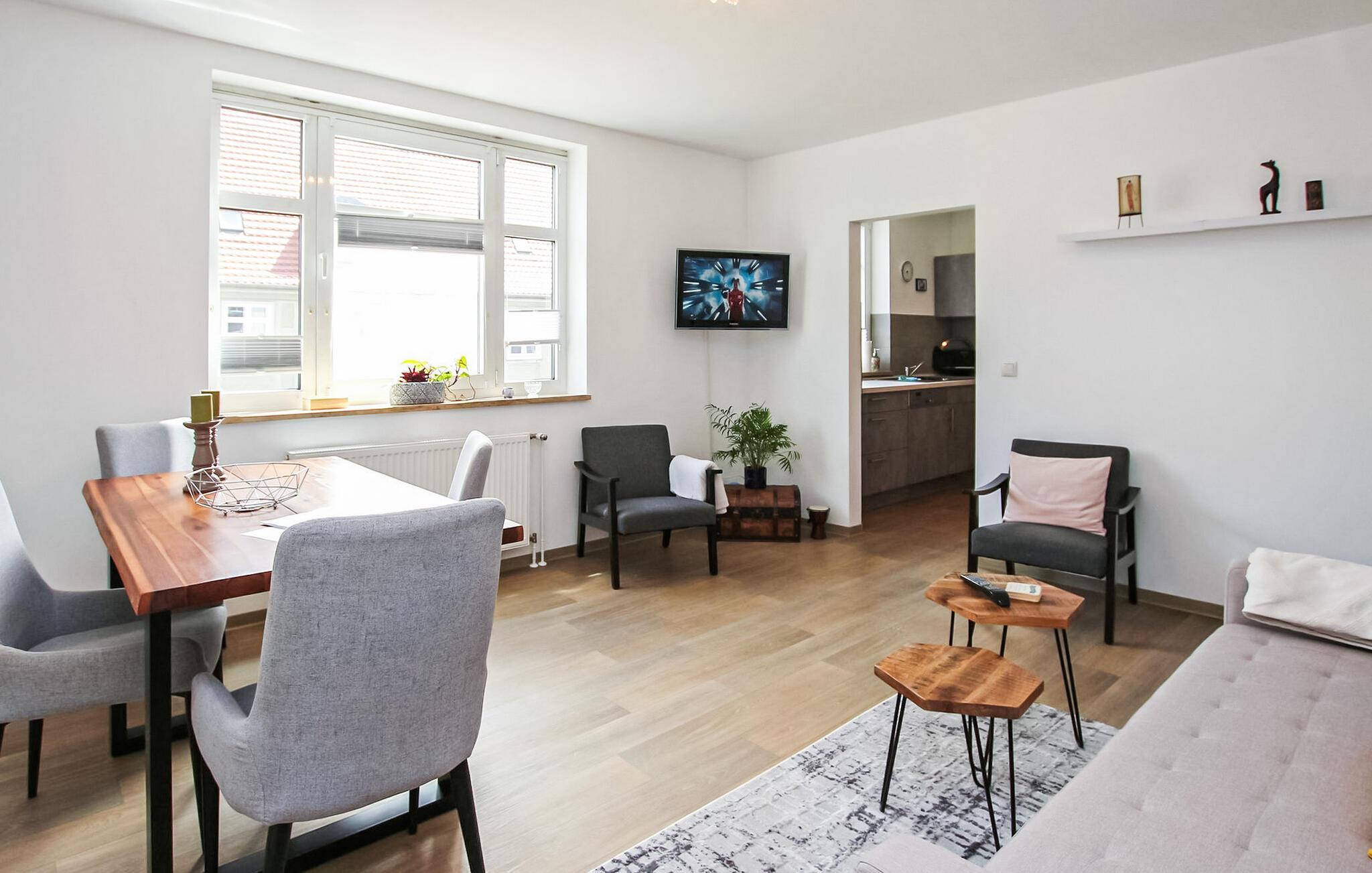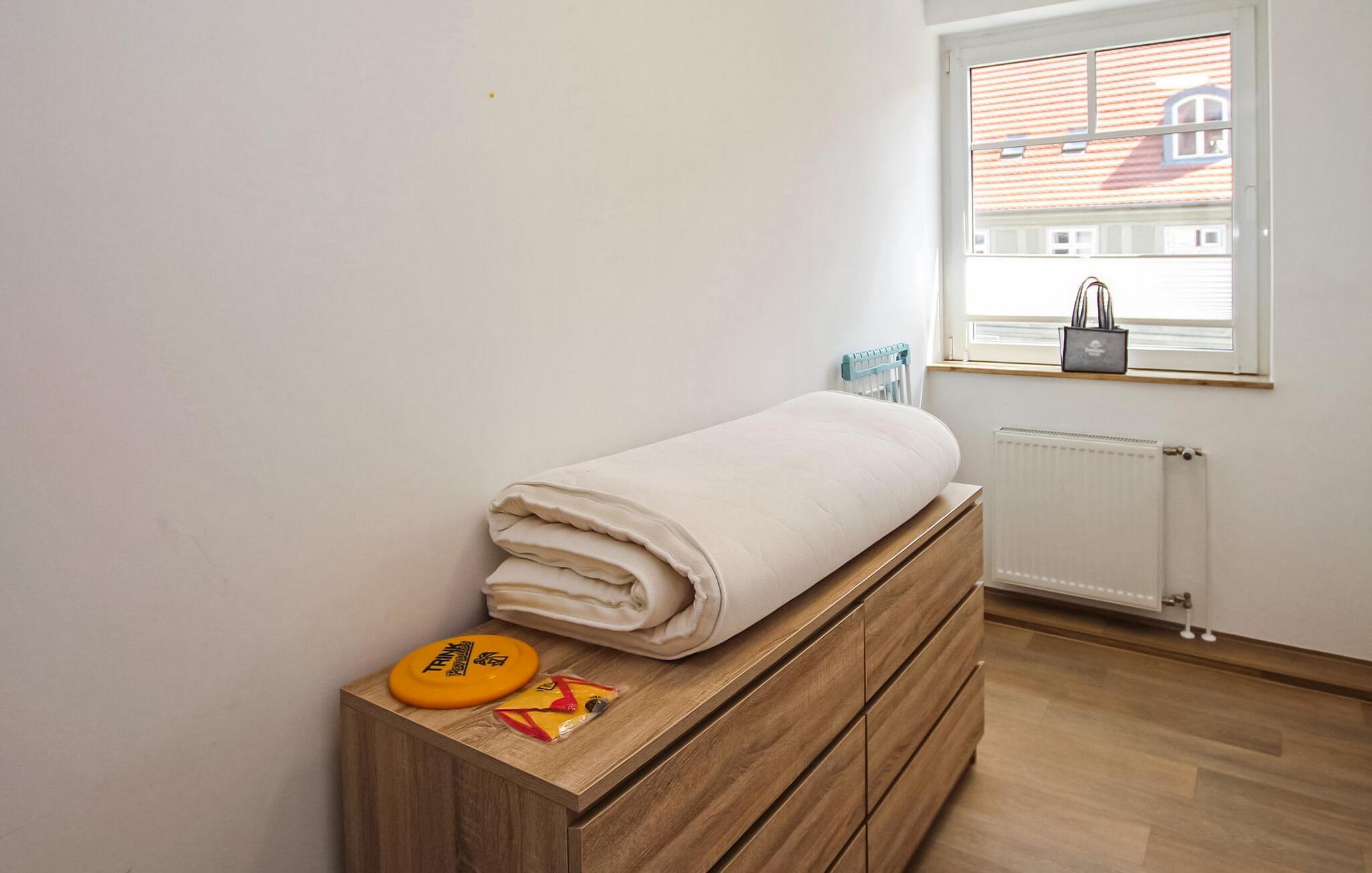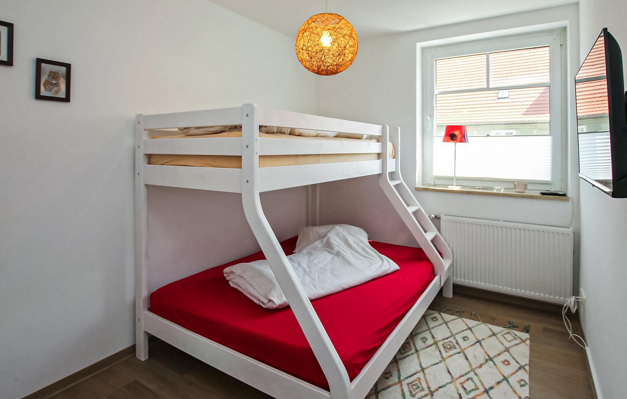 De to smakfullt og moderne innredede, sentraloppvarmede og røykfrie leilighetene nås via en felles trapp og en felles korridor som fører inn i en annen korridor med separate inngangsdører. Den ca. 80 kvadratmeter store leiligheten for opptil 5 personer består av en stue (sovesofa - ekstra seng for 1 person, spisebord, flatskjerm-TV), et separat, stort kjøkken (elektrisk komfyr med stekeovn, kjøleskap med fryser, oppvaskmaskin, kaffetrakter, brødrister, vannkoker, musikkspiller, mikrobølgeovn, oppvaskmaskin, oppvaskmaskin, oppvaskmaskin, mikrobølgeovn, oppvaskmaskin, kaffetrakter, brødrister, vannkoker, musikkmaskin, oppvaskmaskin, brødrister, vannkoker, musikkspiller, oppvaskmaskin, oppvaskmaskin, brødrister, vannkoker, musikkanlegg), to soverom (1 x dobbeltseng, 1 x stor køyeseng og flatskjerm-TV), bad (dusjnisje, WC, hårføner), en lang korridor og ytterligere en bod (sykler kan også oppbevares her ved behov). Gratis Wi-Fi og babyutstyr (barneseng, barnestol, potte) er også tilgjengelig på forespørsel. Gratis offentlige parkeringsplasser er tilgjengelig ca. 250 - 500 m unna, og du kan parkere på gaten i kort tid for lasting og lossing. Totalprisen inkluderer sluttrengjøring, sengetøy, håndklær, strøm og vann. Betales på stedet: Turistskatt. Kjæledyr er ikke tillatt på denne eiendommen.