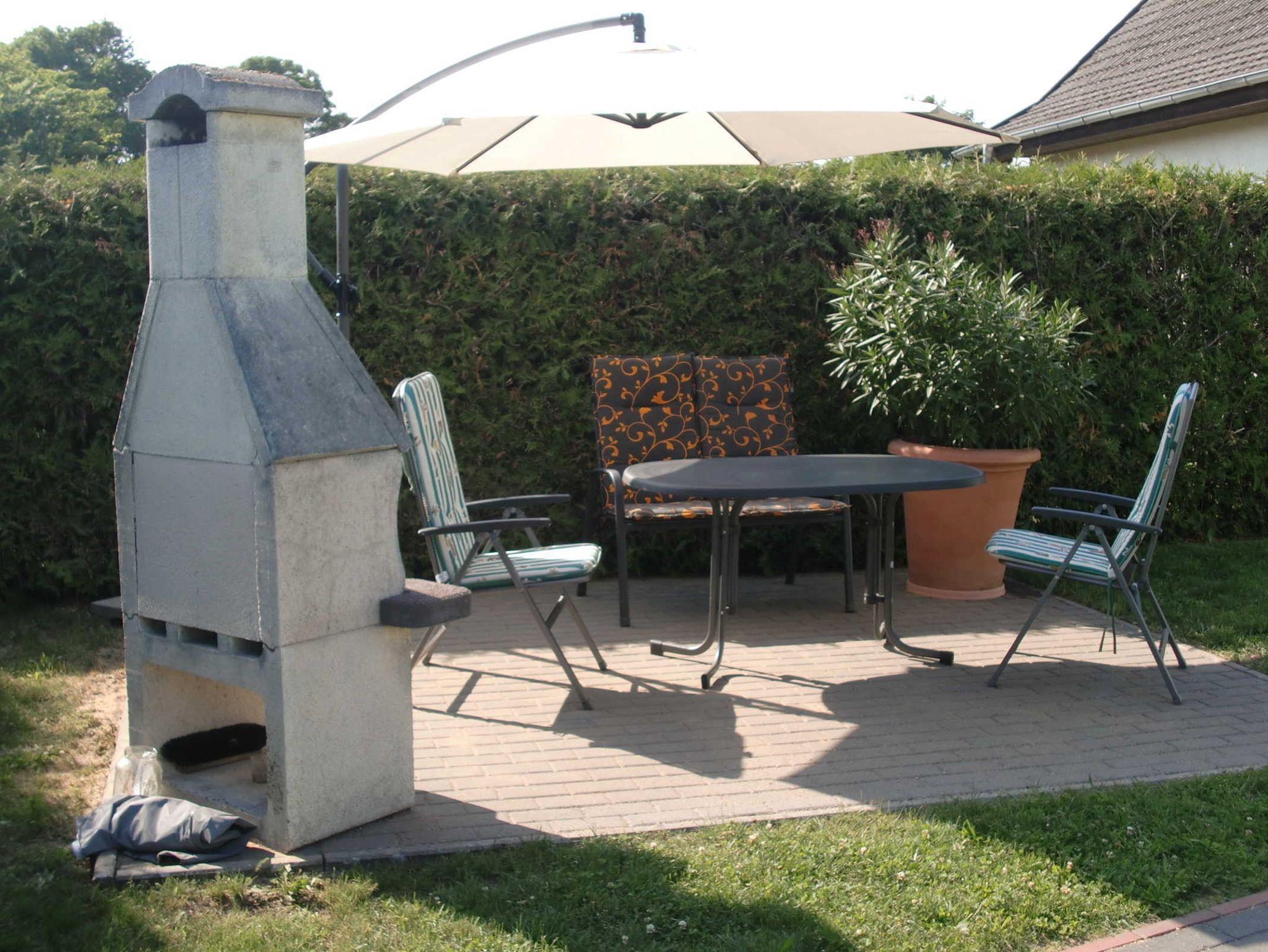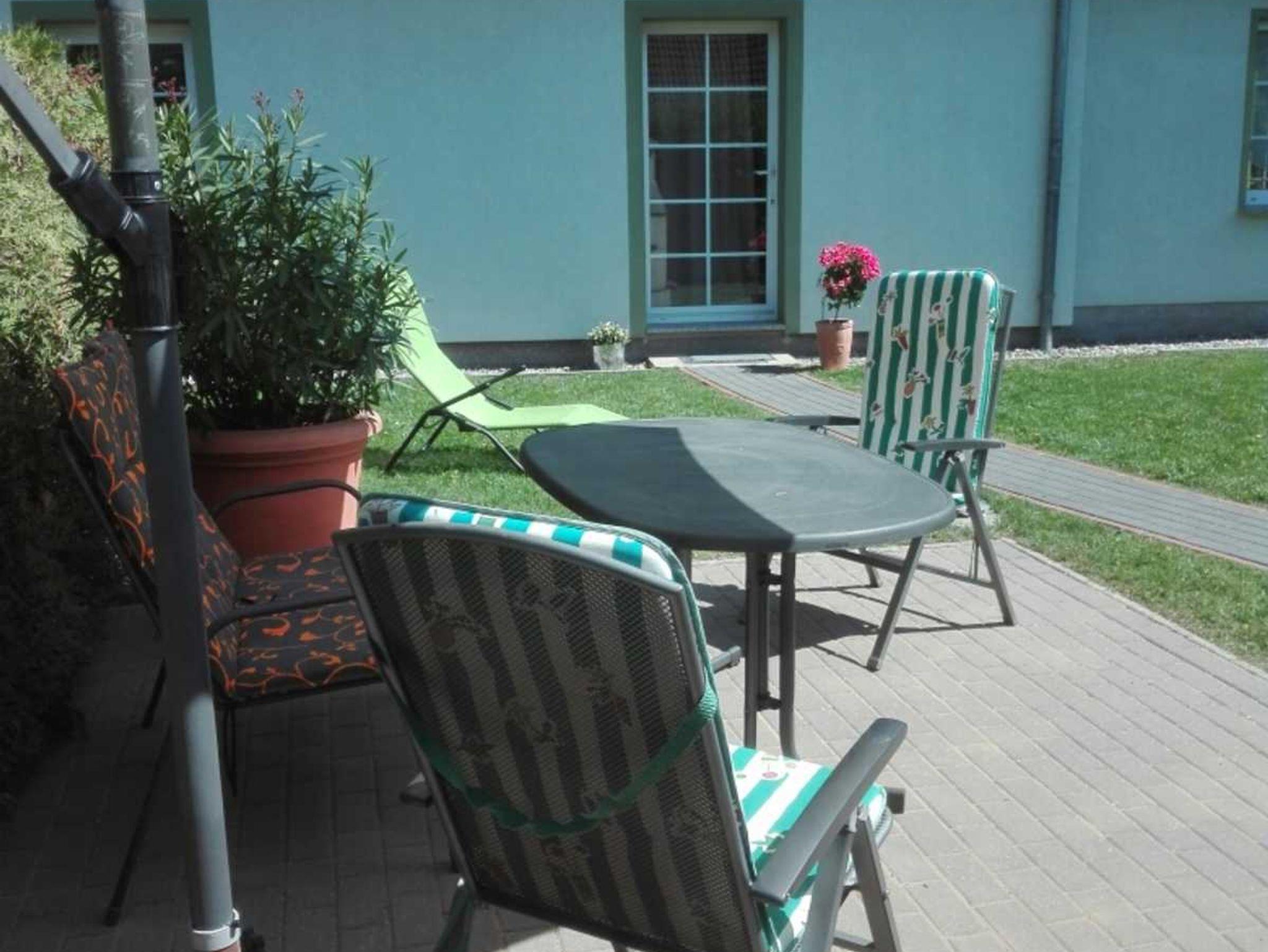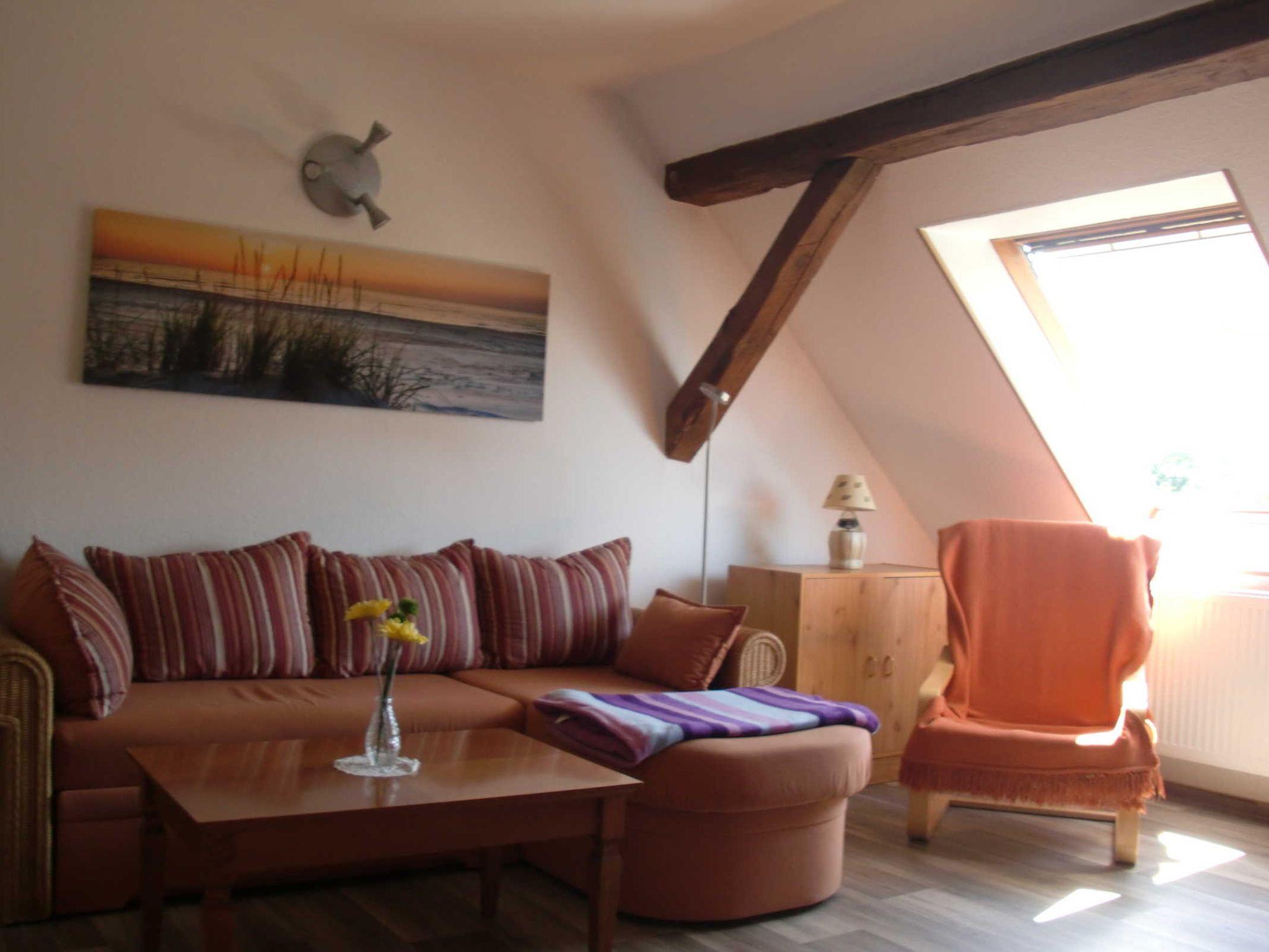 Im Erdgeschoß befindet sich die offene Küche mit Sitzgruppe, sowie das Duschbad. Die obere Etage besteht aus Wohnbereich und Schlafzimmer. Die Schlafmöglichkeit für die 3. Person befindet sich im Schlafzimmer (transportables Bett) oder im Wohnzimmer (Schlafliege). Zur Wohnung gehört eine Terrasse mit Grillkamin und eine Liegewiese. Für ihr Fahrzeug steht ein umzäunter Parkplatz zur Verfügung.