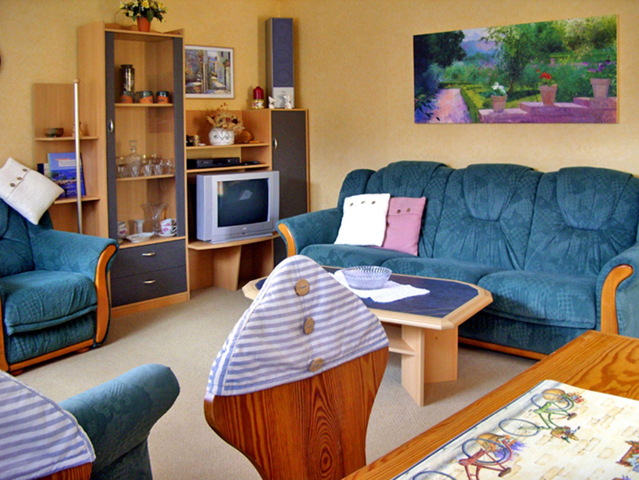 Das 60m² große, gemütlich und geschmackvoll eingerichtete Ferienhaus betreten Sie ebenerdig über einen Flur mit Garderobe, Spiegel und Schuhschrank. Von hier gelangen sie ins Bad mit Dusche und WC und ins Wohn- und Esszimmer mit Couch, zwei Sesseln, Tisch, Schrank, TV und Stereoanlage, offener Küche mit Esstisch, E-Herd, Backofen, Kühlschrank, Kaffeemaschine, Wasserkocher und Toaster.
