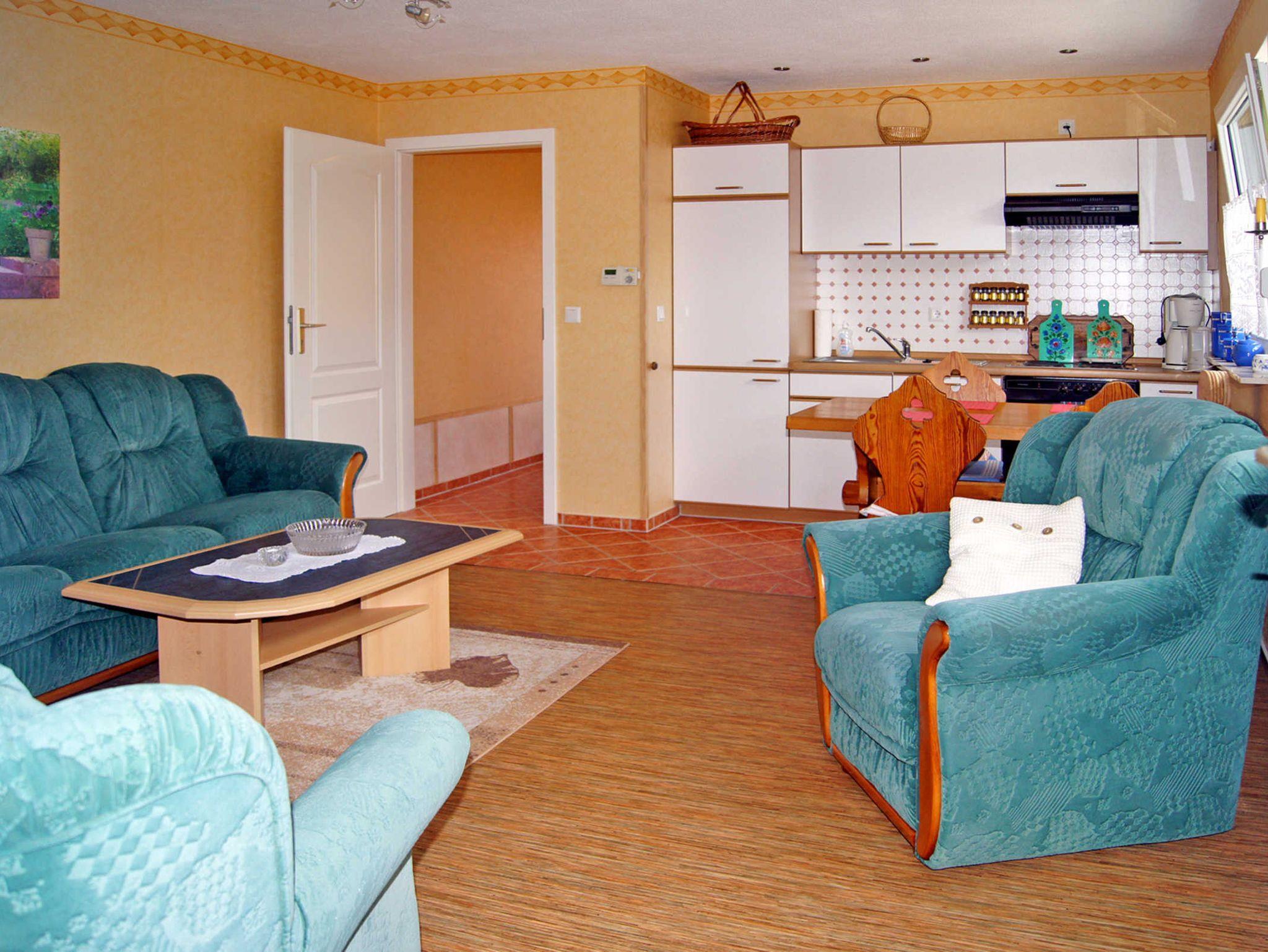 Das 60m² große, gemütlich und geschmackvoll eingerichtete Ferienhaus betreten sie ebenerdig über einen Flur mit Garderobe, Spiegel und Schuhschrank. Von hier gelangen sie ins Bad mit Dusche und WC und ins Wohn- und Esszimmer mit Couch, zwei Sesseln, Tisch, Schrank, TV und Stereoanlage, offener Küche mit Esstisch, E-Herd, Backofen, Kühlschrank, Mikrowelle, Kaffeemaschine, Wasserkocher und Toaster.