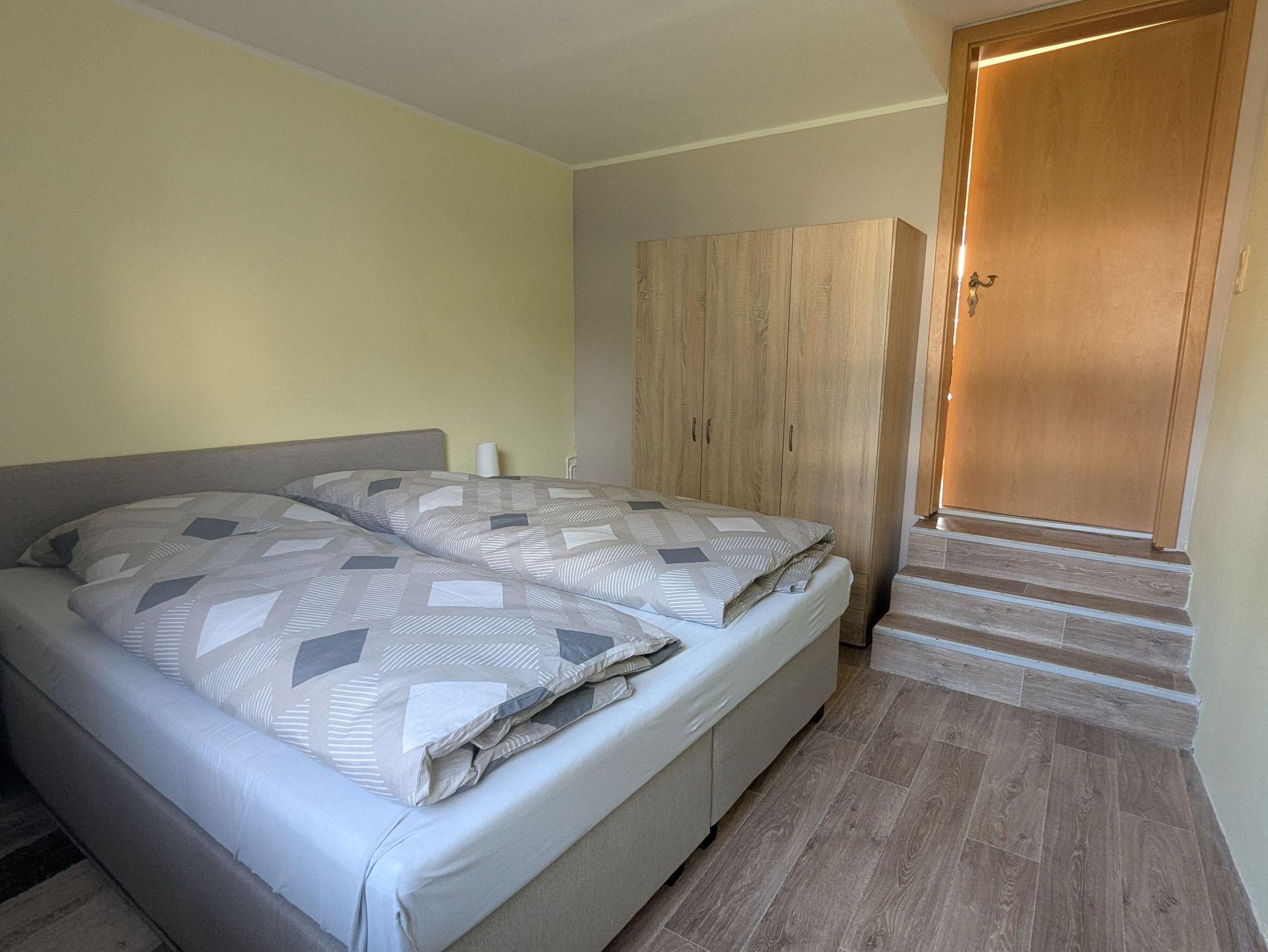 Zum Schlafzimmer gelangen Sie über 3 Stufen. Das Doppelbett ist 1,80 m x 2,00 m und im geräumigen Kleiderschrank können Sie Ihre Kleidung unterbringen.
