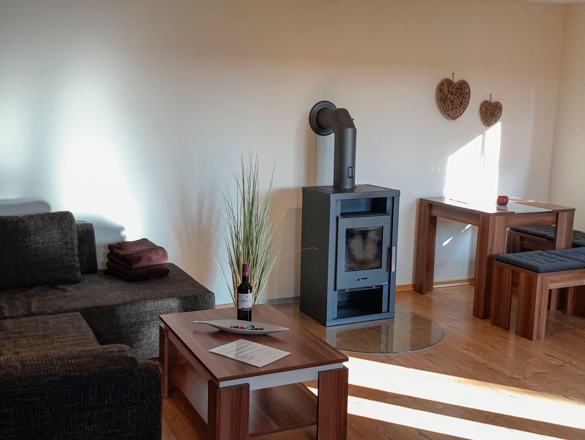 Das 45m² große Ferienhaus verfügt über ein Wohnzimmer mit Kaminofen, Schlafcouch (Aufbettung für eine Person) und offener Küche, ein Schlafzimmer mit einem Doppelbett und einem Einzelbett und ein Bad mit Dusche und WC. Die offene Küche ist ausgestattet mit Geschirrspüler, Cerankochfeld, Backofen, Kühl-Gefrier-Kombination, Mikrowelle, Kaffeemaschine, Wasserkocher und Toaster.