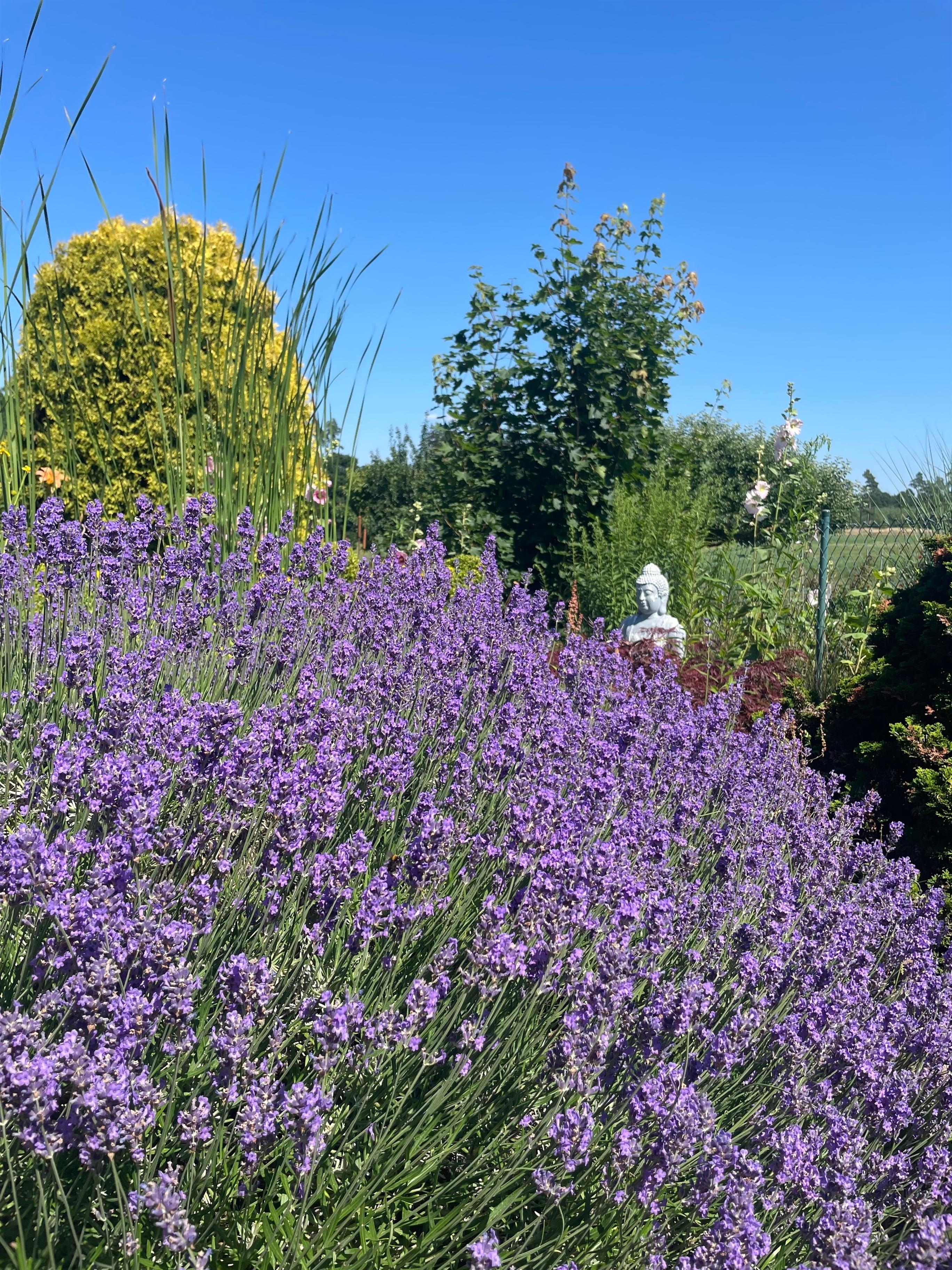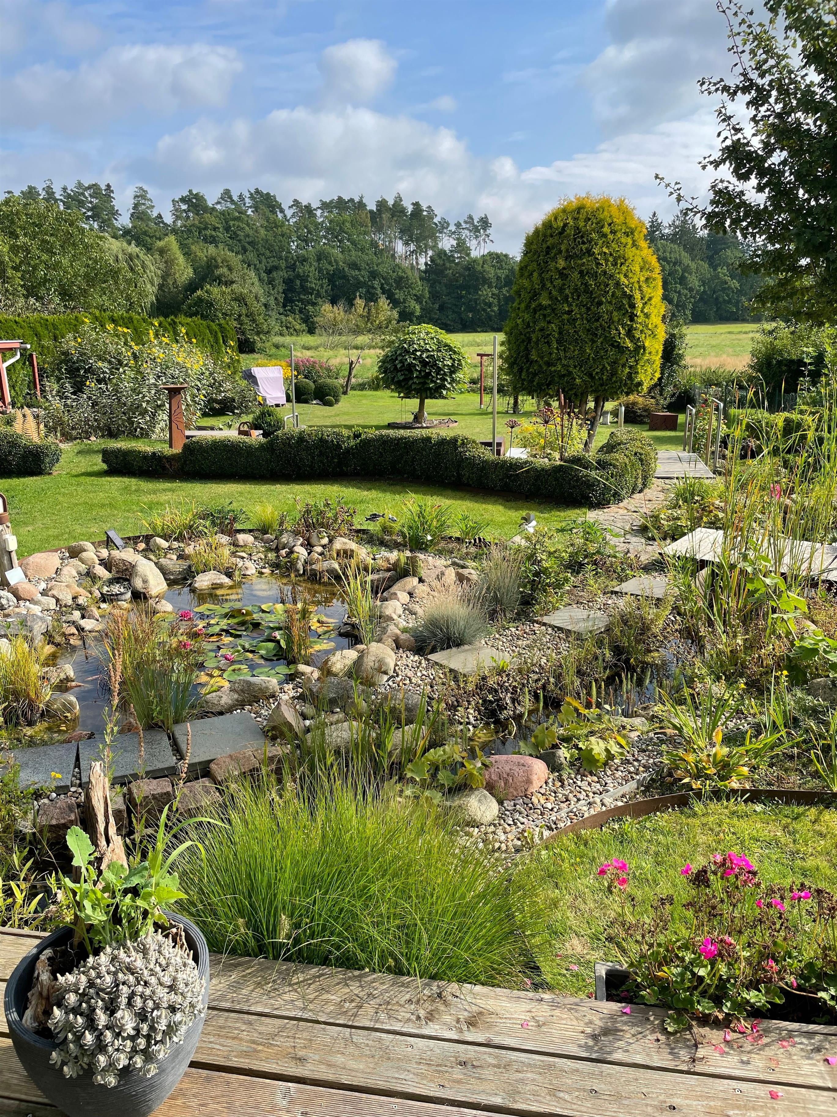 Der liebevoll angelegte Garten mit Teichanlage und bequemen Liegen lädt zum Entspannen ein – der perfekte Ort, um zur Ruhe zu kommen und den Blick in die Natur schweifen zu lassen.