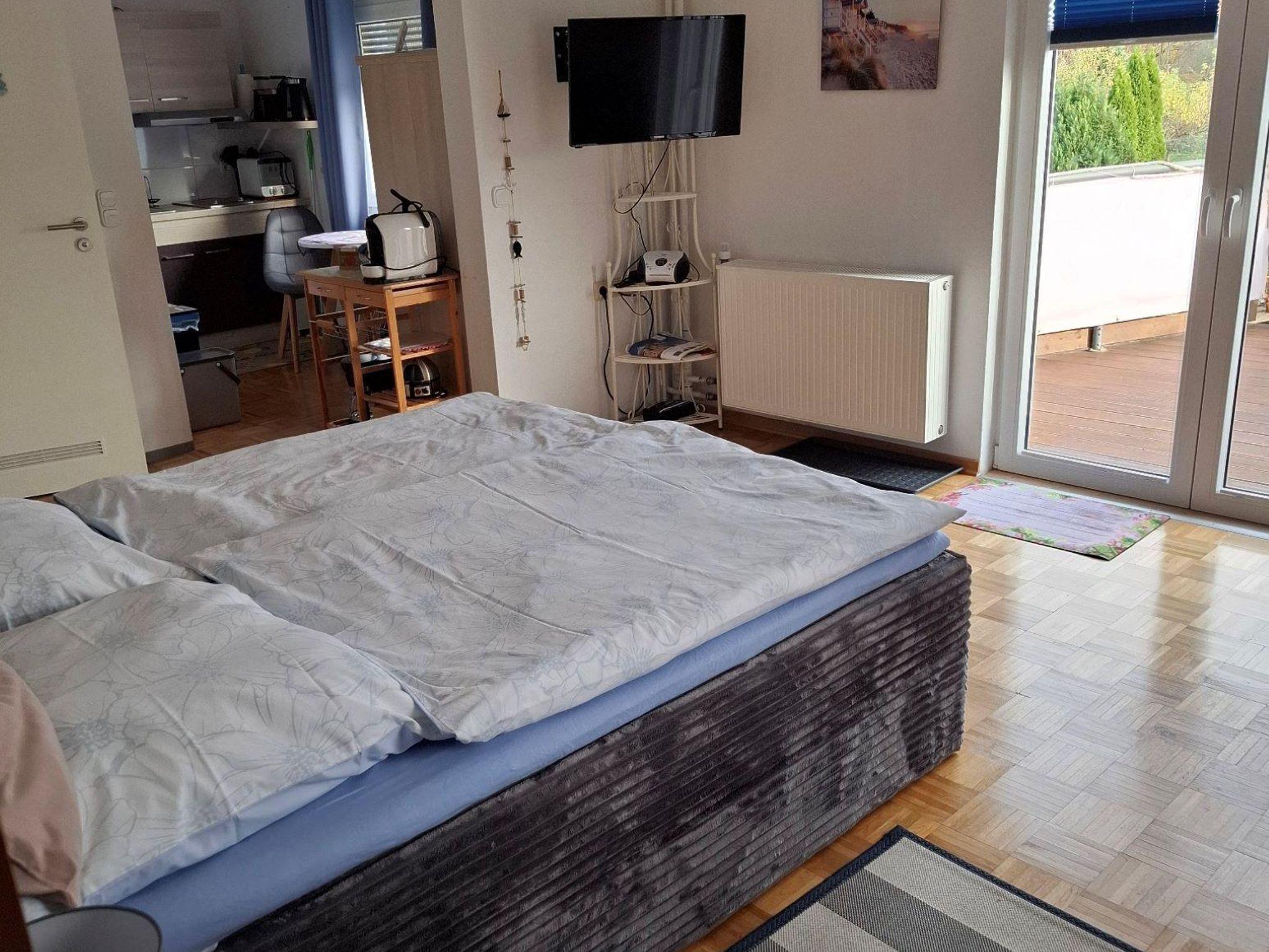 In unserer 30 m² großen Ferienwohnung finden Sie einen Wohn- und Schlafraum sowie ein eigenes Badezimmer mit Dusche und WC. In der gemütlichen Küchenzeile steht für Sie ein Kühlschrank mit Gefriermöglichkeit, ein Wasserkocher und ein Toaster zur Verfügung. Des Weiteren finden Sie hier eine eigene Kaffeemaschine und eine Mikrowelle. Auf der eigenen Terrasse haben Sie die Möglichkeit Ihren Urlaubstag entspannt ausklingen zu lassen. Für Ihre mitgebrachten Fahrräder bieten wir Ihnen die Möglichkeit, diese überdacht abzuschließen. Diese können dort auch aufgeladen werden.