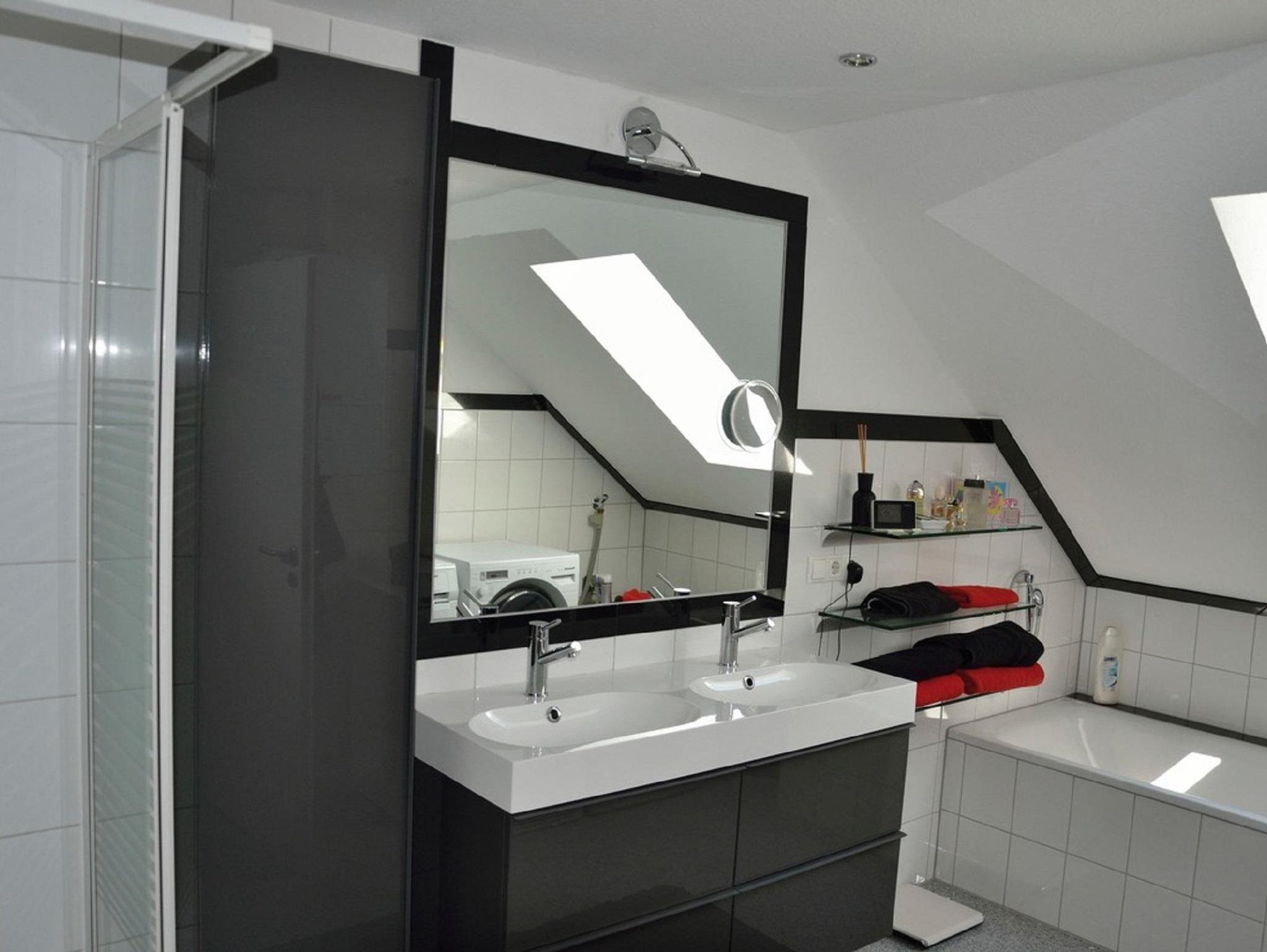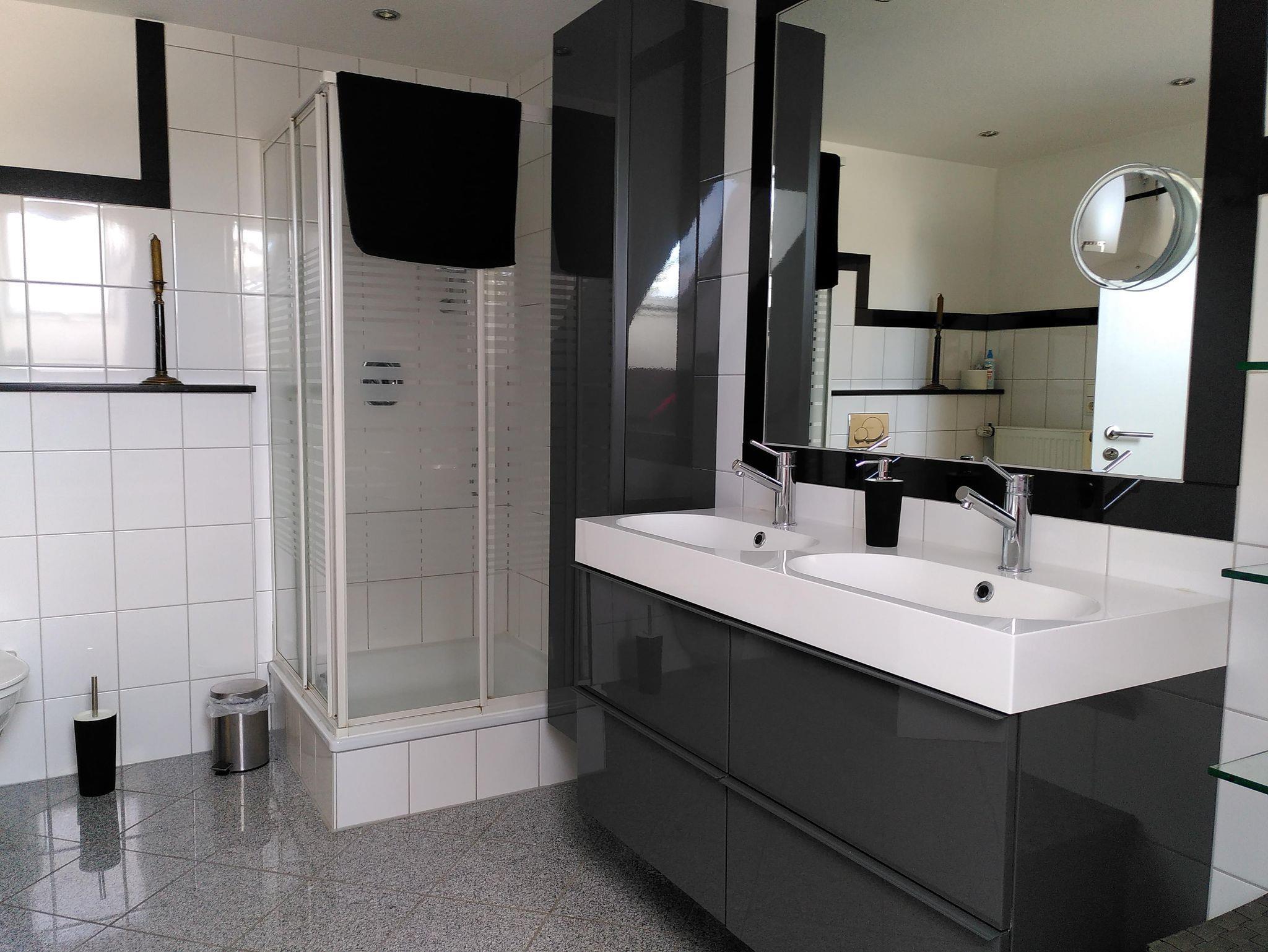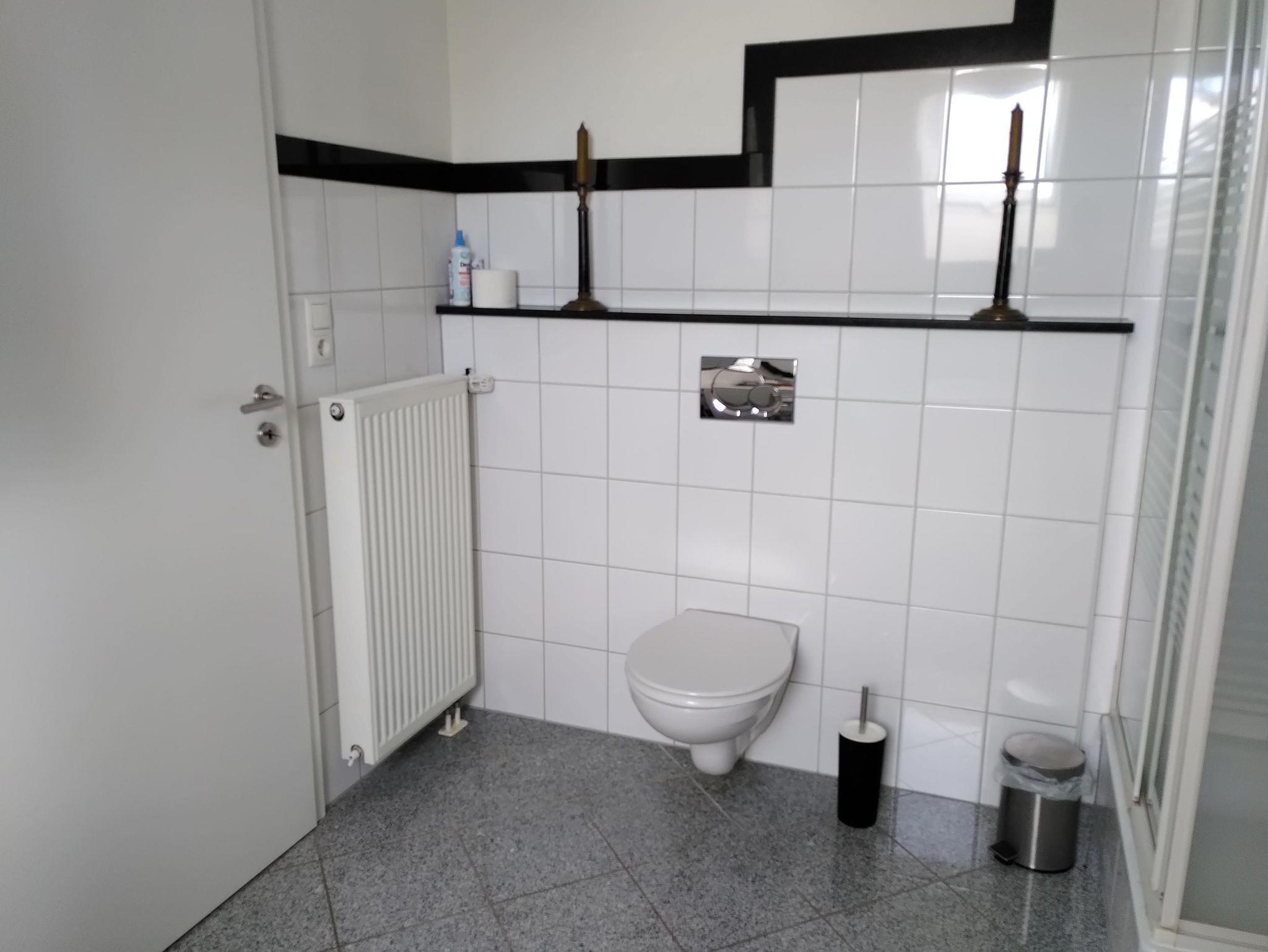 Das Bad hat neben einer Dusche auch eine Badewanne, Waschmaschine und Trockner. Waschmittel ist vorhanden.