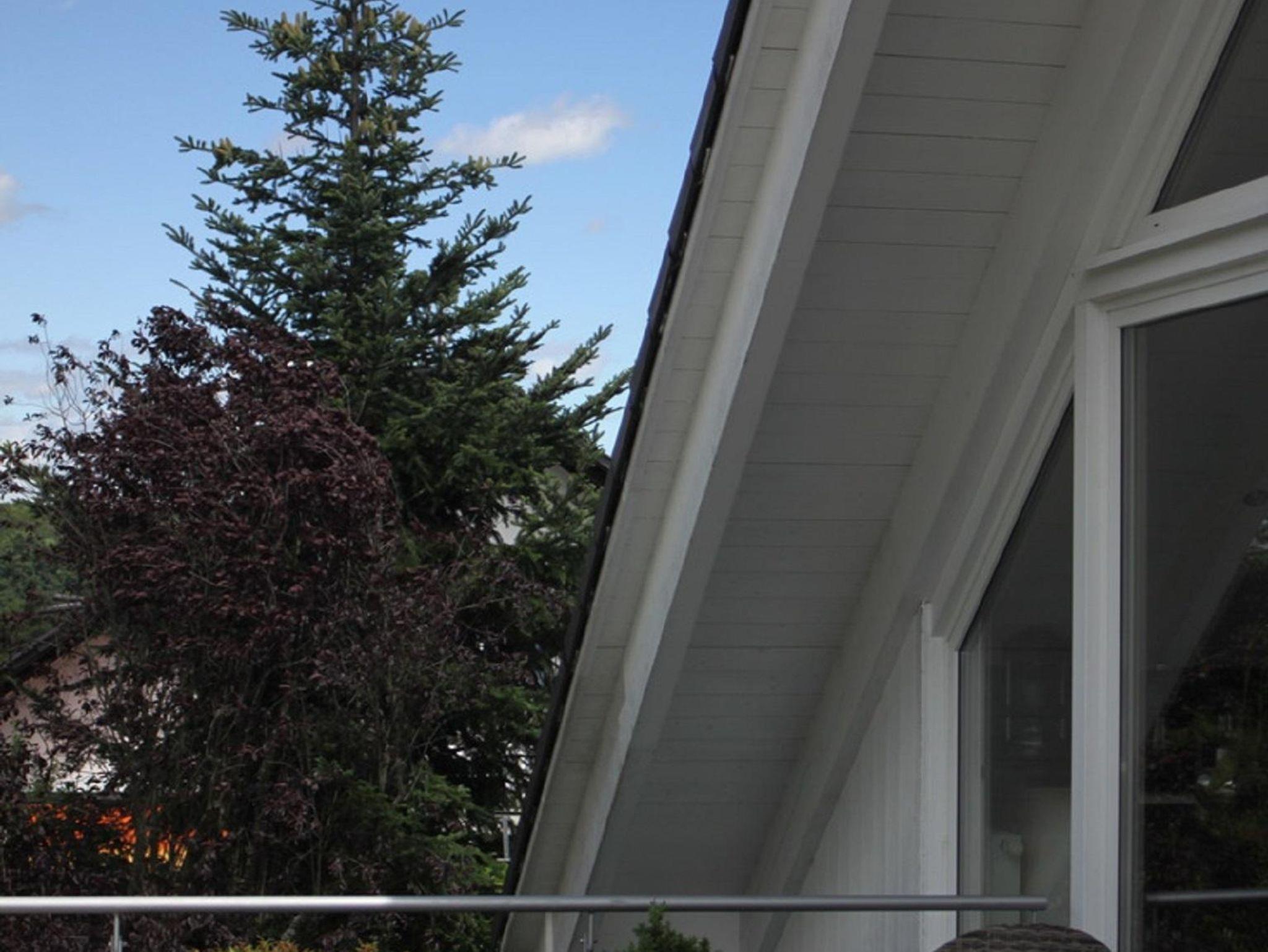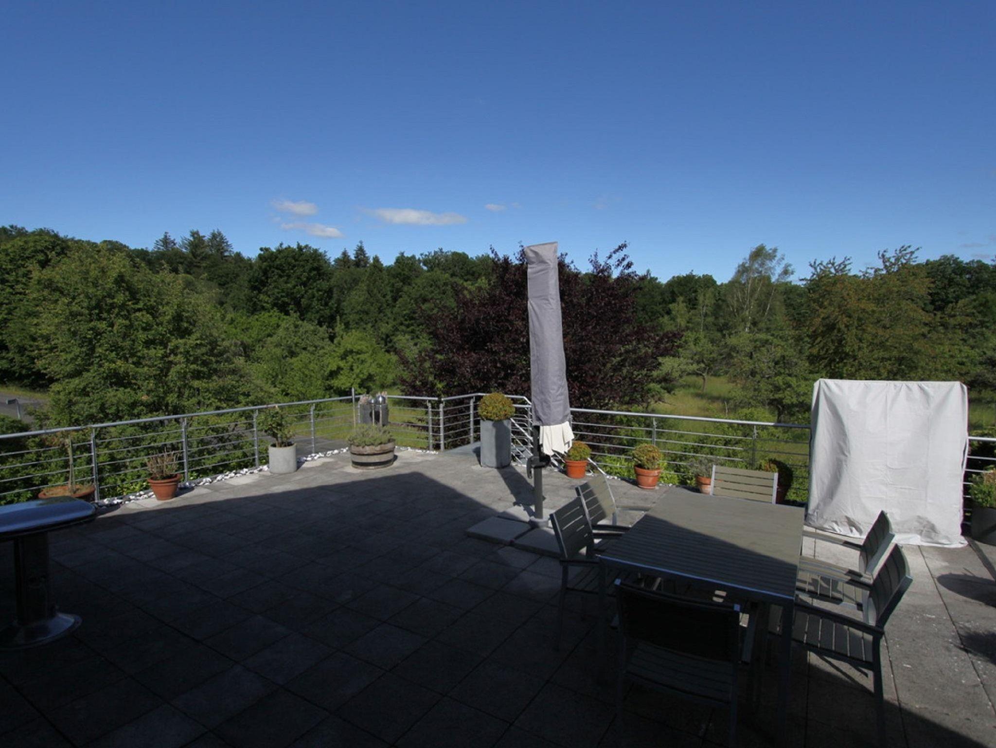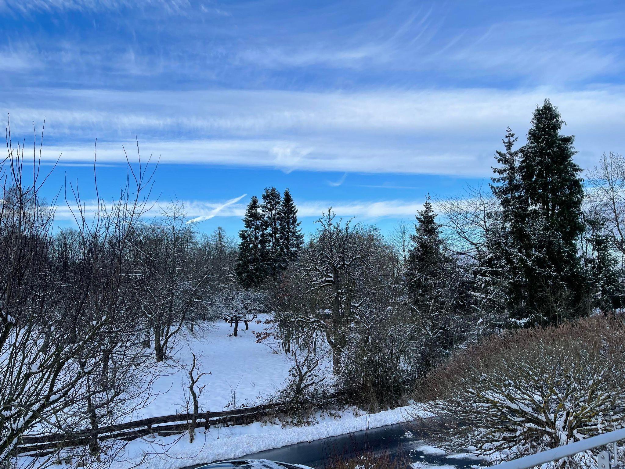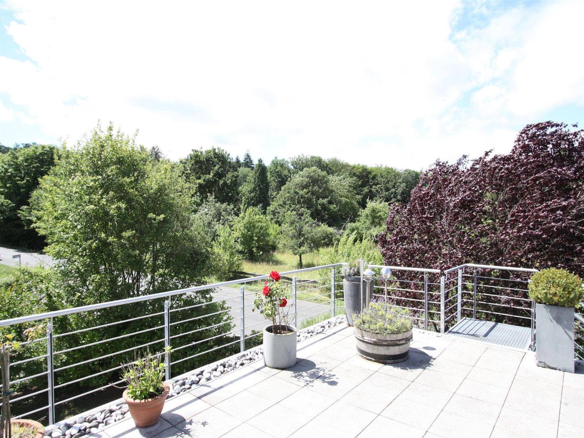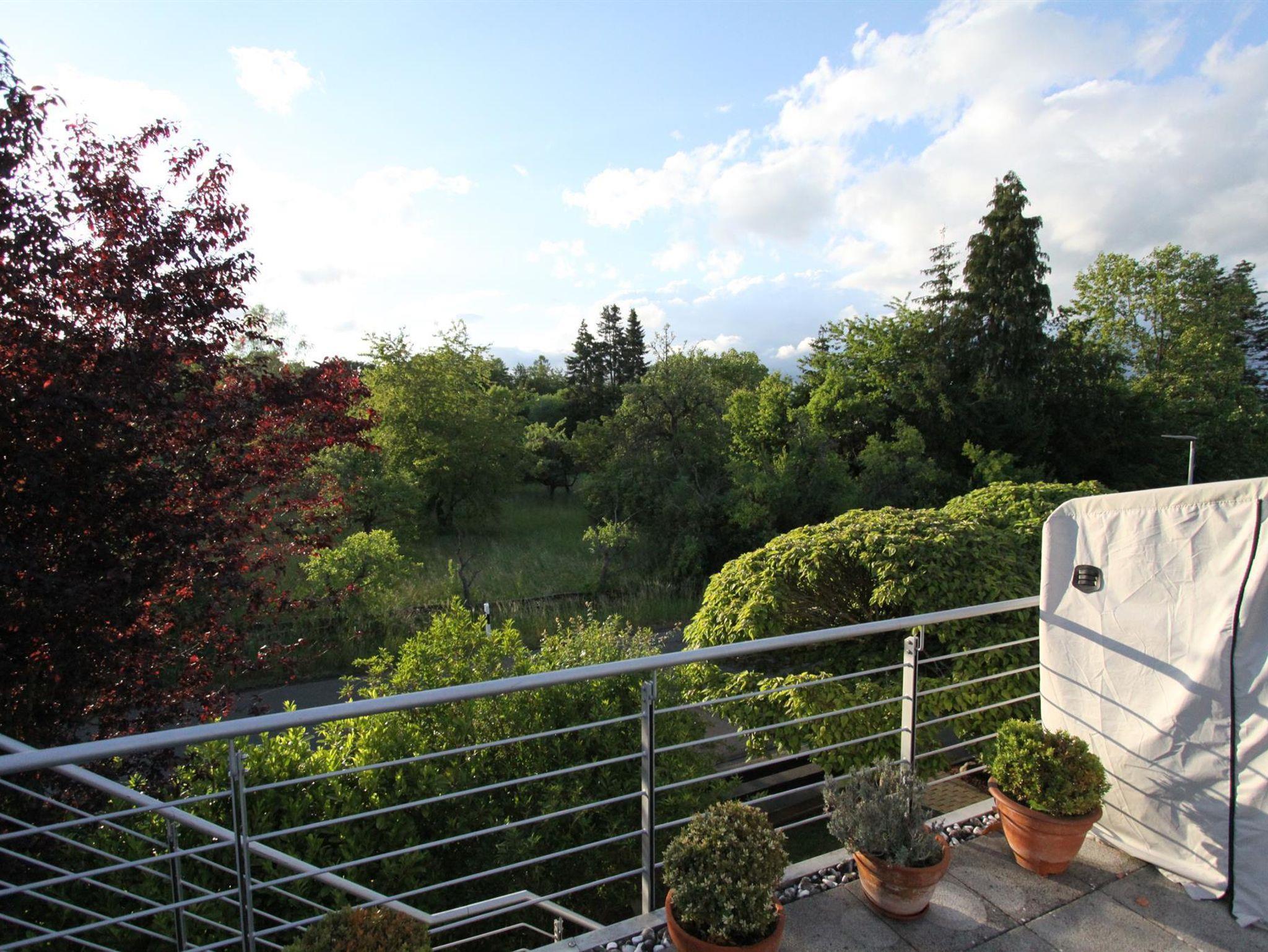 Der Blick von der 35 qm großen Sonnenterrasse mit Strandkorb fällt auf ein wunderschönes parkähnliches Wiesengrundstück mit altem Obstbaumbestand.