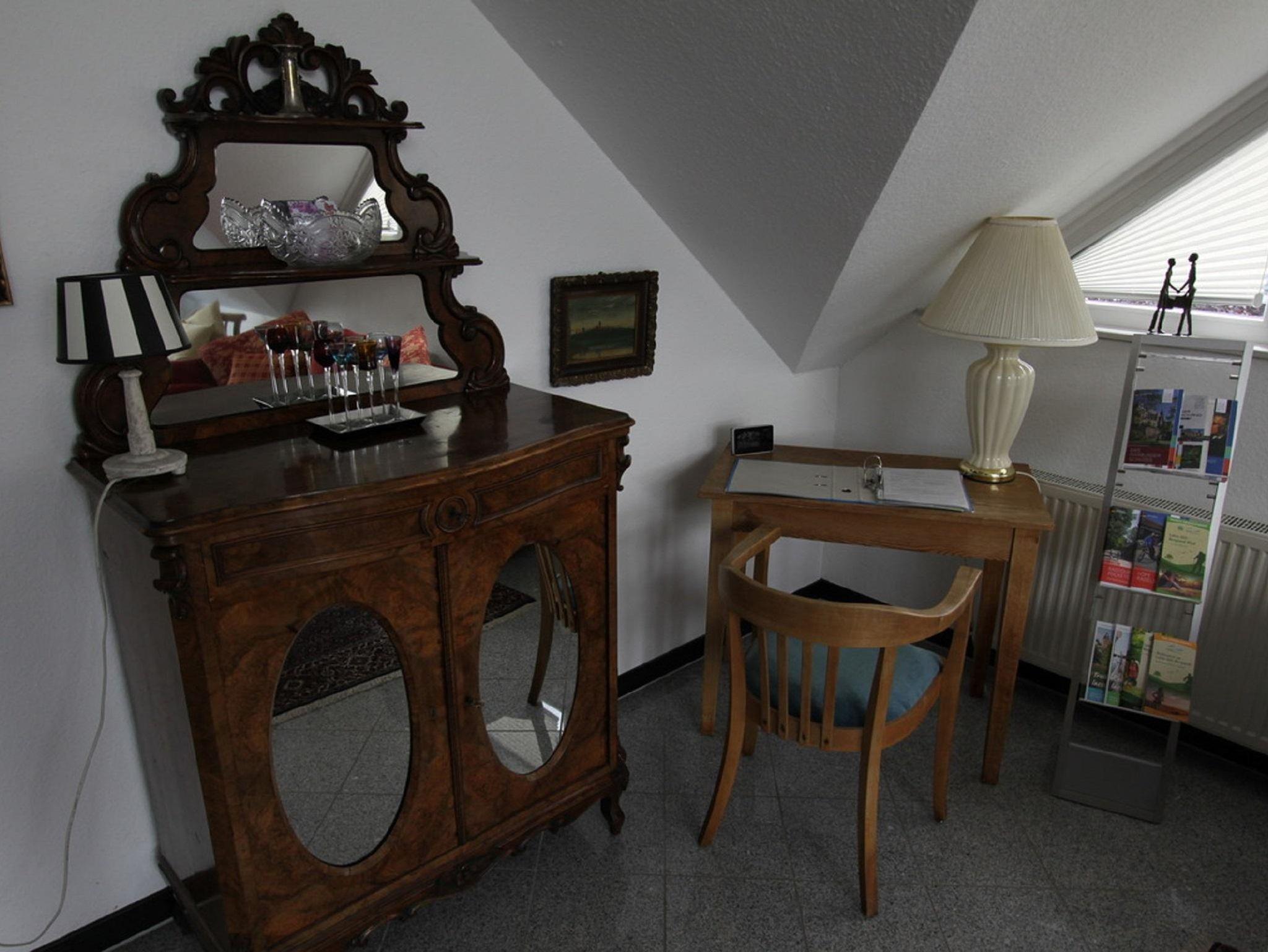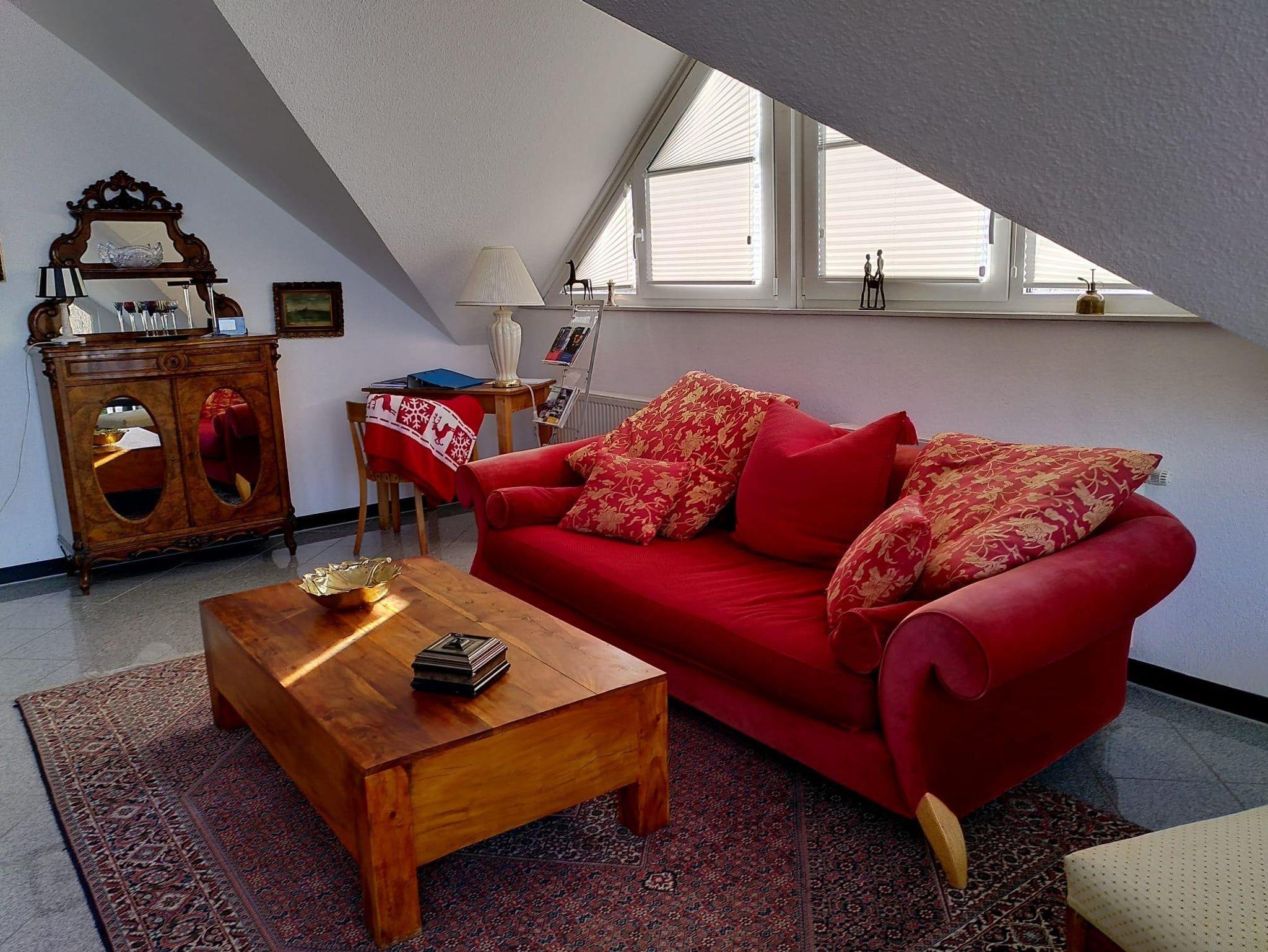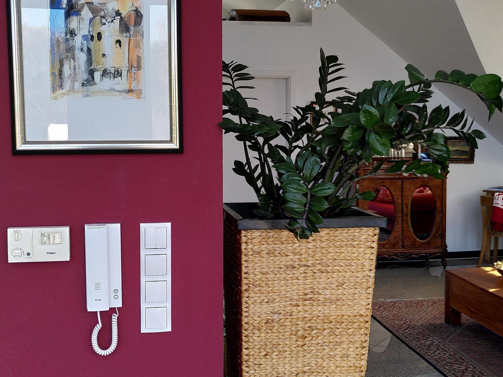 Die Wohnung befindet sich im ersten Stock und ist über eine Außentreppe mit 16 Stufen und die Terrasse erreichbar. Die Wohnräume sind modern eingerichtet und durch antike Einrichtungsgegenstände ergänzt.