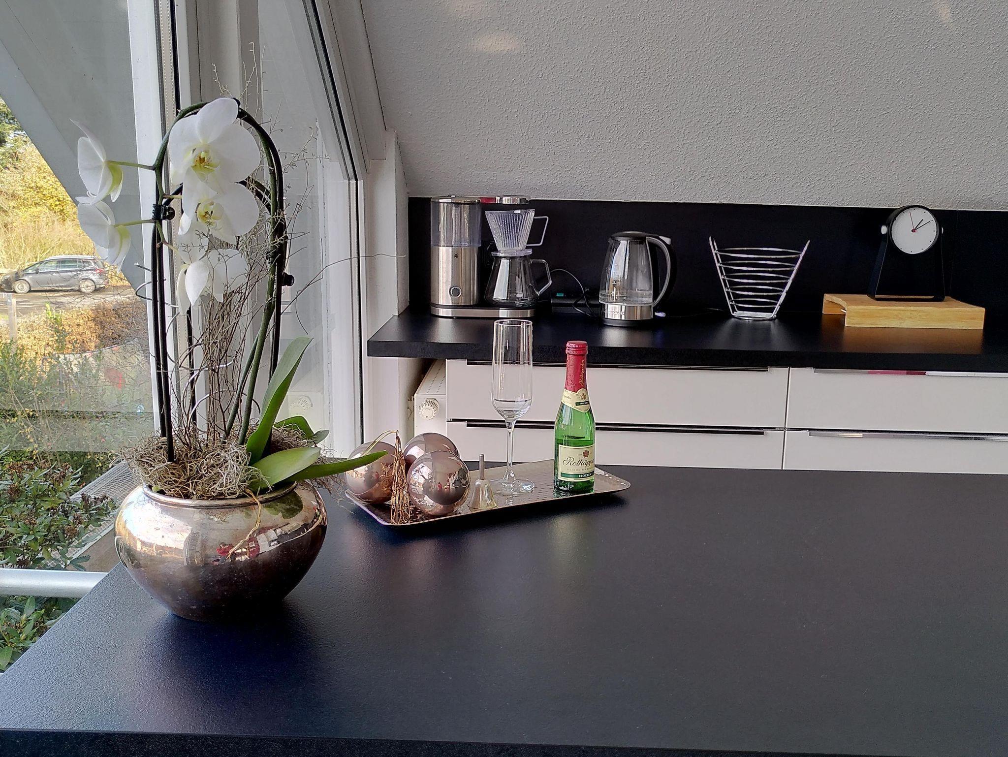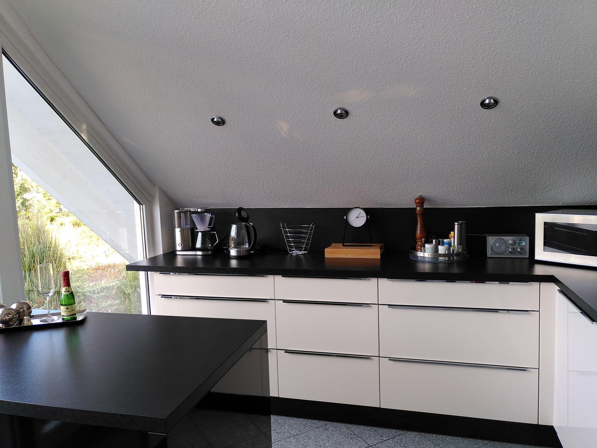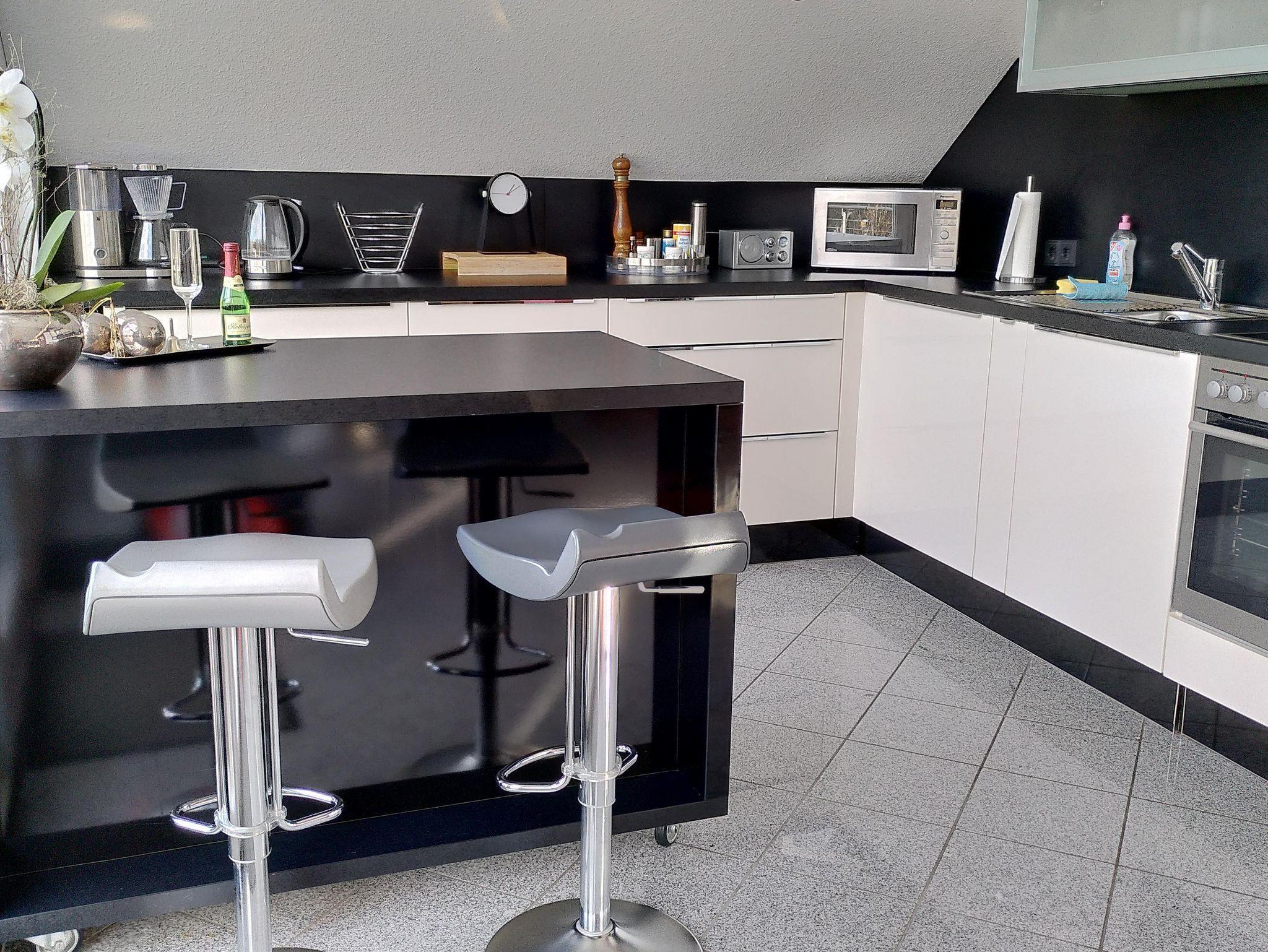 Die Küche ist modern und komplett ausgestattet. Sie ist offen gestaltet und geht in den Essbereich und den Wohnbereich über. Es gibt eine Kaffeemaschine, einen Backofen, eine Mikrowelle, einen Geschirrspüler, einen Kühl-und einen Gefrierschrank.