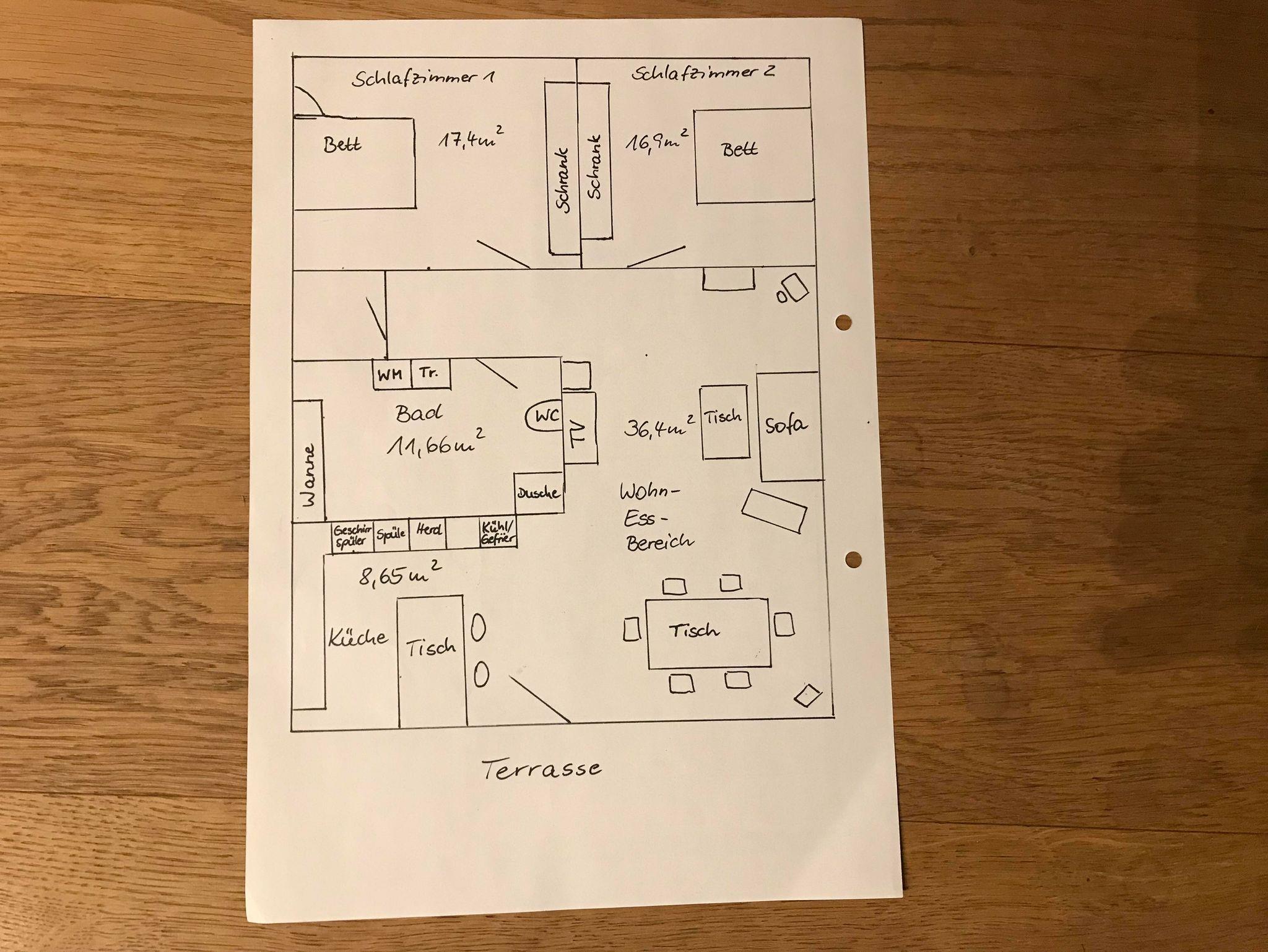 Die Wohnung hat einen separaten Eingang und ist über eine Außentreppe mit 16 Stufen über die Terrasse erreichbar.