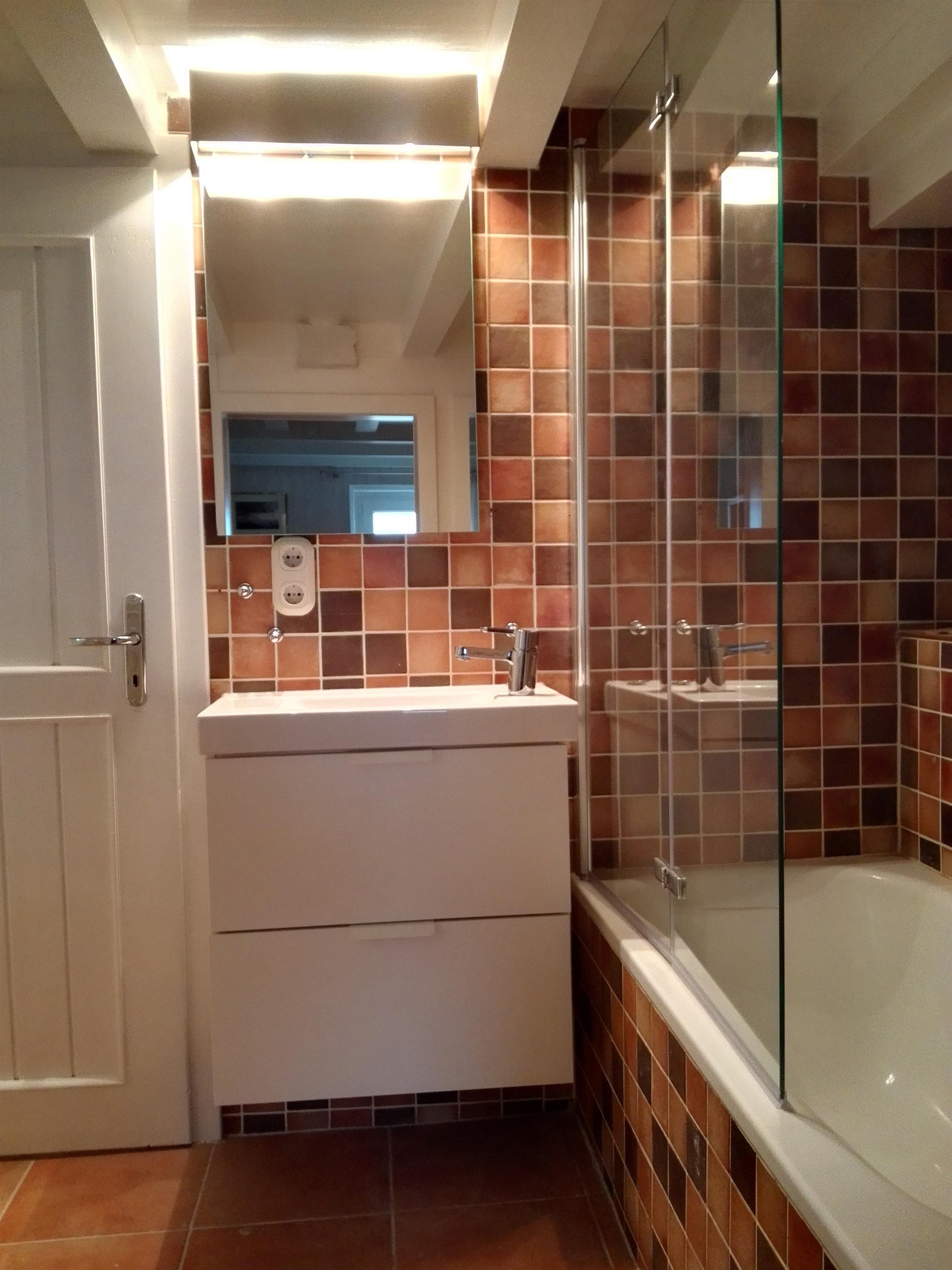 An den Essbereich grenzt ein kleiner Wohn-/Schlafraum mit Doppelbett (1,50 X 2,00 Meter), Beistelltisch und Bücherregal an. Sowohl von dort aus als auch vom Vorflur zugänglich ist ein kleines Bad mit Toilette, Waschtisch (mit Schubladen), Haartrockner, kombinierter Wanne/Duschecke mit Glaswand.