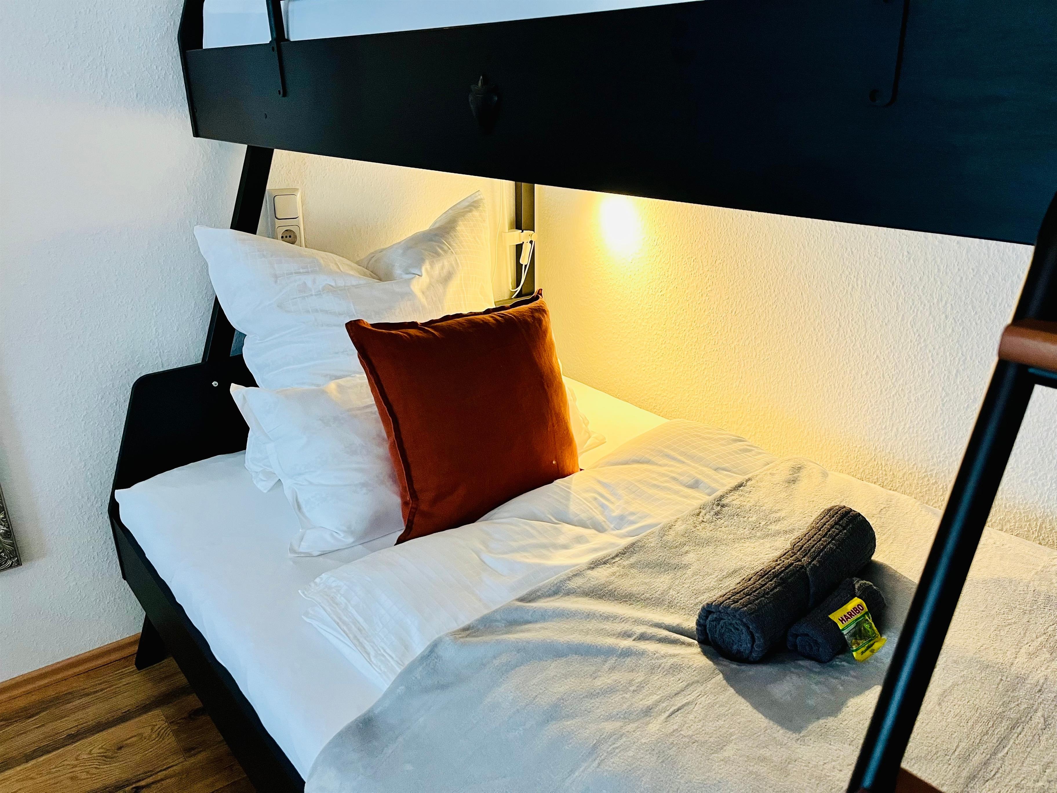 gemütliches Doppelbett im Wohnbereich & zusätzlich einem Hochbett