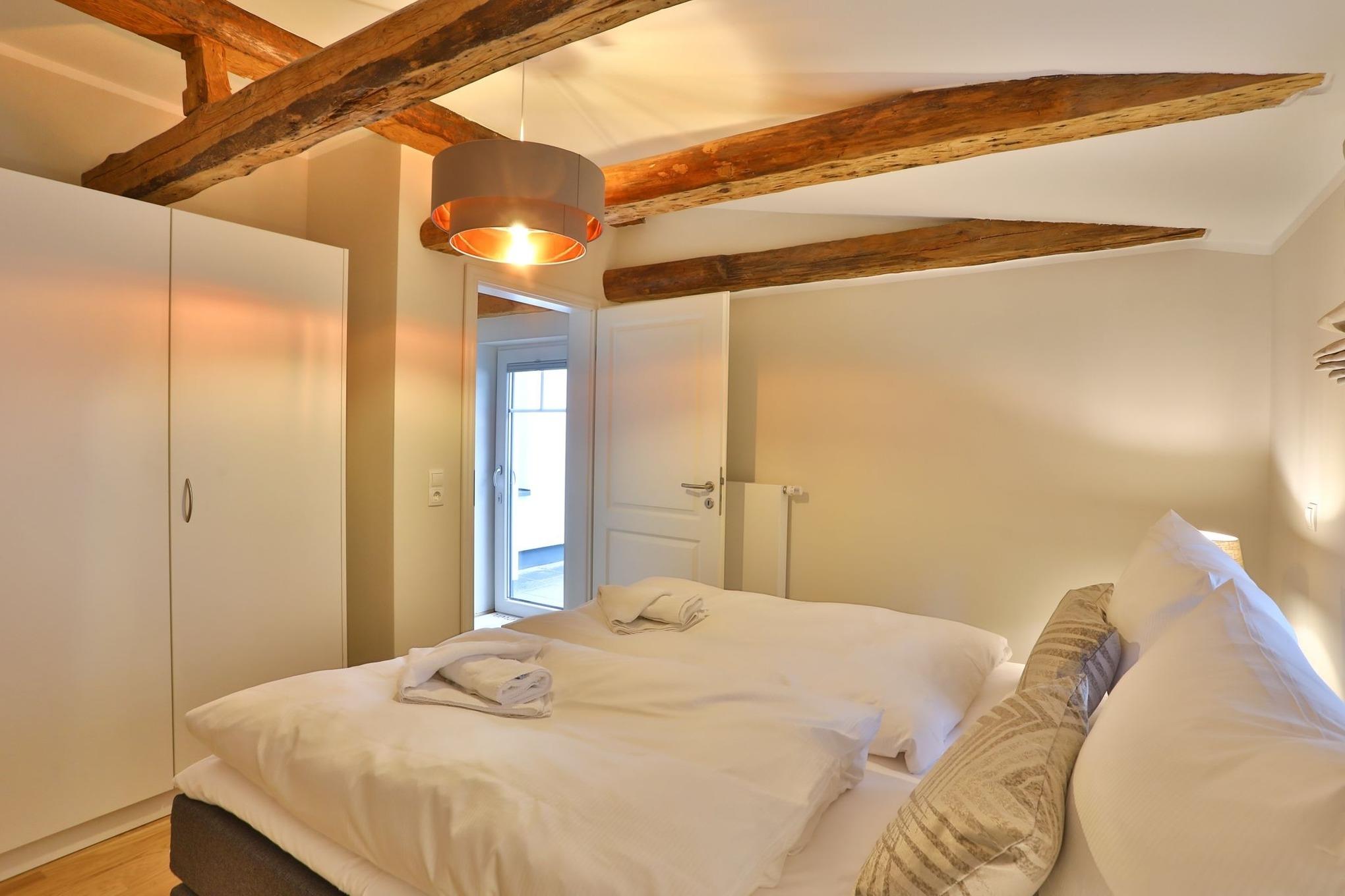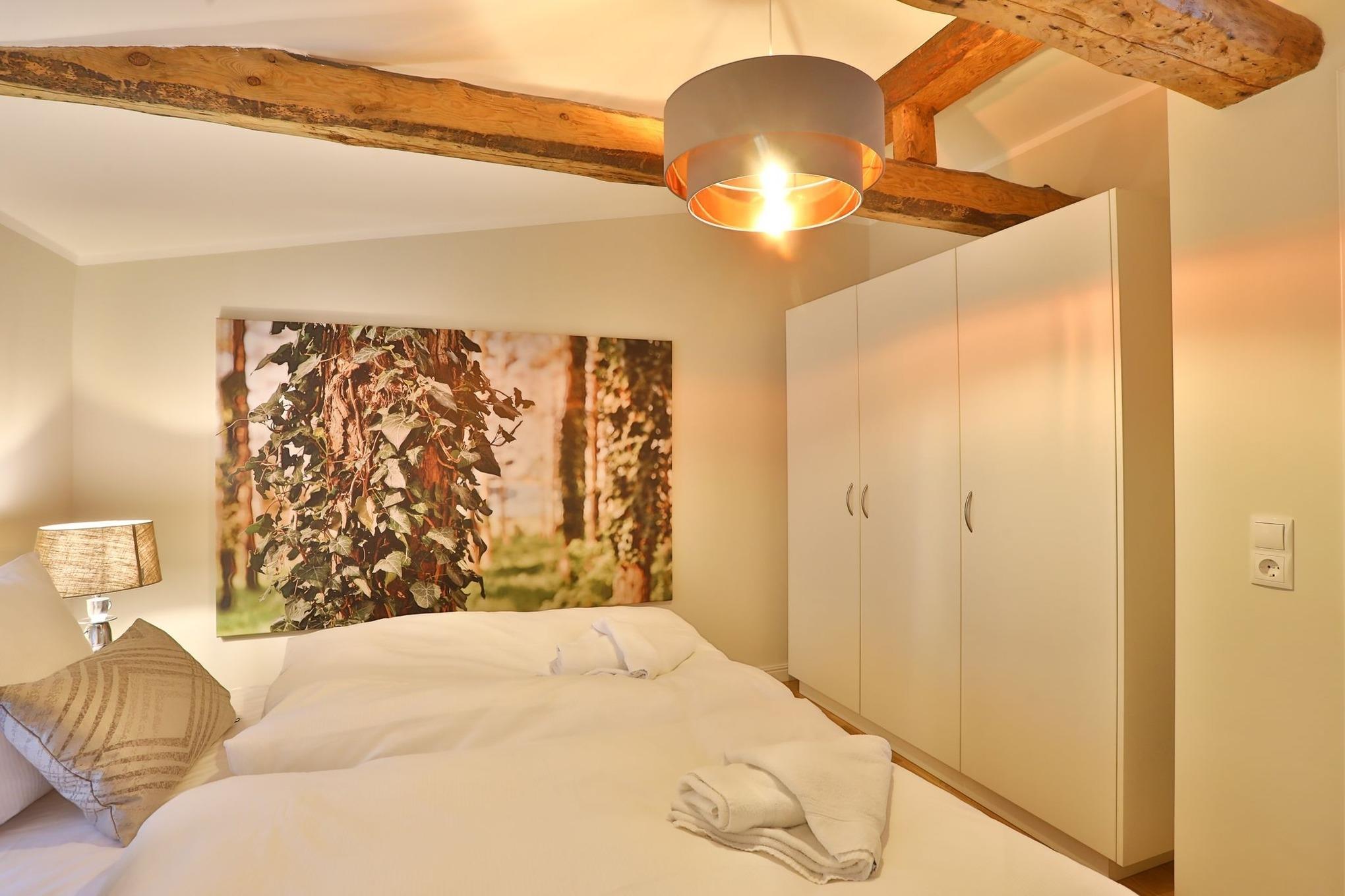 Die Ferienwohnung "Mammutbaum" verfügt über einen offenen, gemütlichen und modernen Wohn- und Essbereich, 2 Schlafzimmer und 1 Badezimmer. Vom Wohn- und Essbereich aus gelangen Sie durch ein großes Fensterschiebeelement auf eine Terrasse, die durch eine Rosenhecke abgegrenzt ist. Ein ganz besonderes Wohlfühlambiente erhält die Ferienwohnung durch die teilweise, alten und sehr gut erhaltene Balkenlage. Ausgestattet mit einem Kaminofen strahlt die Ferienwohnung auch im Herbst und Winter vor allem nach langen und ausgiebigen Spaziergängen eine Wohlfühlatmosphäre aus.