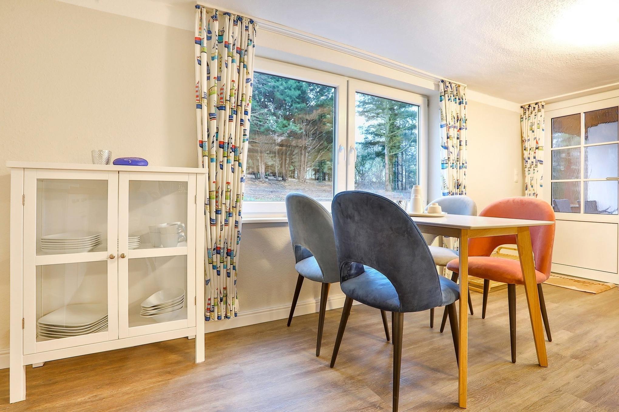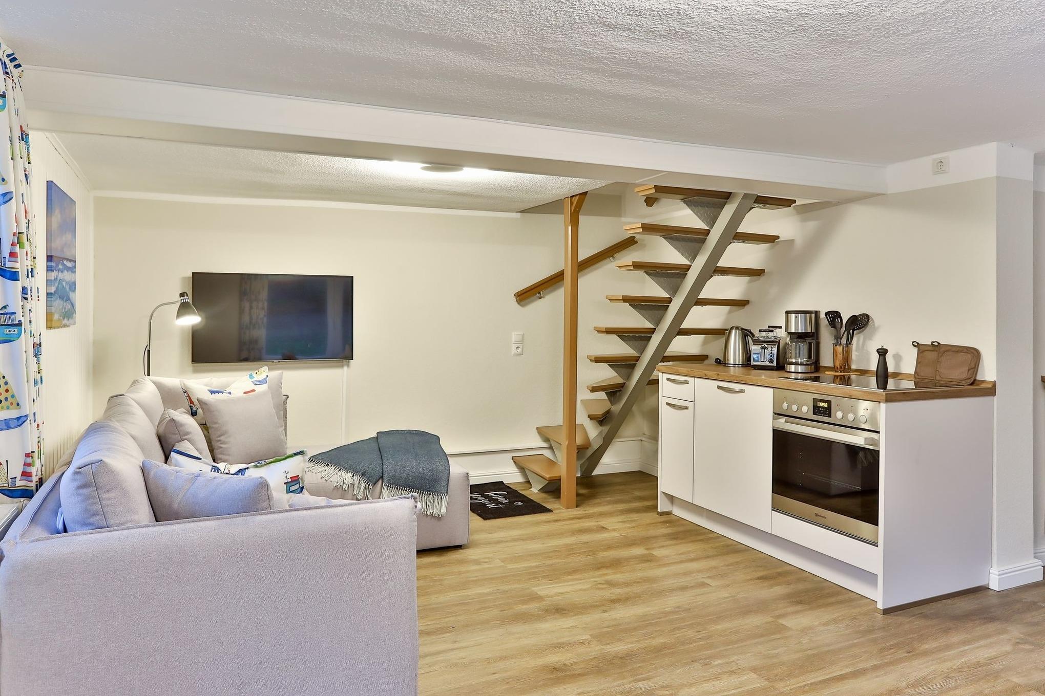 Im Erdgeschoss unseres "Raumwunders Rotbuche" befindet sich ein gemütlicher Wohn- und Essbereich mit einer kleinen Küchenzeile und einem Badezimmer mit WC und Dusche. Im Obergeschoss ist das Reethus mit zwei Schlafzimmern und einem kleinen WC ausgestattet. Vor dem Hauseingang befindet sich eine kleine, überdachte Terrasse. Bitte beachten sie, dass das Reethus eine eingeschränkte Deckenhöhe von 2 m hat.