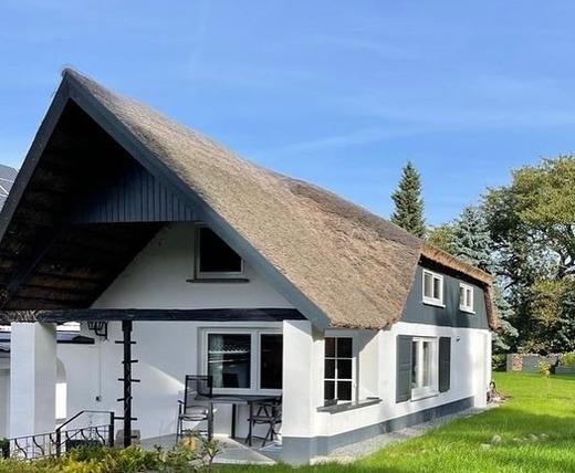 Das kleine Reethus "Rotbuche" befindet sich hinter dem Haupthaus "Wald am Meer" in Mariendorf.