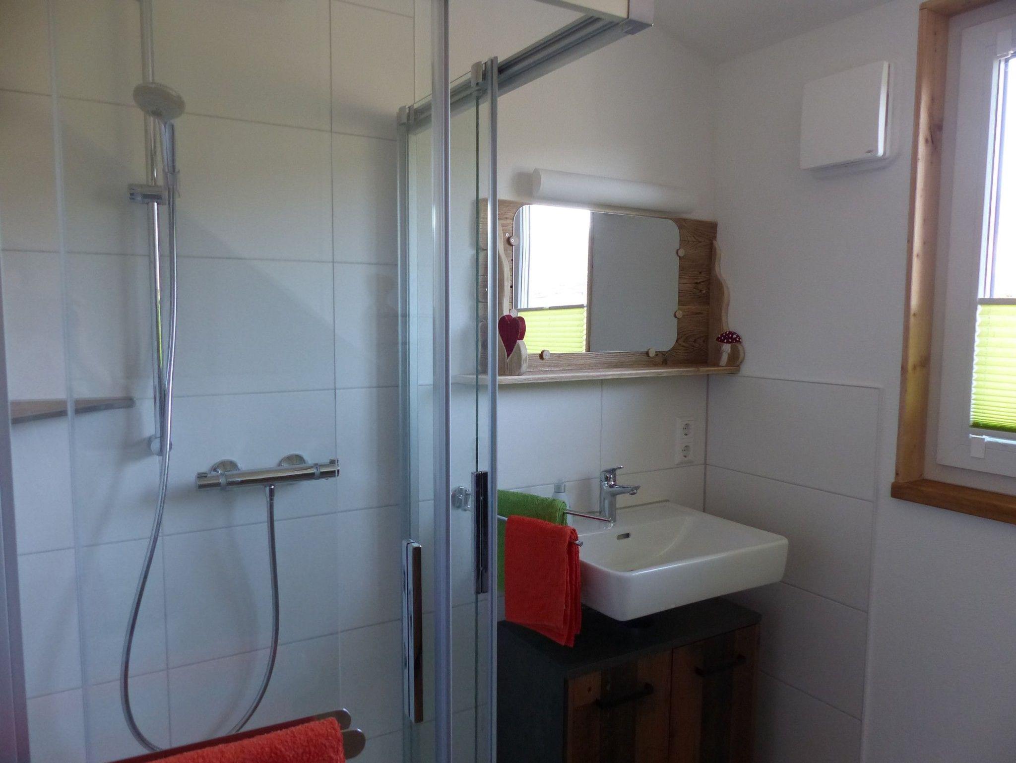 In dem großzügigen Duschbad gibt es genügend Ablagefläche und Stauraum, Handtücher sind inklusive.