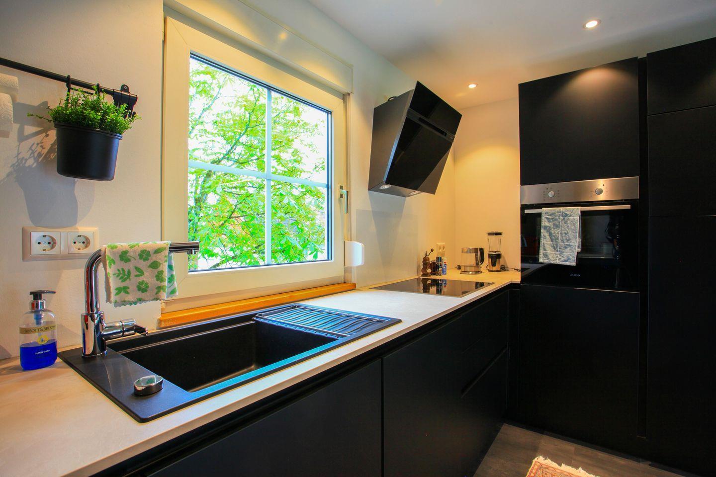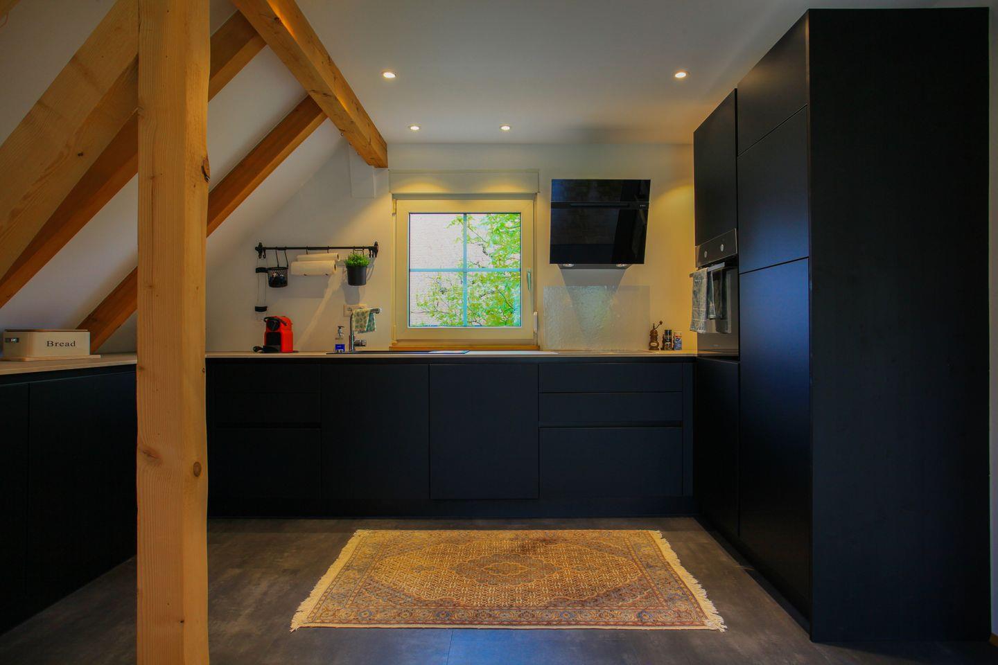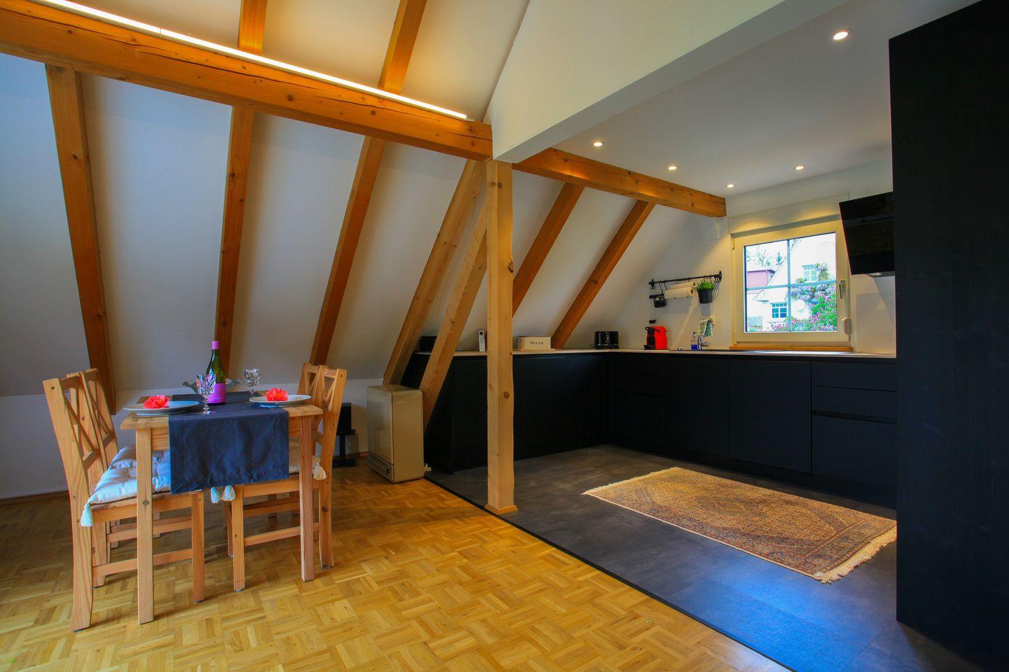 Über eine schöne Holztreppe gelangen Sie in den großzügigen Wohn- und Essbereich im Obergeschoss. Die offene, moderne Küche ist mit hochwertigen Geräten ausgestattet und lädt zum gemeinsamen Kochen ein. Der angrenzende Wohnbereich mit bodentiefen Fenstern sorgt für viel Licht und bietet einen herrlichen Blick ins Grüne. Die sichtbaren Holzbalken und der stilvolle Parkettboden verleihen dem Raum eine besonders gemütliche Atmosphäre.