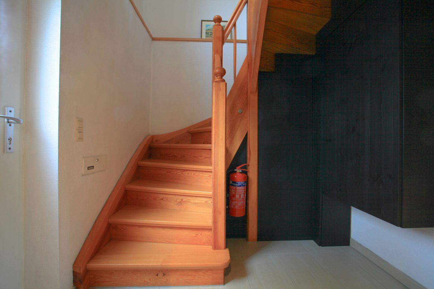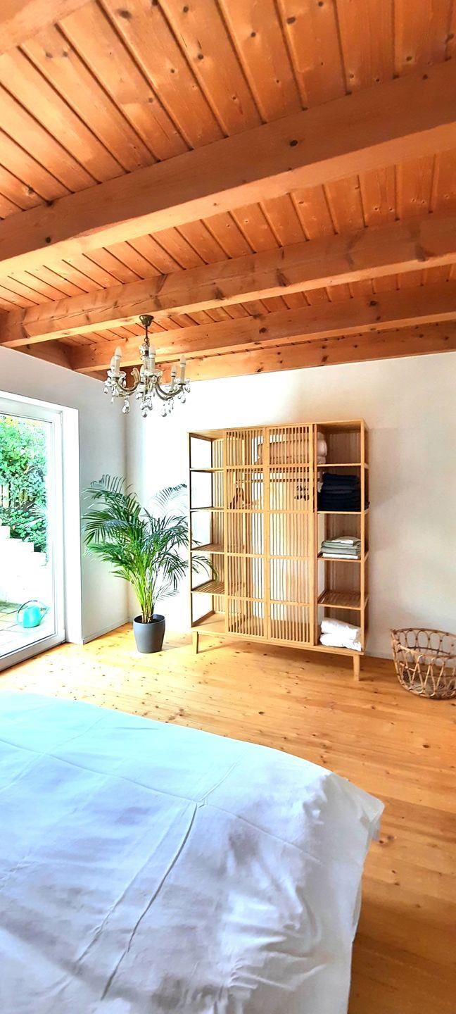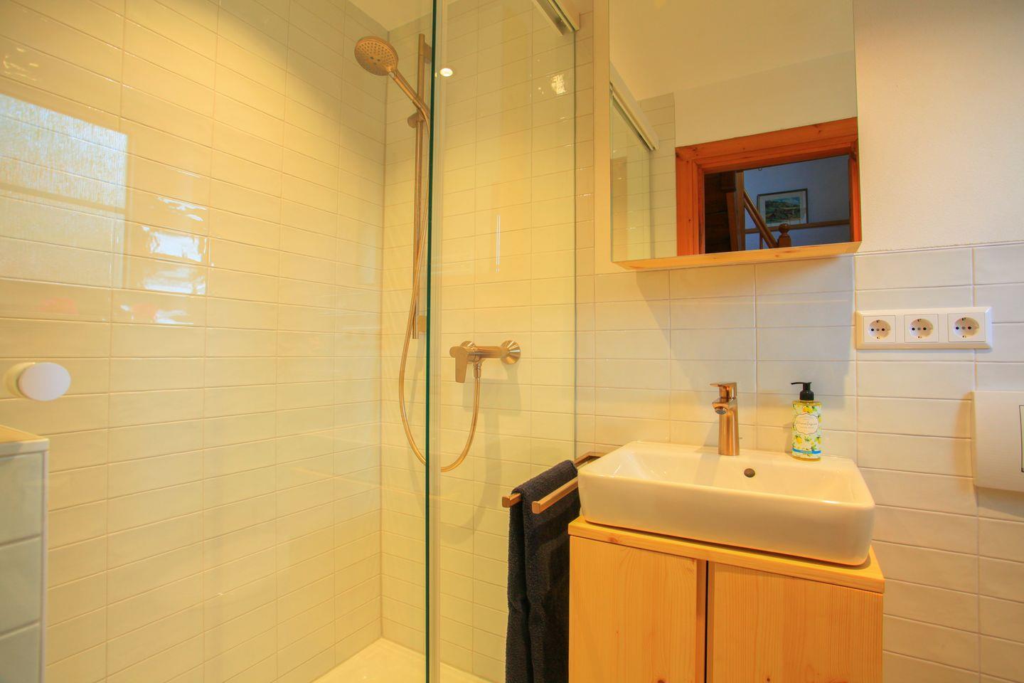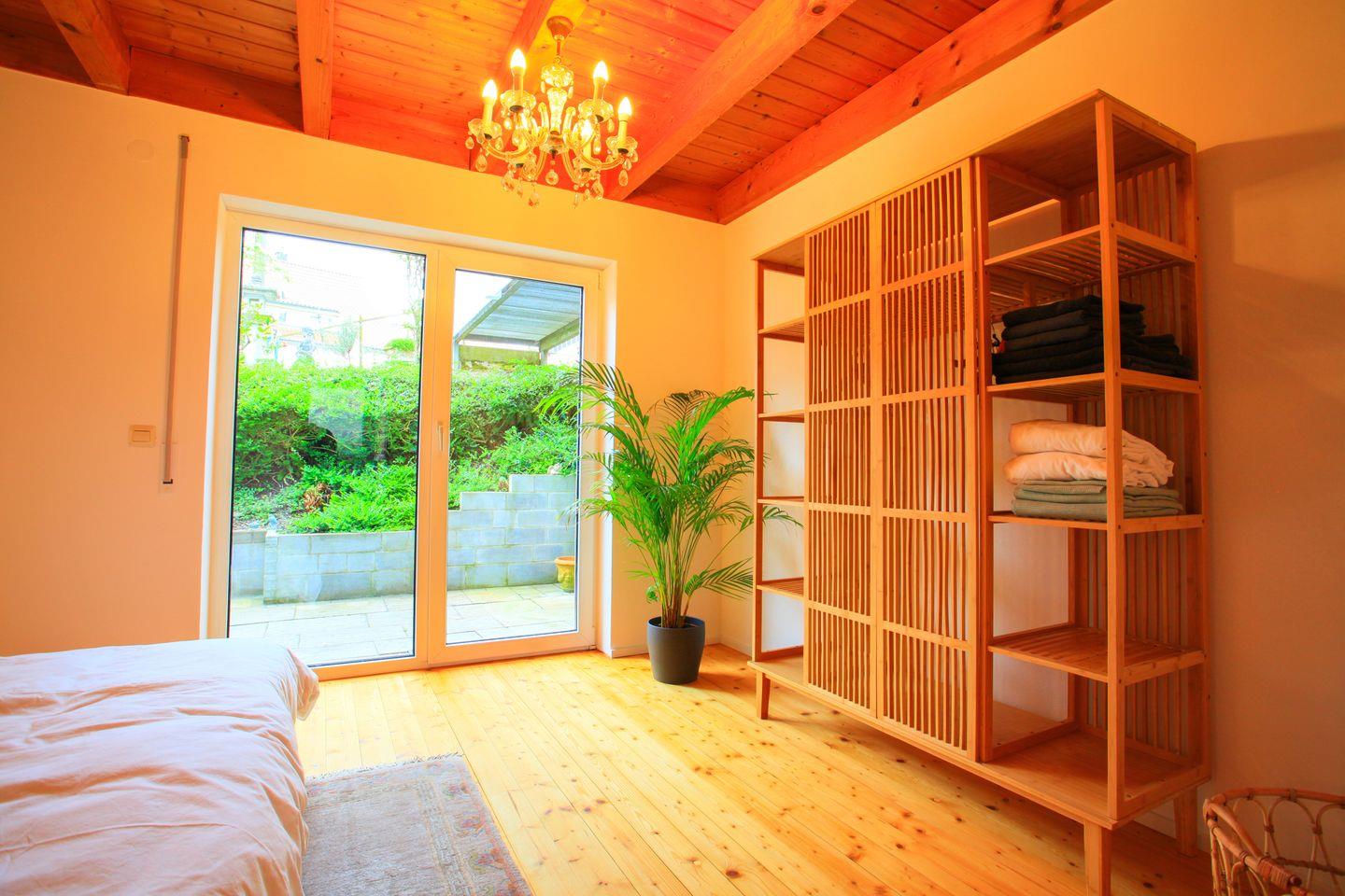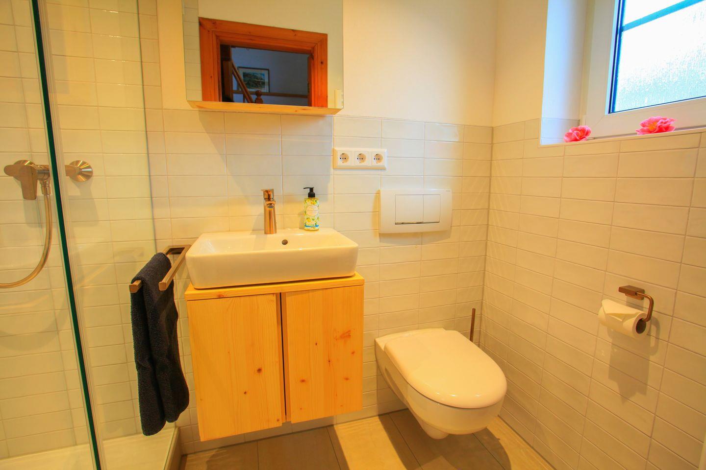 Im Erdgeschoss erwartet Sie ein helles Schlafzimmer mit direktem Zugang zur privaten Terrasse, auf der Sie Ihr Frühstück inmitten der Natur genießen können. Zudem befindet sich hier das moderne Badezimmer mit Dusche, WC und Waschbecken.