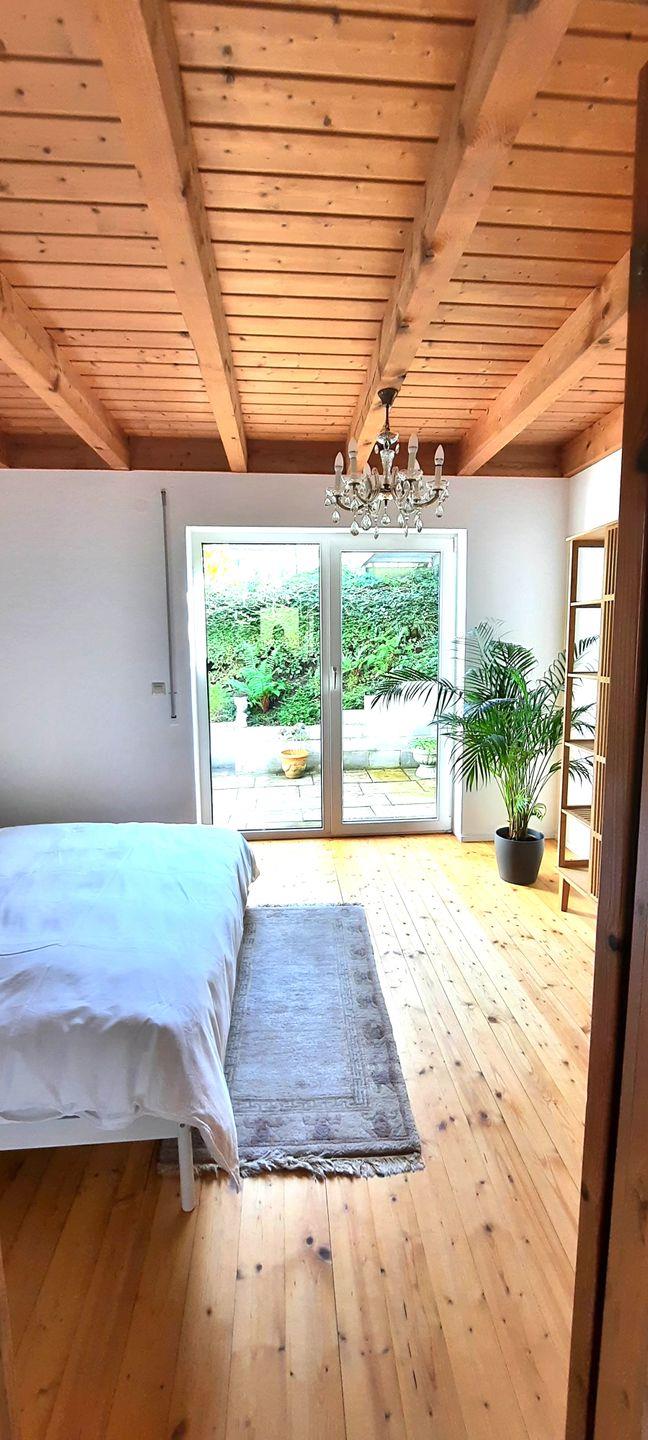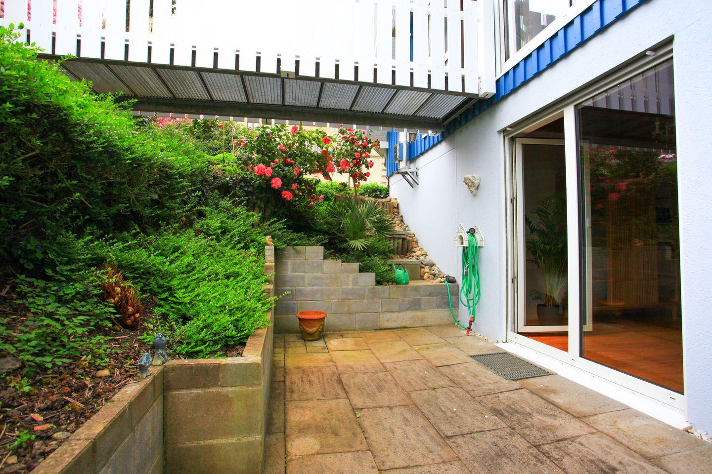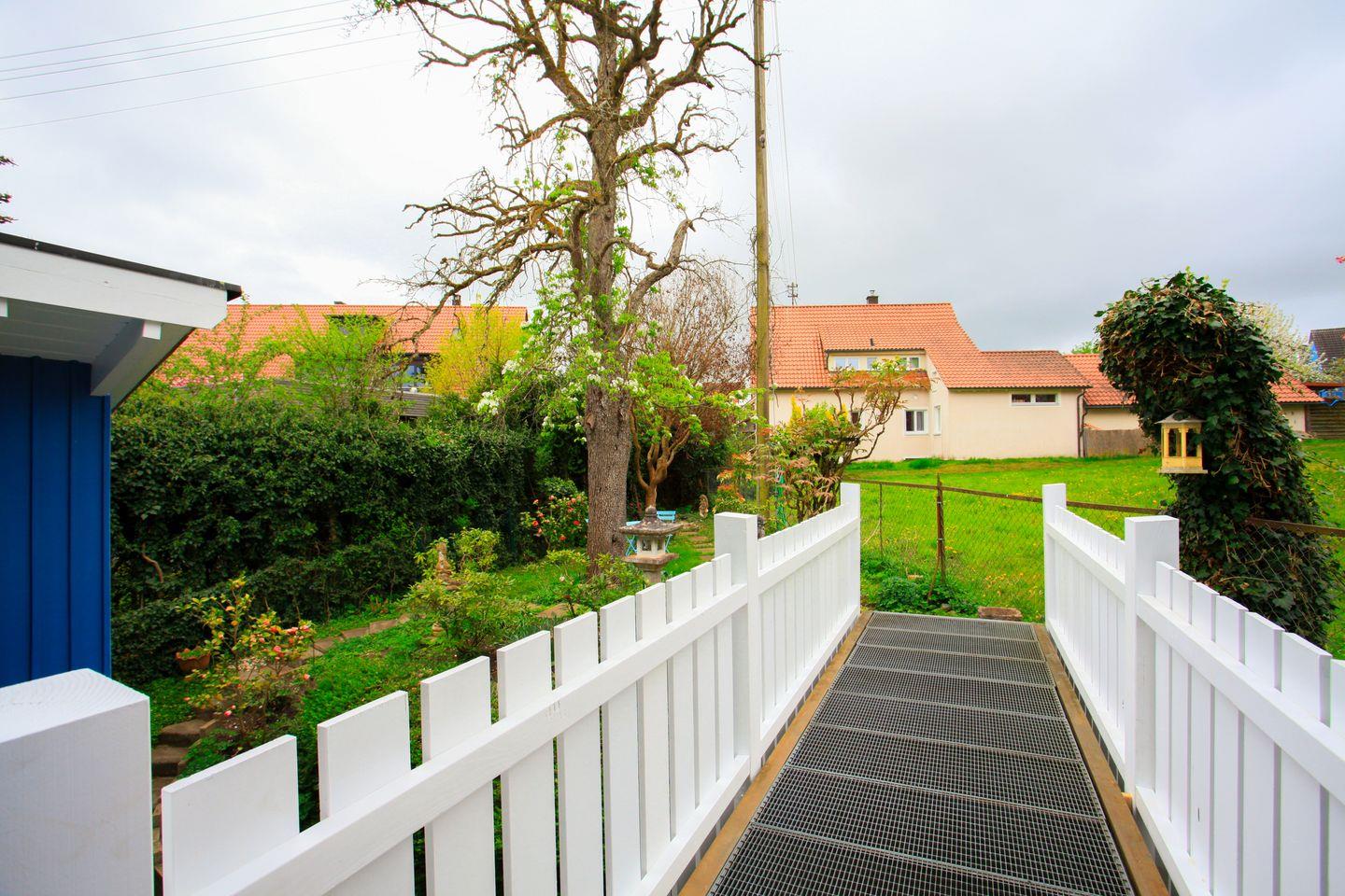 Ein besonderes Highlight ist der Zugang über einen kleinen Steg in den idyllischen Garten. Umgeben von Blumen und viel Grün können Sie hier entspannen und die Seele baumeln lassen.