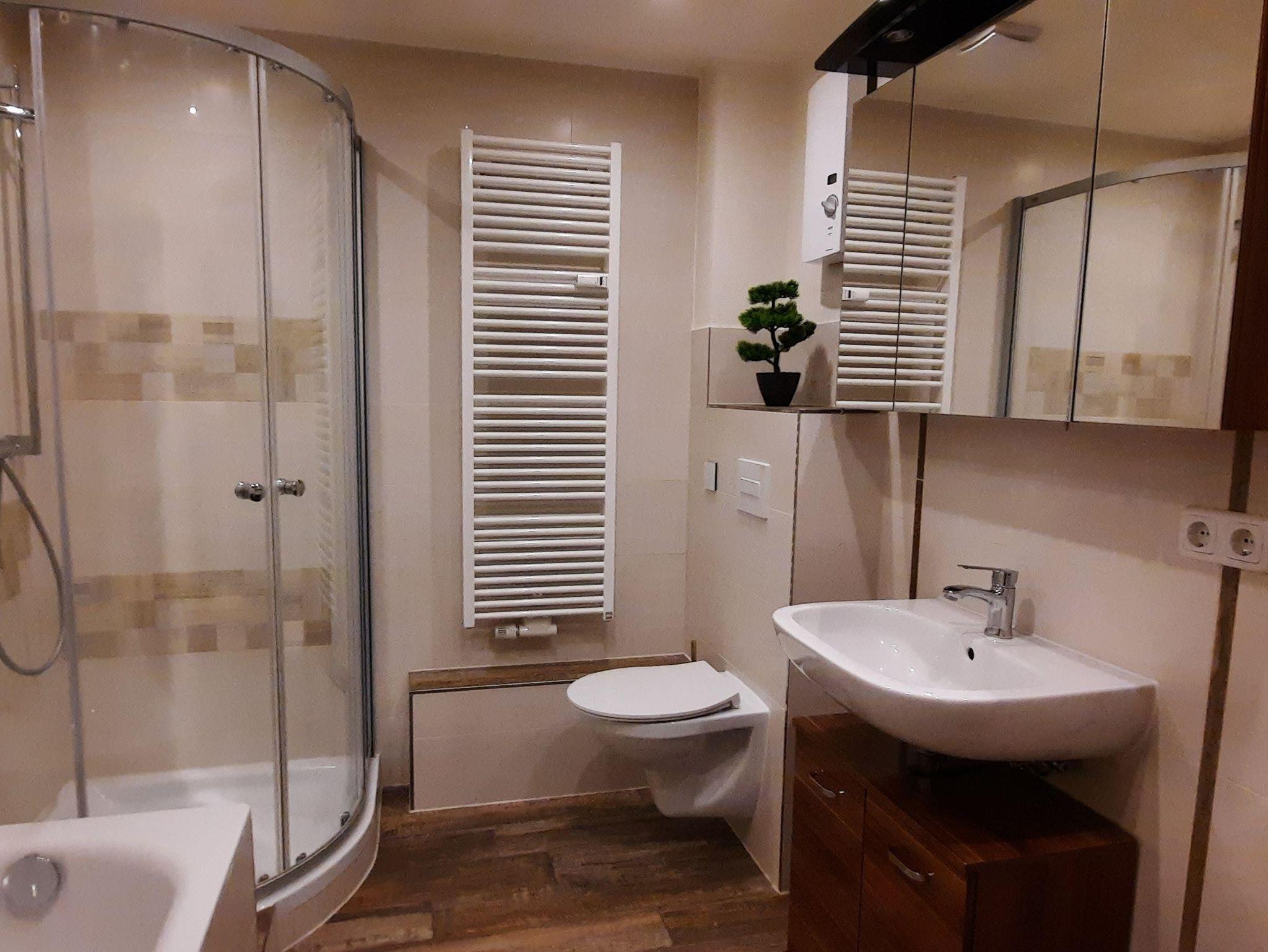 Bad mit Echtglasdusche, Badewanne, Föhn, Radio und Spiegelschrank