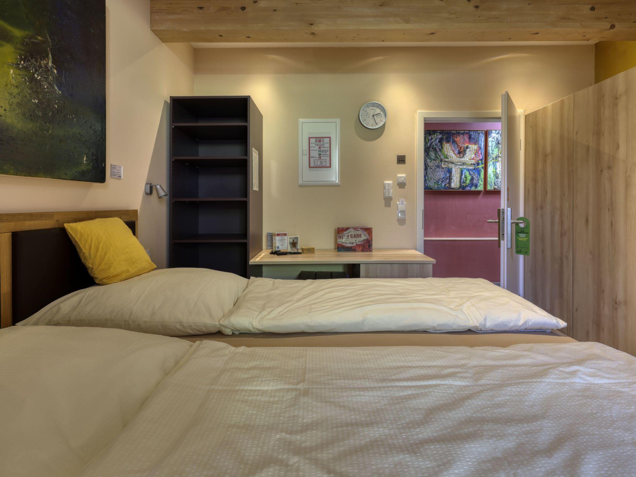 In the cosy bedroom, you can lie comfortably on a solid box-spring double bed under cosy down duvets; in the evening you can enjoy the heavenly peace and quiet in the idyllic courtyard. As in the entire house, underfloor heating is also installed here, which emits heat evenly and pleasantly. The windows and door to the inner courtyard are stylishly screened by sun-yellow blinds, while the parquet flooring makes the rooms pleasant to walk on and easy to clean, as do the bright and friendly wet area and the spacious wardrobe room with desk and seating area.