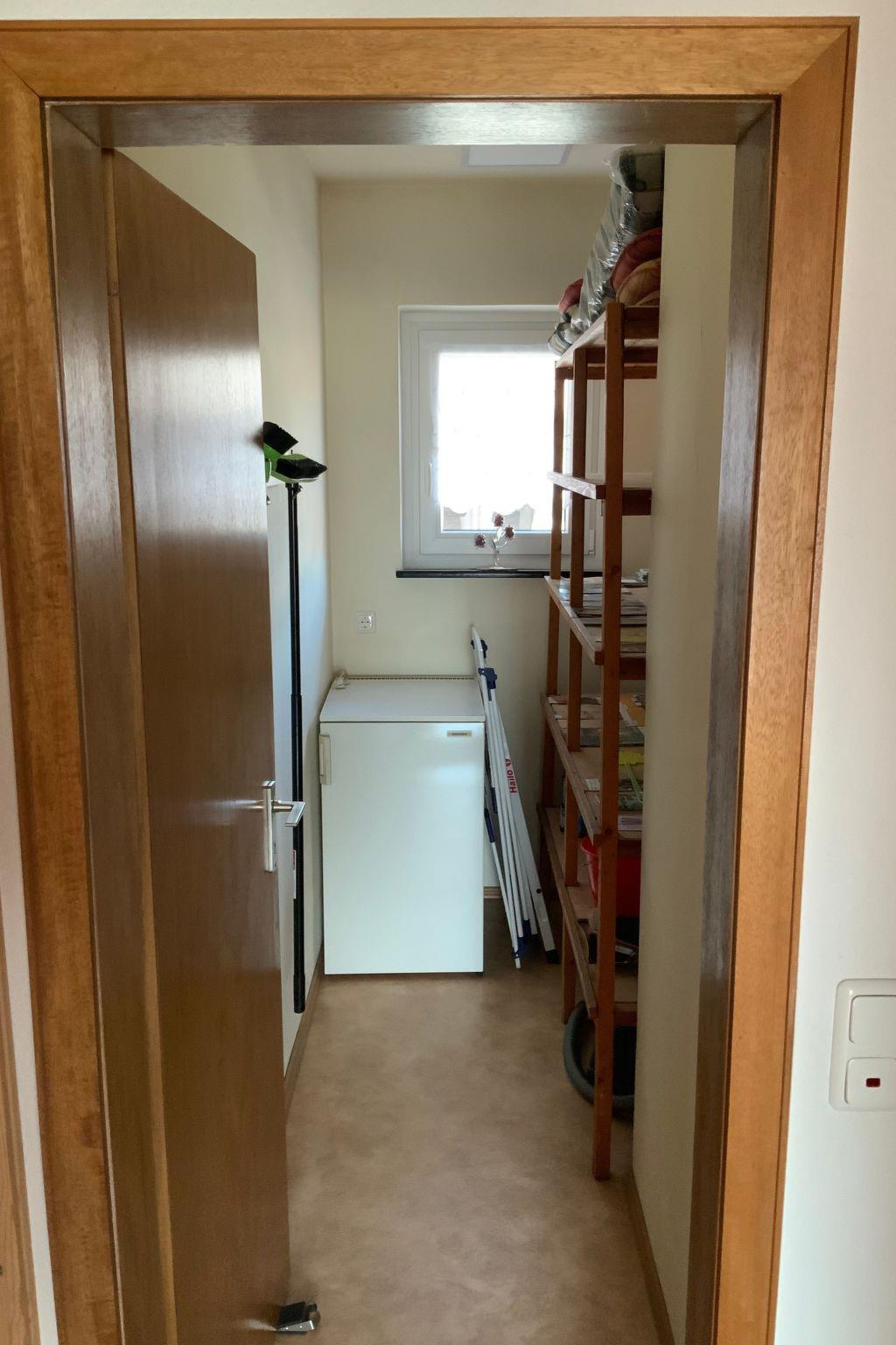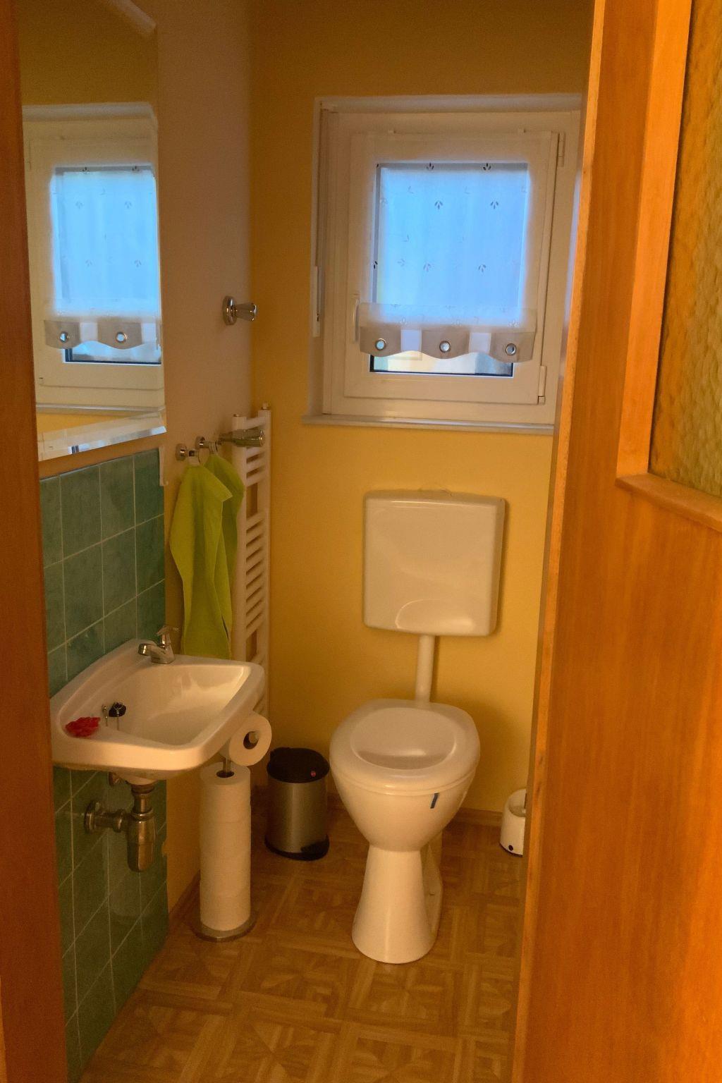 The well-maintained holiday apartment of around 70m² is on the first floor of the house and consists of the following rooms: a living and dining room with a flatscreen TV, a video recorder, a stereo system, a sofa and a dining space. Next to it there is a bedroom with a double bed (200 x 200cm) and adjustable slatted frames for a good night’s sleep. On the other side of the living room there is an adjoining spacious kitchen with a stove, oven, microwave, automatic coffee machine and additional dining corner. A pantry provides additional storage space for groceries. There is a bench in the hallway for changing shoes. On the west side of the entrance there are the separate toilet, the bathroom with a bath and shower and the second bedroom with a single bed (90 x 200cm) and a sofa. The bathroom was renovated in 2017. All the rooms have a normal room height and windows, including the bathroom and WC. There is central heating. At the turn of the year 2019, the living / dining area was renovated and the double bedroom modernized.