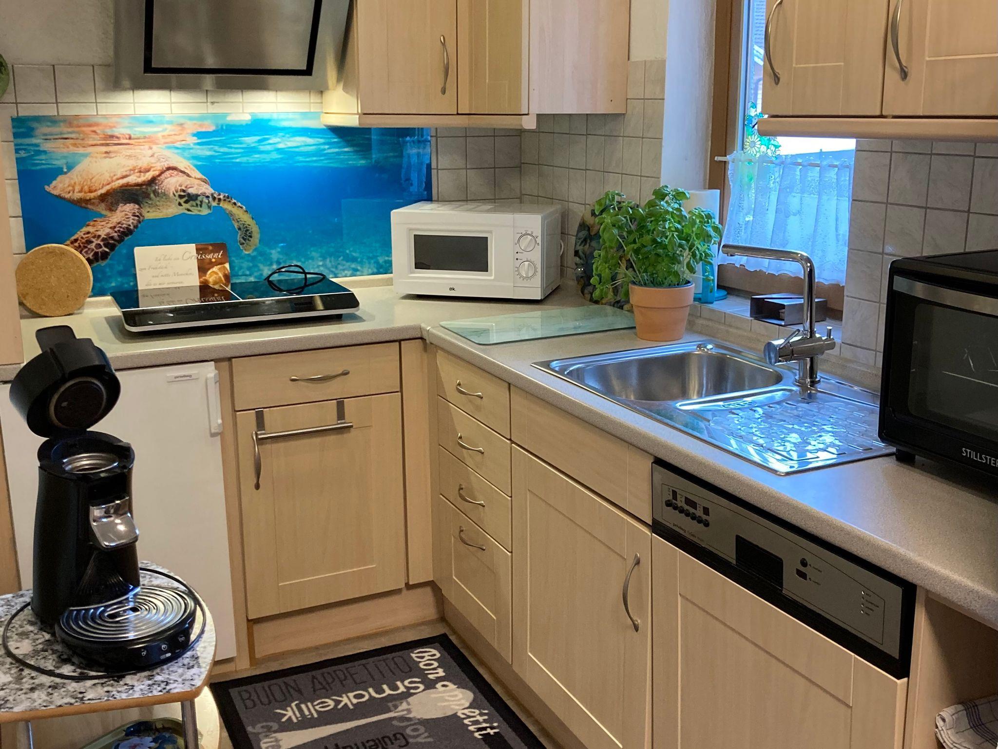 Die Küchenzeile ist ausgestattet mit Spülmaschine, Kühlschrank/Gefrierfach, Microwelle, Kaffeepadmaschine, Toaster, Wasserkocher, Induktionsplatten und Backofen, LED-Fernseher mit SAT-TV, Radio/CD, Fön.