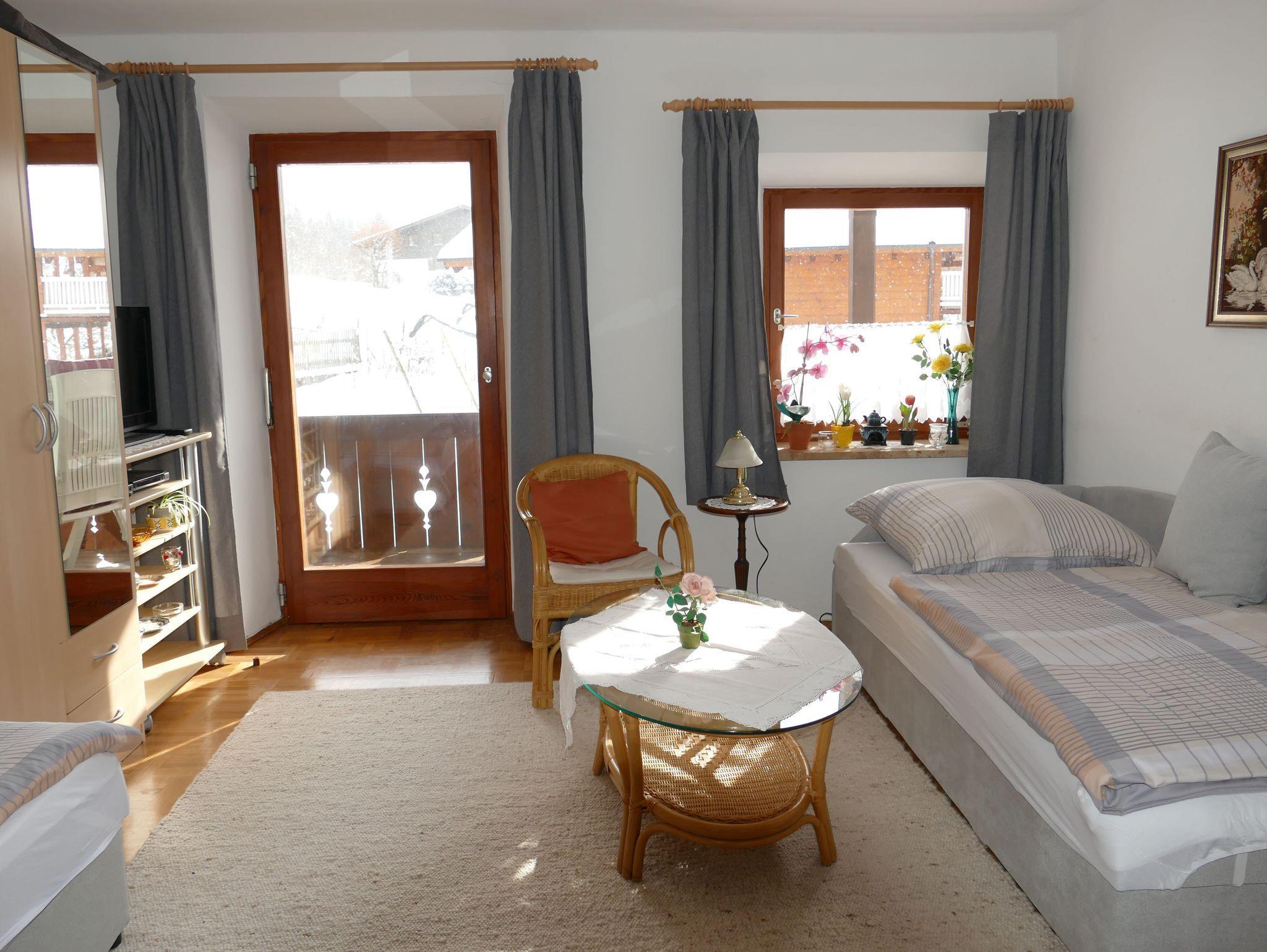Das kleine Appartement wunderschön gelegen, verfügt über ein Wohnschlafzimmer mit südseitigen überdachten Balkon (Ausblick auf Wiese und zu den Chiemgauer Alpen, einer kleinen Küche und Badezimmer. Ideal für 1 bis 2 Personen. Die Betten stehen wegen der Obtik auseinander, eines rechts an der Wand, das andere links. Können aber auch zusammengestellt werden.