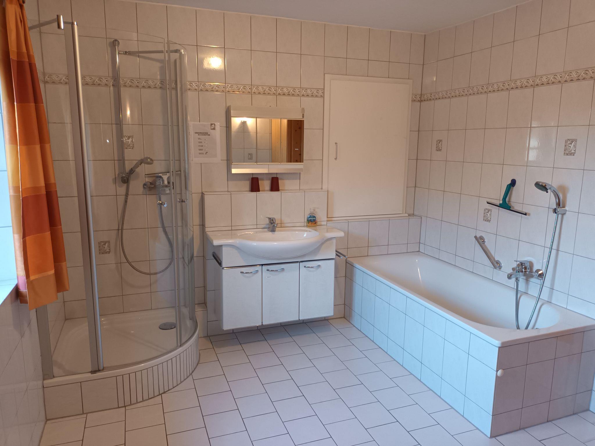 Das separate Schlafzimmer (Doppelbett 2m Länge) ist mit Wildeiche-Vollholzmöbeln ausgestattet, sowie einem Holzboden und einer Mückengittertür. Im großem Badezimmer befindet sich ein separates WC.
