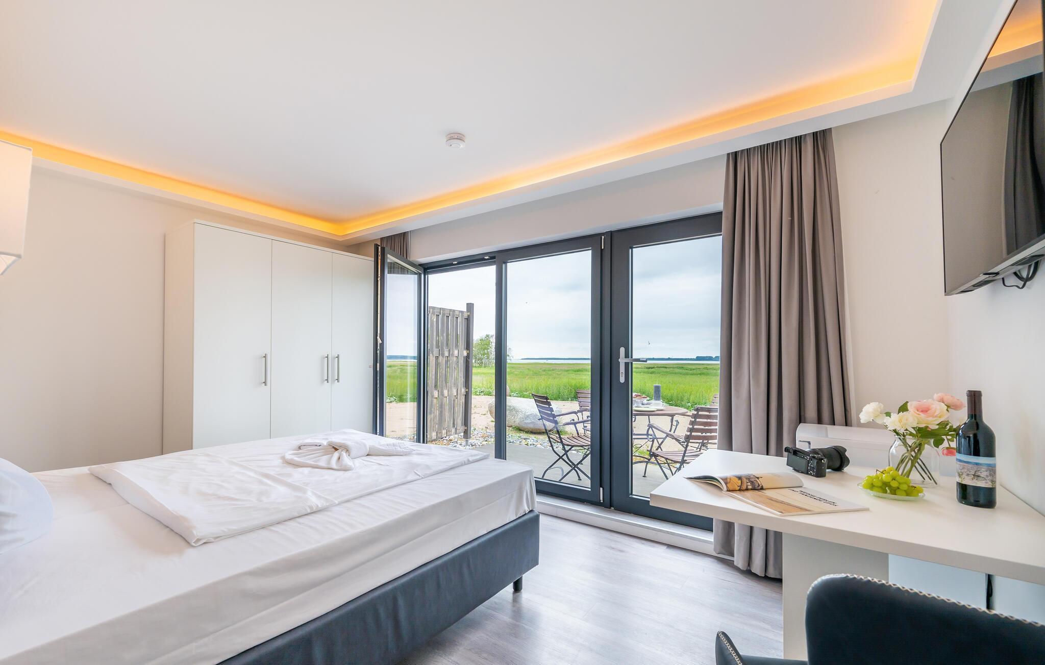 Leiligheten ligger rett ved siden av naturreservatet, bak sivet og litt over vannflaten i havnen, og har flott utsikt over Boddenlandskapet. Haus Boddenblick har et soverom med dobbeltseng og en stue med sovesofa. Begge rommene har en uteterrasse med hagemøbler. Det er en kjøkkenkrok mellom de to rommene, som også gir tilgang til badet. Badet er utstyrt med en stor dusj, en liten badstue, servant og toalett. Kjøkkenet har kjøleskap, komfyr med to kokeplater, kaffemaskin, vannkoker, brødrister og mikrobølgeovn. Aircondition sørger for et behagelig klima.