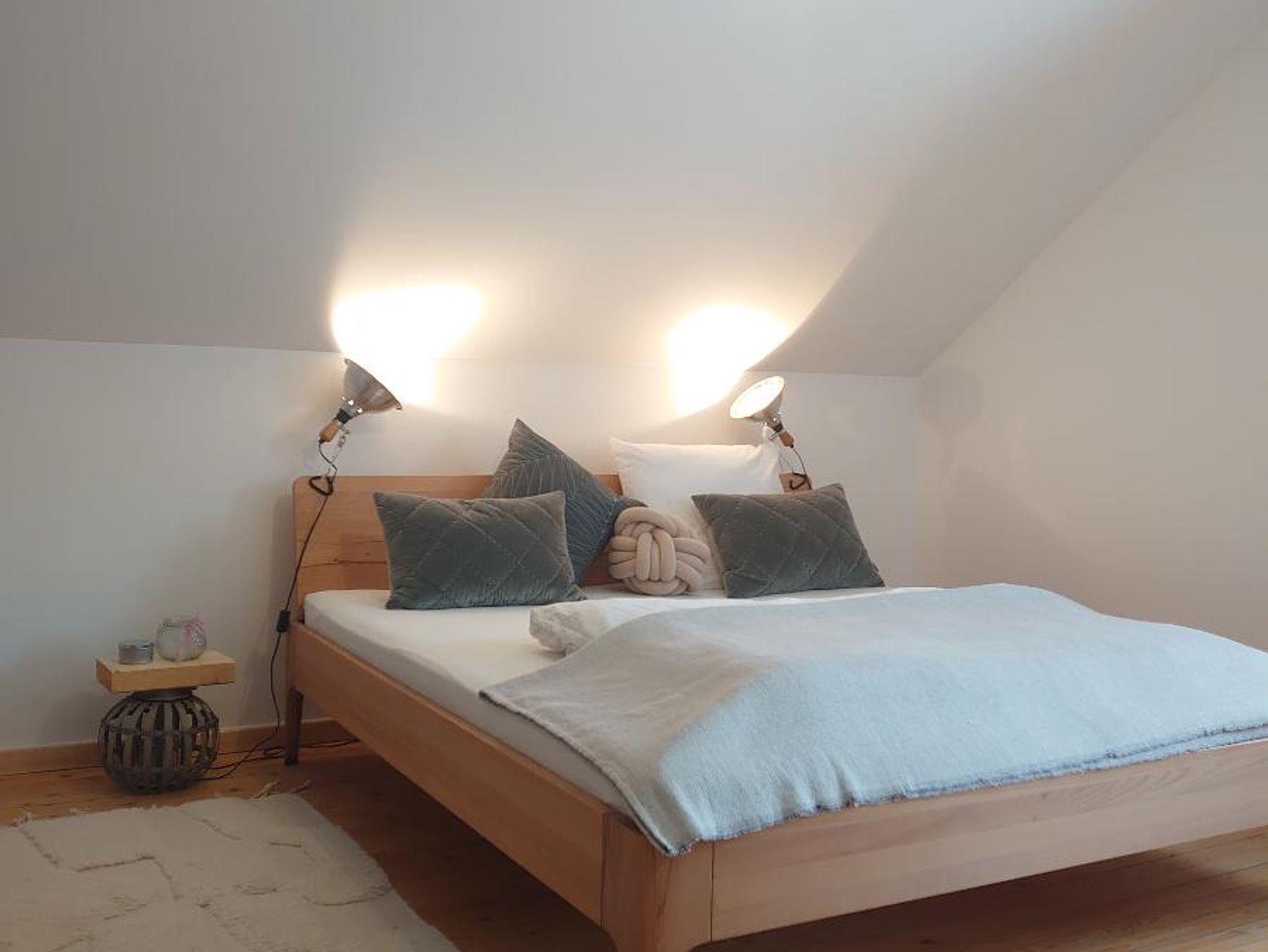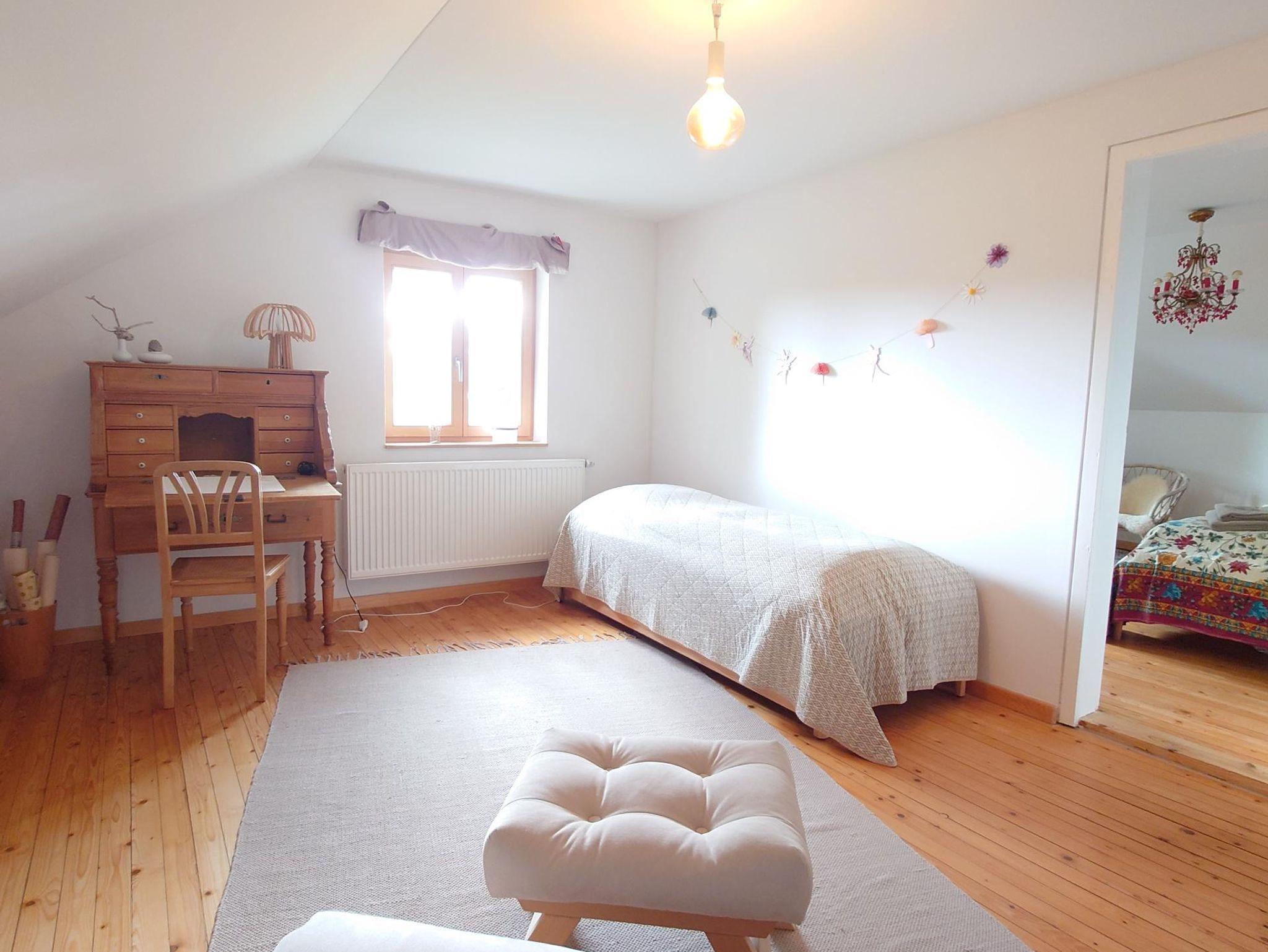 Es stehen hier zwei große, gemütliche Schlafzimmer (Rote Blumenwiese als Paarzimmer eingerichtet und eine Grüne Blumenwiese, mit 1,80m breiten Wildbuch-Doppelbetten) zur Verfügung. Ein weiteres Zimmer (Durchgangszimmer zur Roten Blumenwiese) befindet sich im ersten Stock, das als Bibliothek und Arbeitszimmer genutzt wird. Ein japanischer Futon-Sessel kann hier zum Schlafen ausgezogen werden. Am antiken Sekretär in der Bibliothek kann man in Ruhe arbeiten und sich dabei mit einem Blick in die alten Buchen vor dem Haus mit frischer Energie auftanken. Das Bücherregal ist gefüllt mit vielen Schätzen (Klassische Literatur, Architektur, Kunst, Psychologie, Ernährung, Natur, Meditation), das den Geist inspiriert und auf neue Pfade führt.