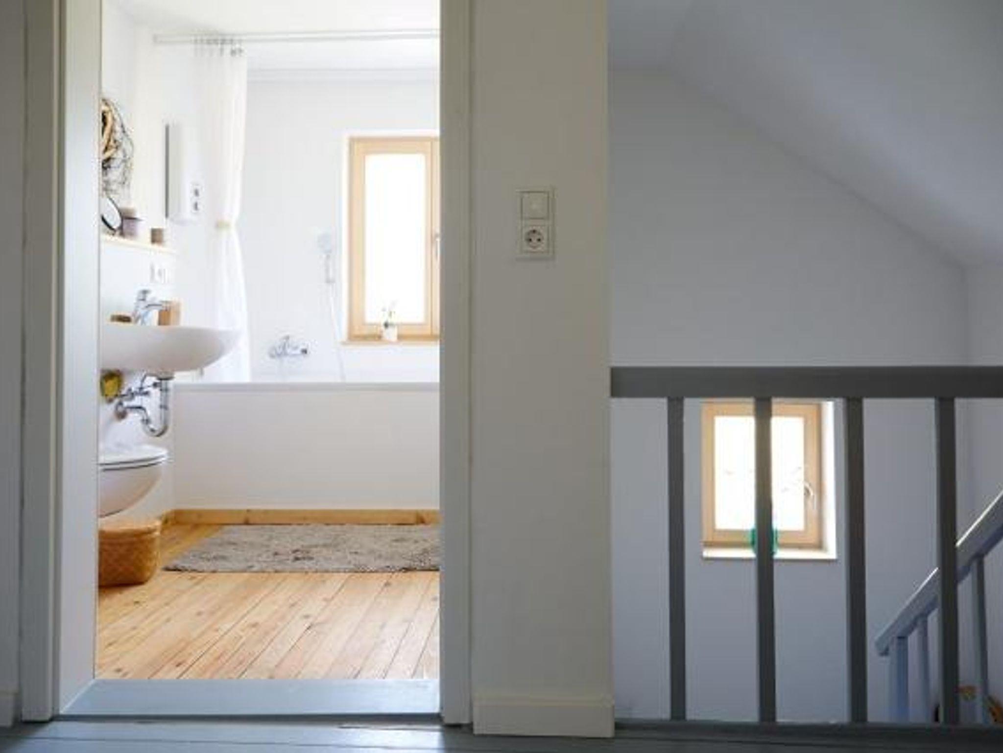 Im Obergeschoß befindet sich zudem ein wunderschönes Bad mit Badewanne, ein besonderer Ort zum Entspannen dank eines weiten, freien Blicks in die benachbarten Wiesen.