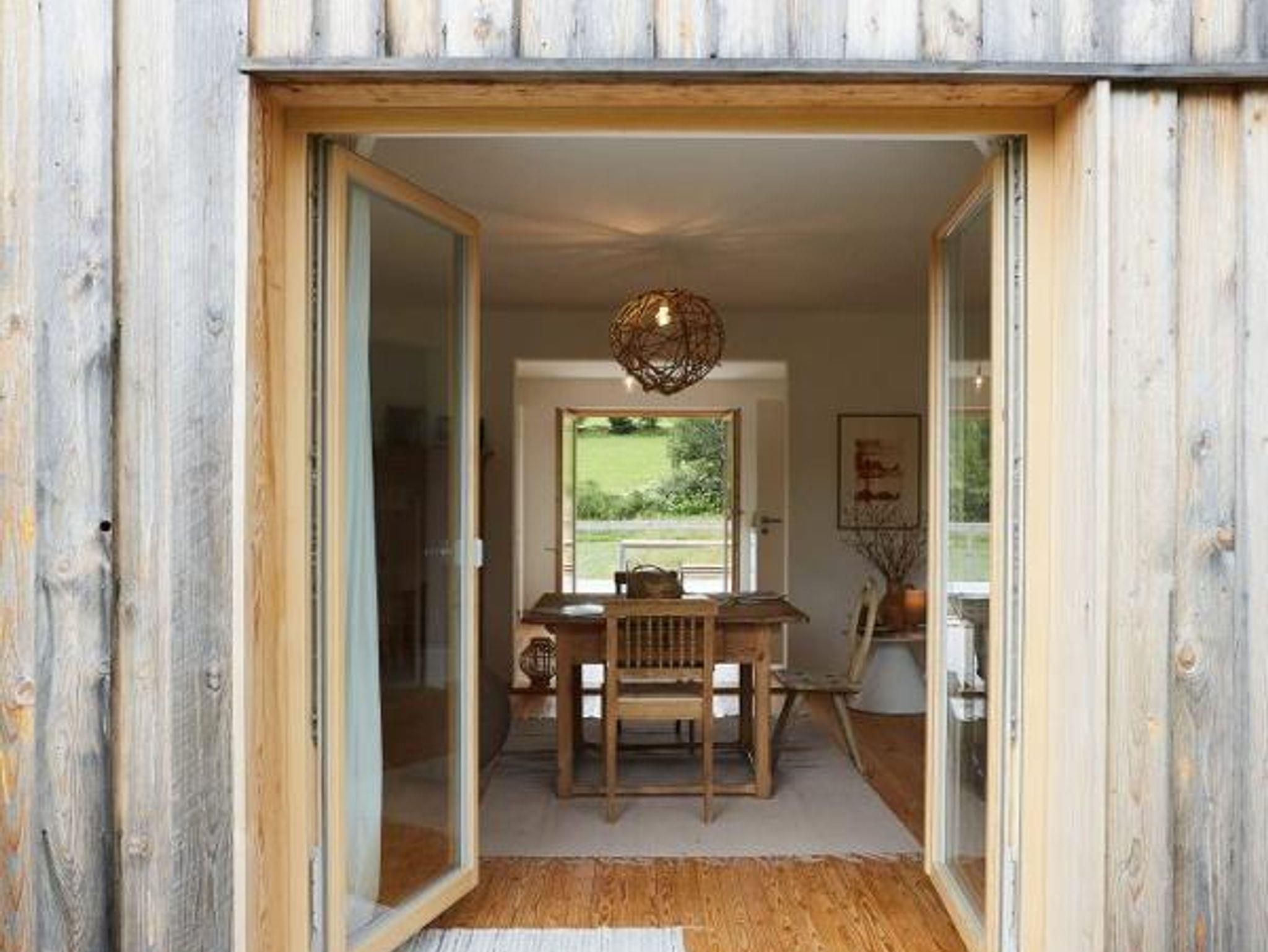 Die Natur begleitet jeden Gast hier im Haus: die Blicke aus den großen Holzfenstern sind wie Gemälde und man schaut auf große Buchen hinaus in die wogenden Wiesen. Lucia, die Hausbirke, bewacht das Haus, sanft und biegsam wiegt sie sich im Wind.